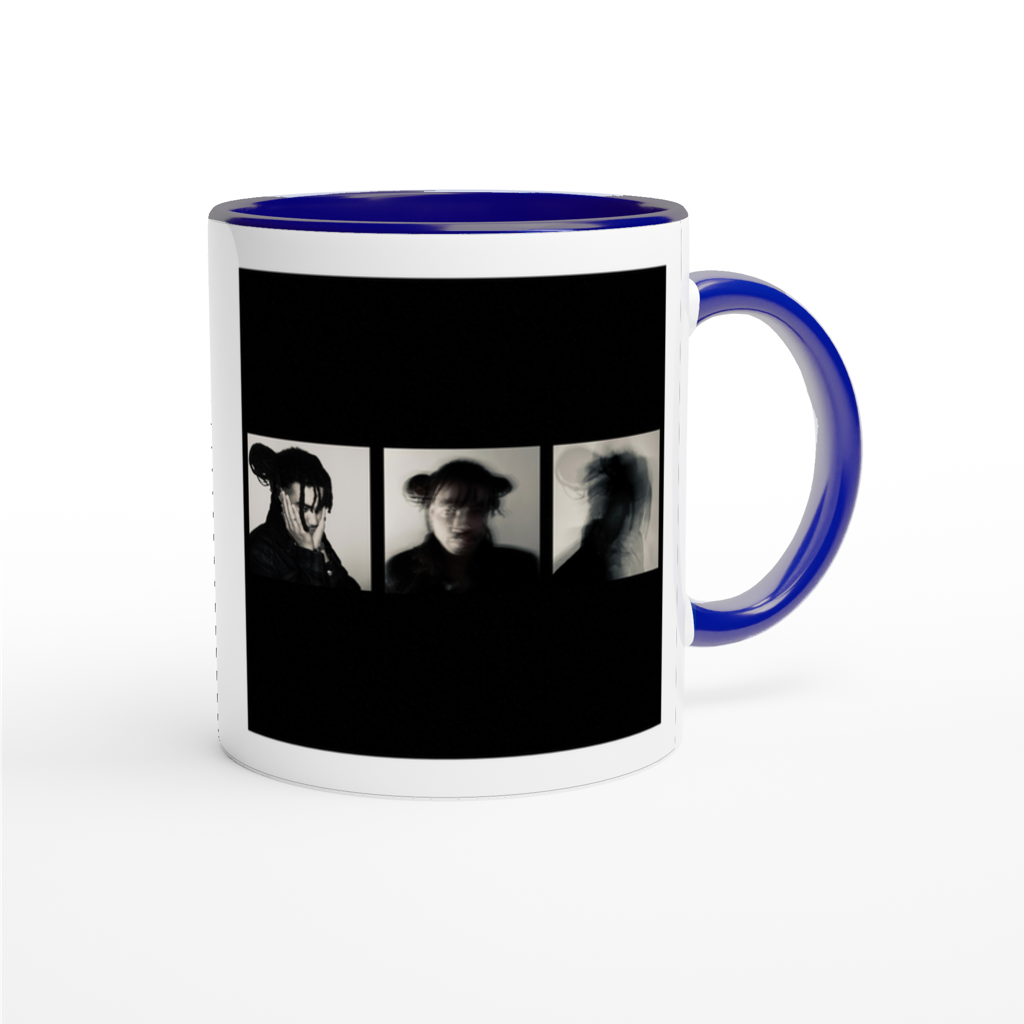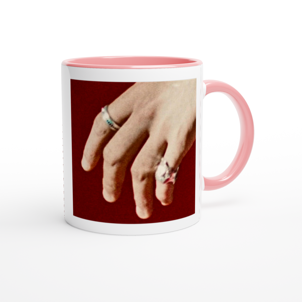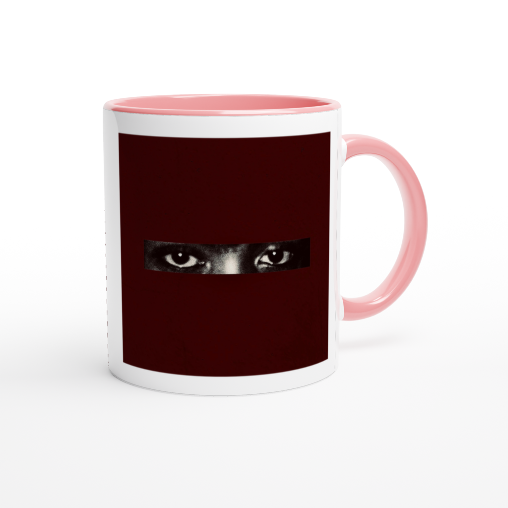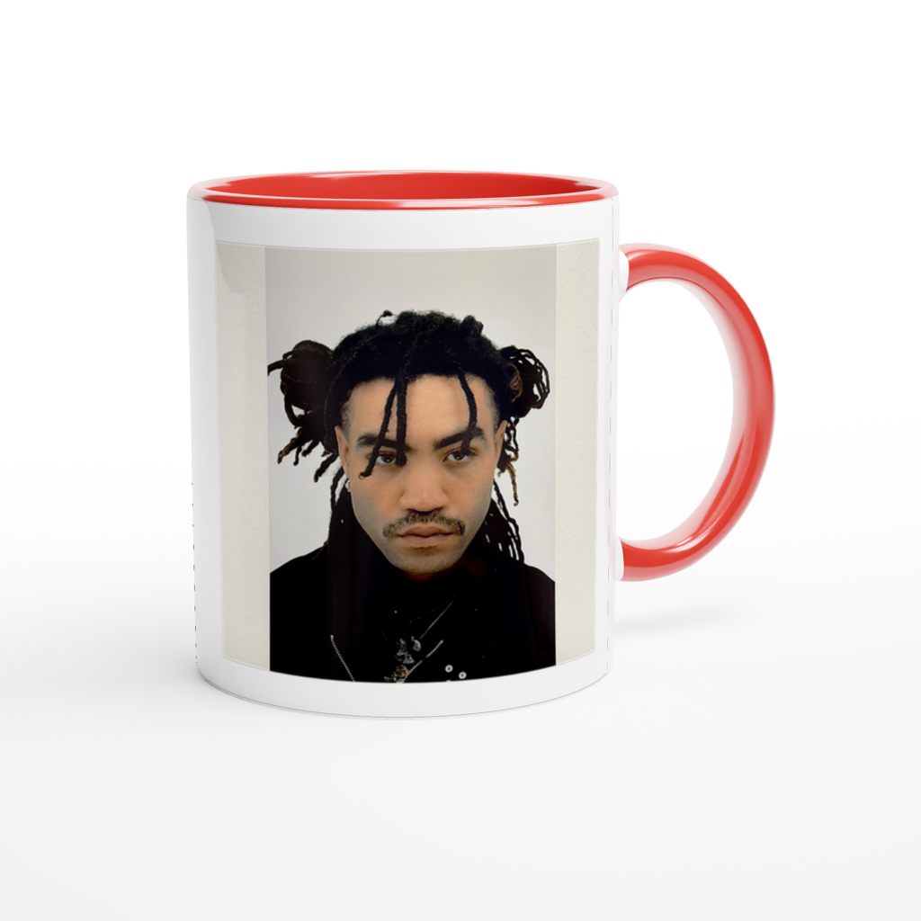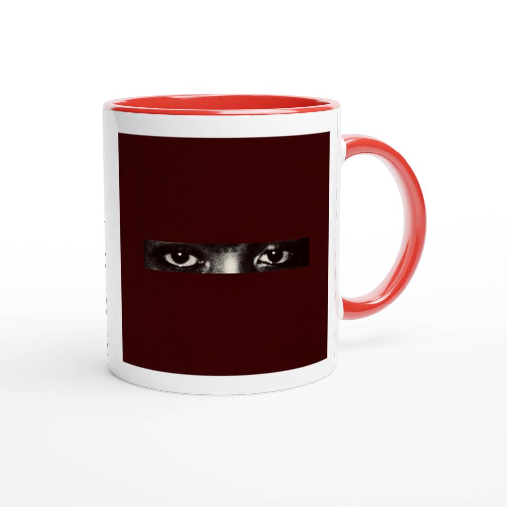 This mug is glossy white with a colored rim, inside, and handle. Microwave and dishwasher safe.