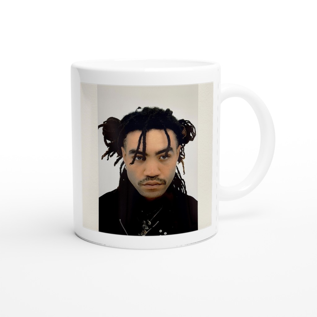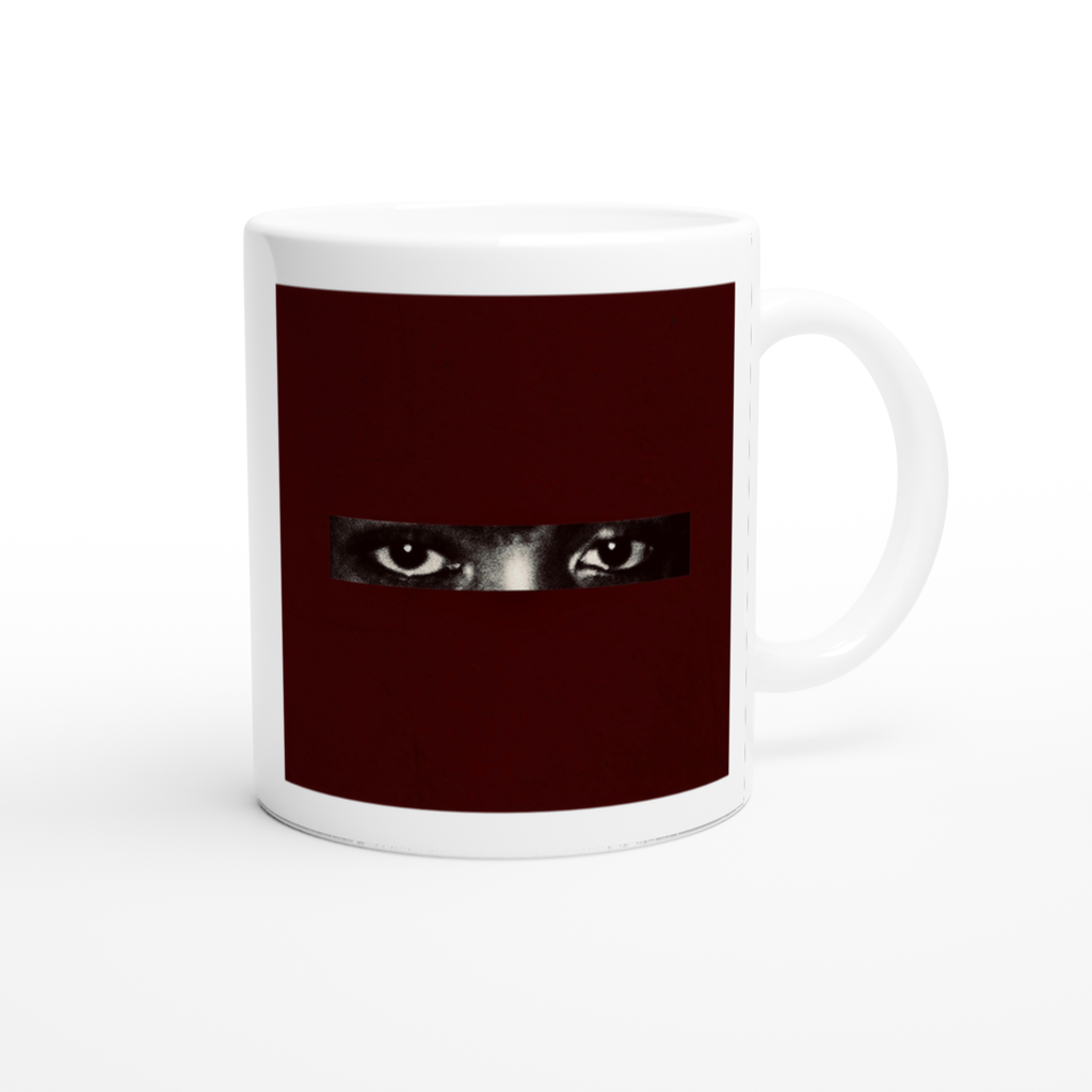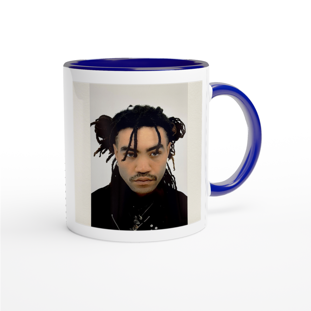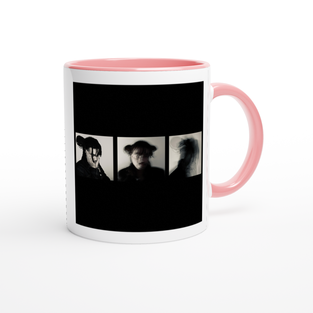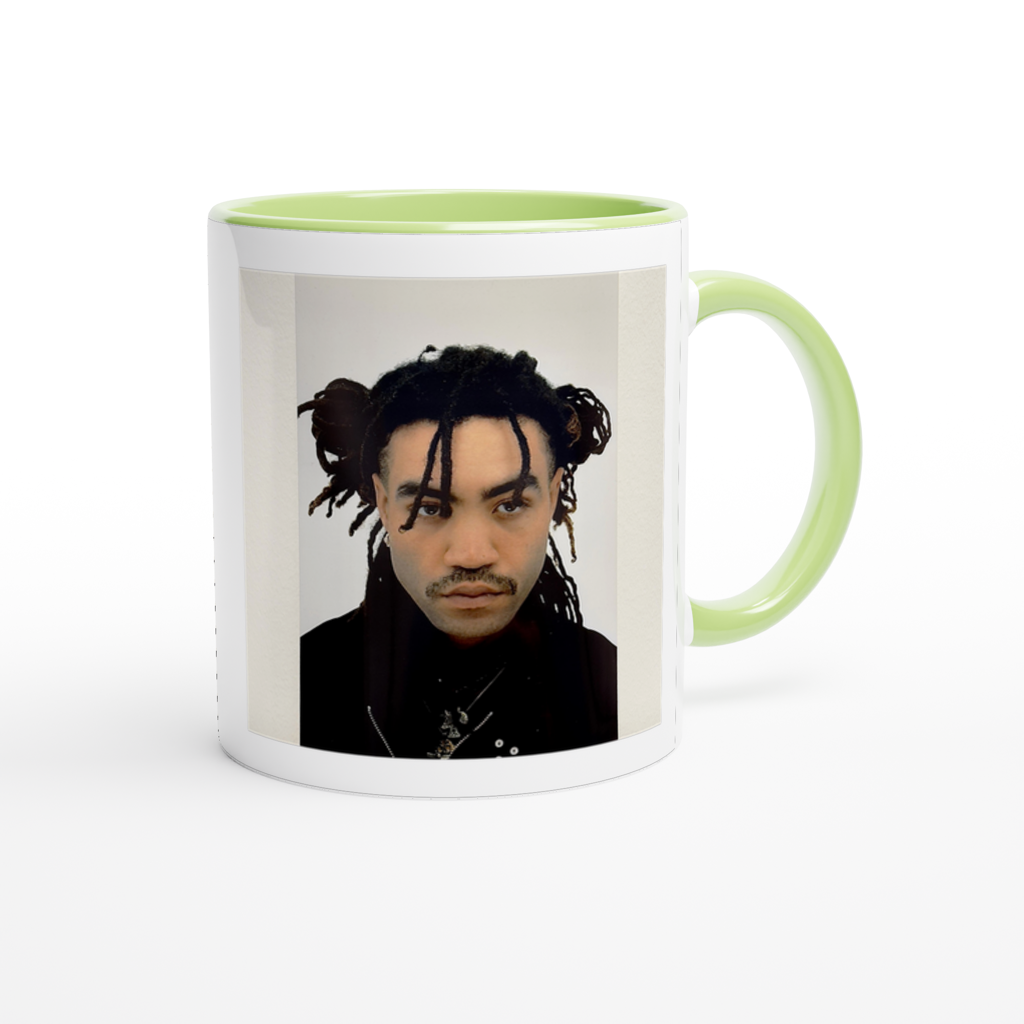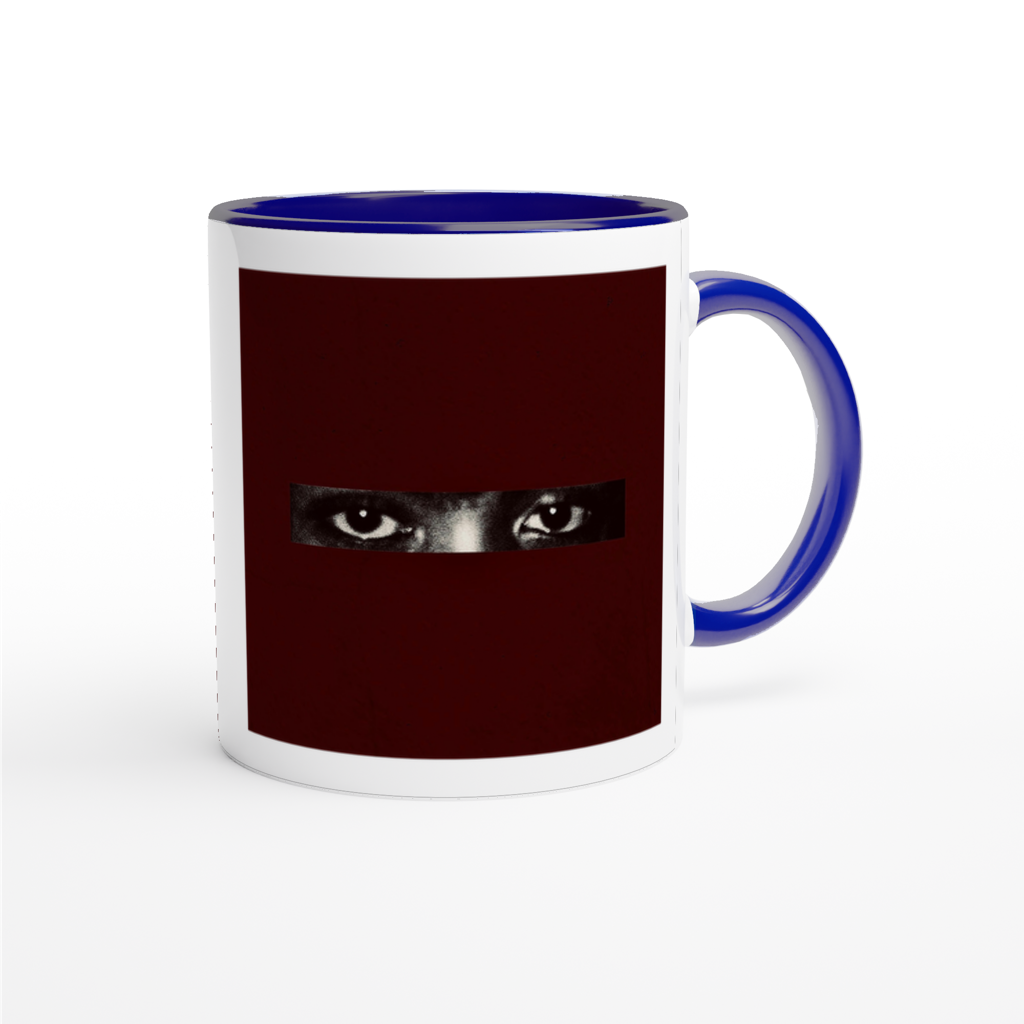 This mug is glossy white with a colored rim, inside, and handle. Microwave and dishwasher safe.
