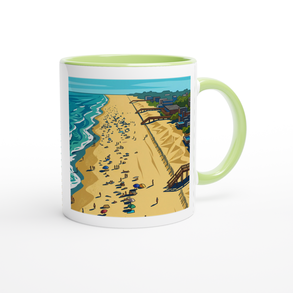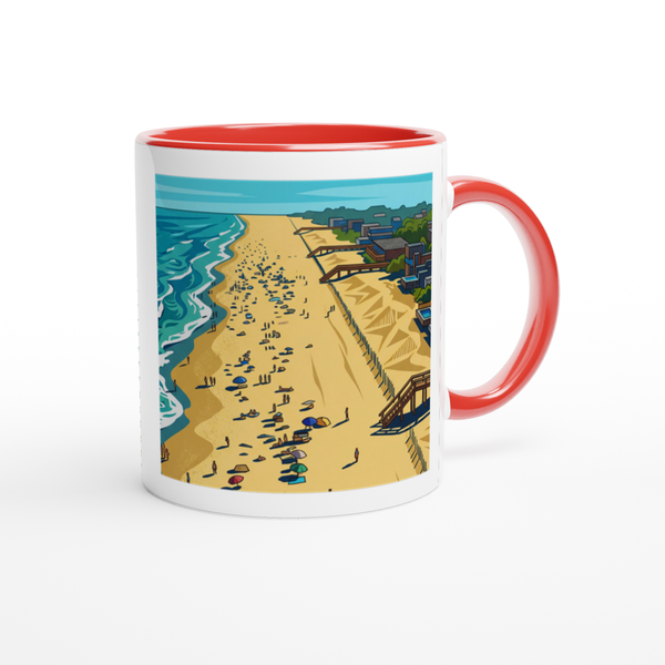 This mug is glossy white with a colored rim, inside, and handle. Microwave and dishwasher safe.