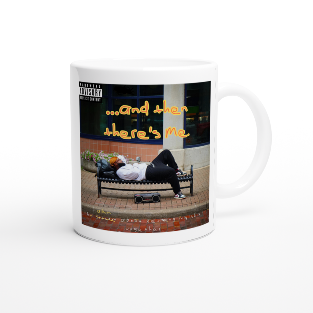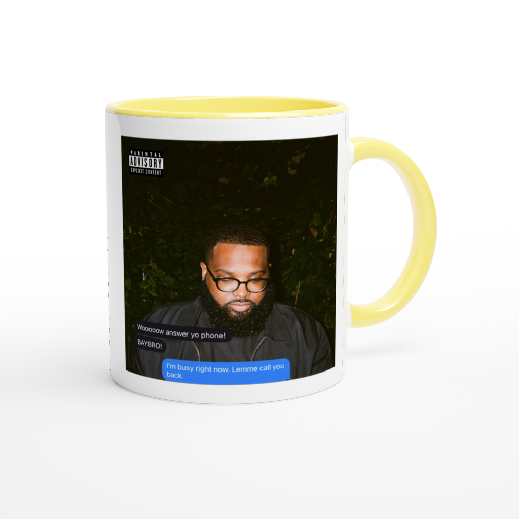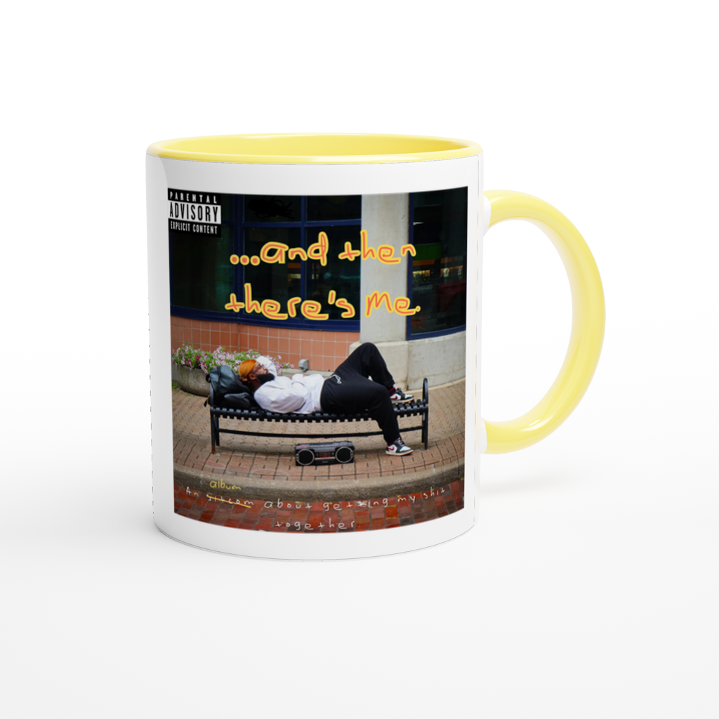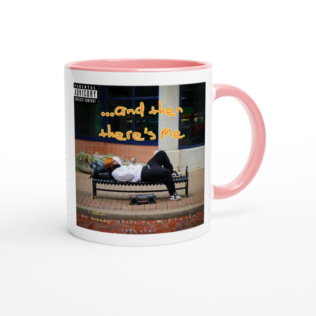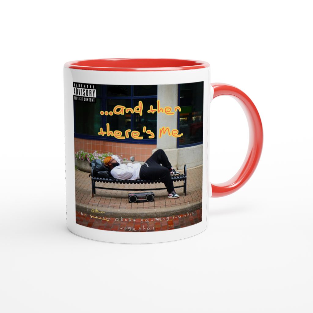 This mug is glossy white with a colored rim, inside, and handle. Microwave and dishwasher safe.