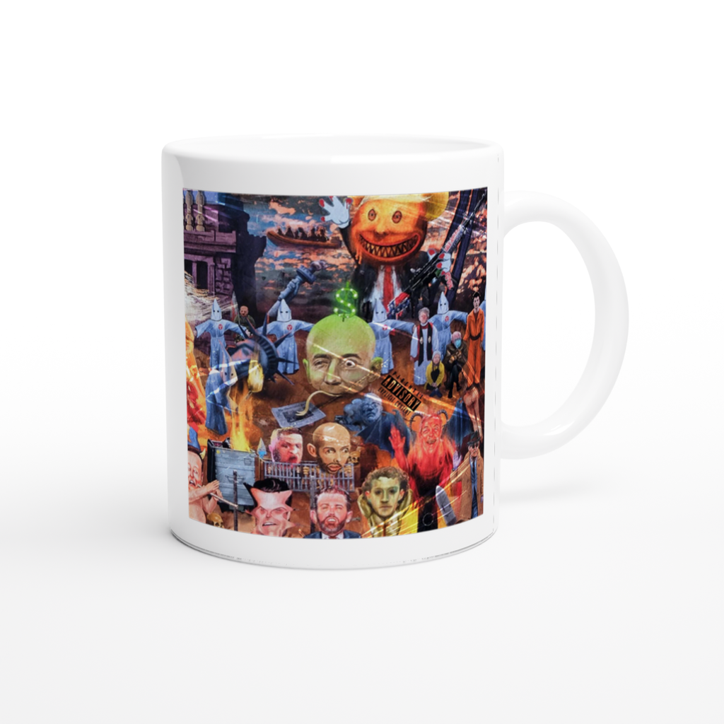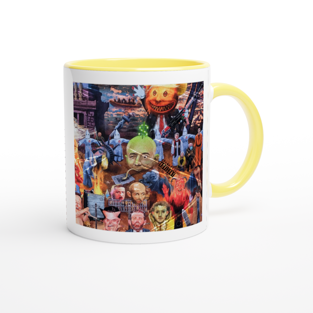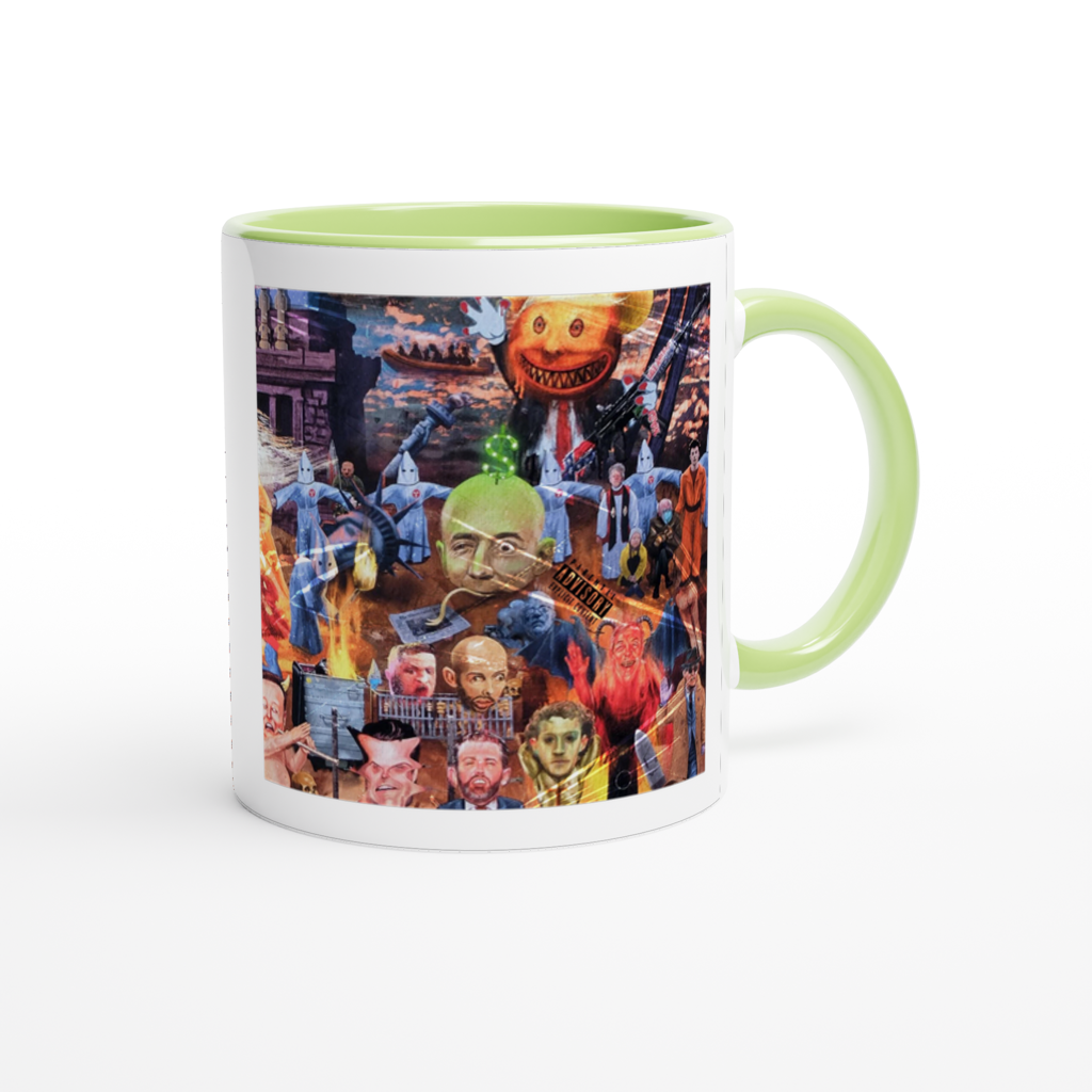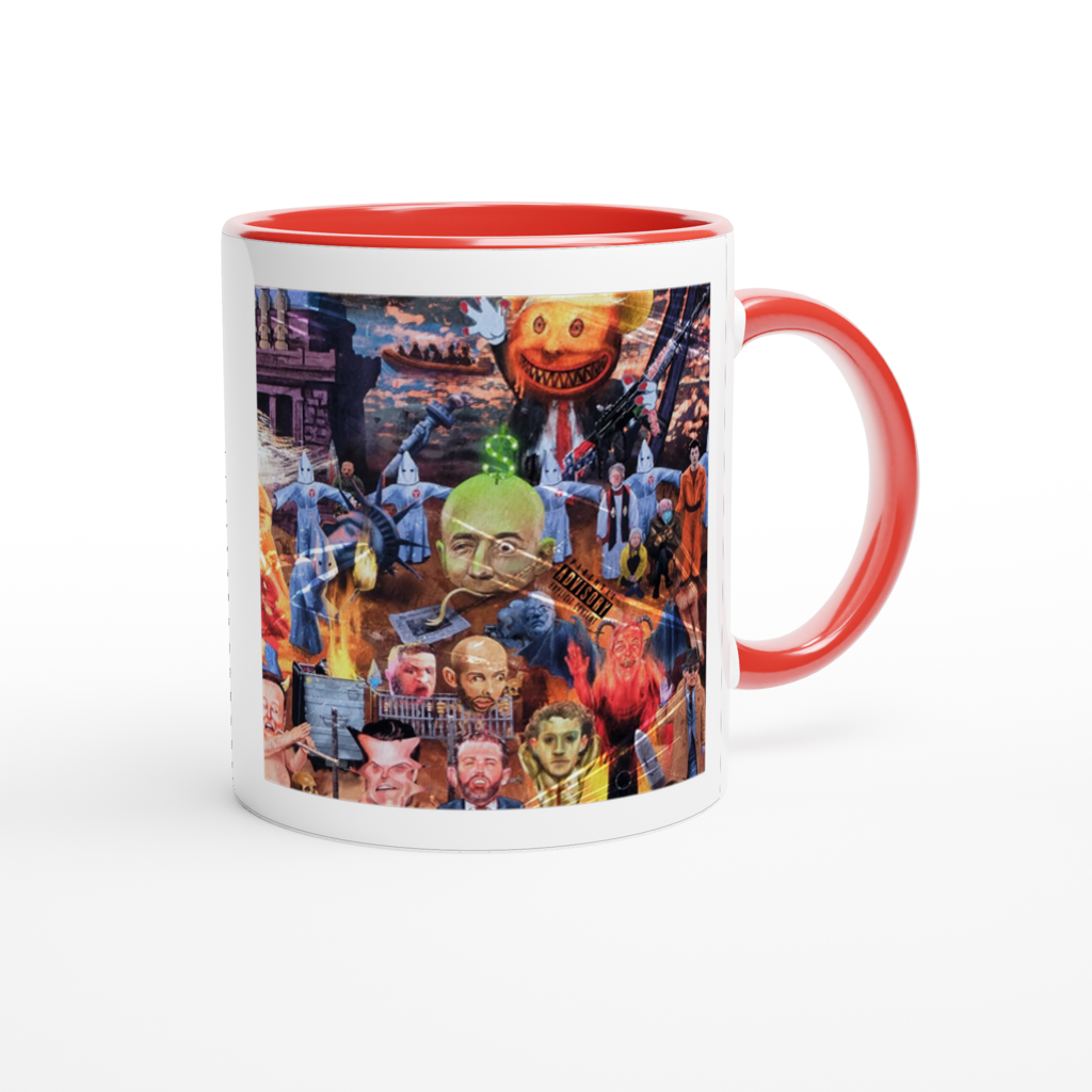 This mug is glossy white with a colored rim, inside, and handle. Microwave and dishwasher safe.