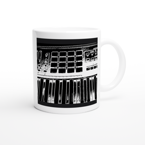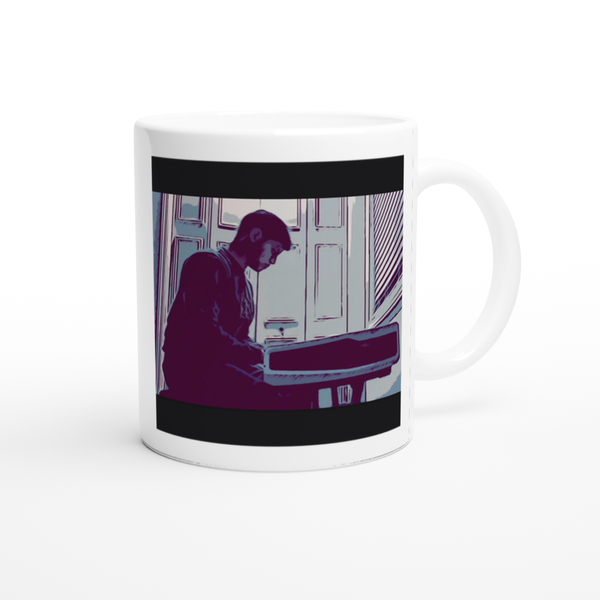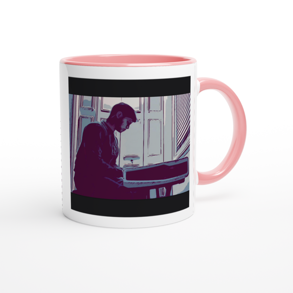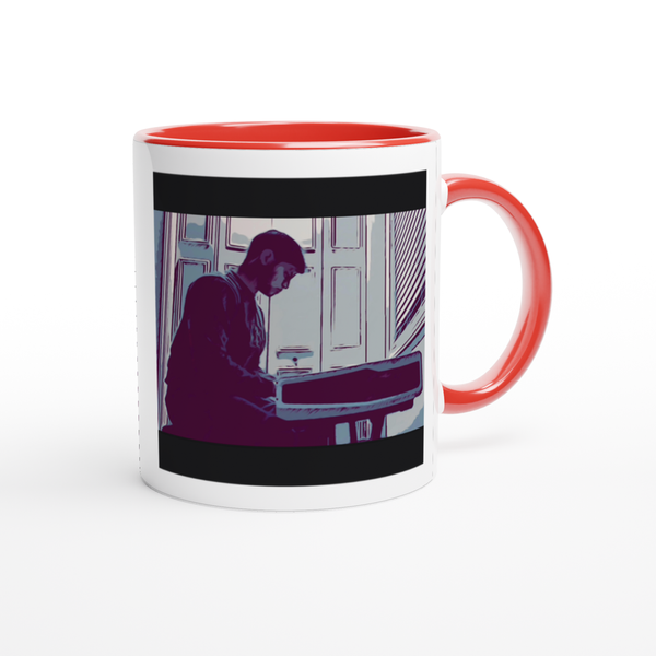 This mug is glossy white with a colored rim, inside, and handle. Microwave and dishwasher safe.