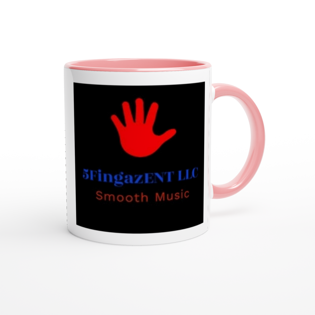 This mug is glossy white with a colored rim, inside, and handle. Microwave and dishwasher safe.