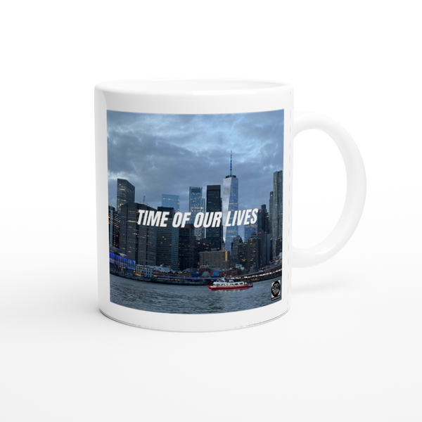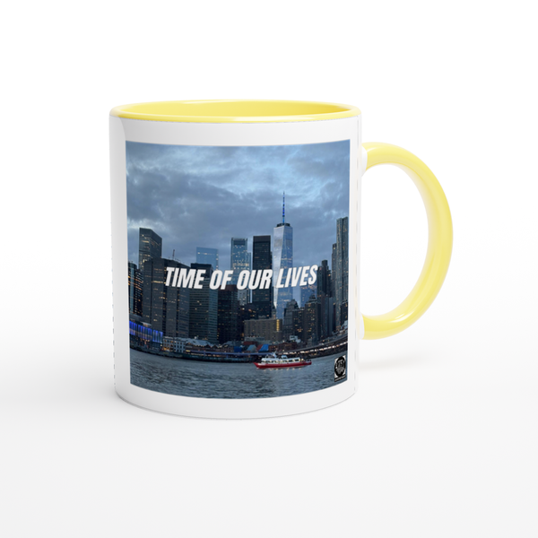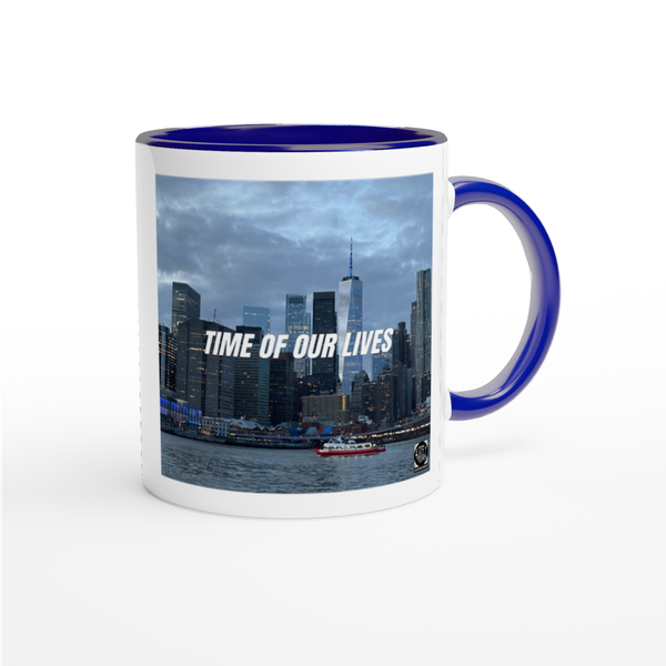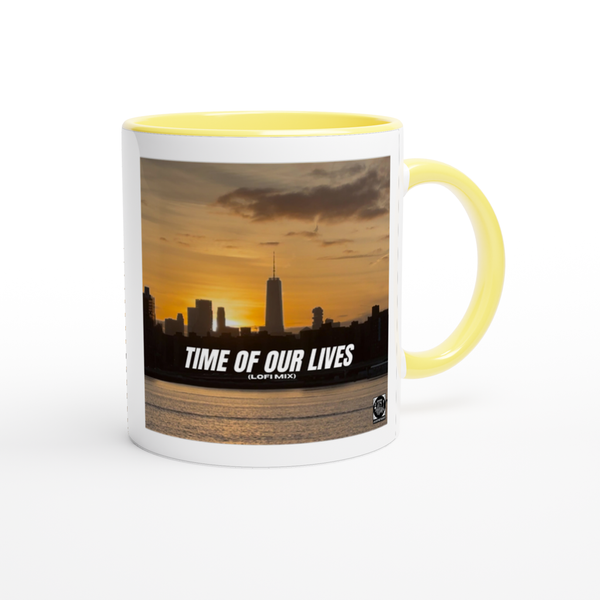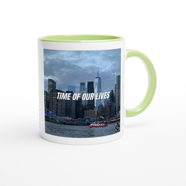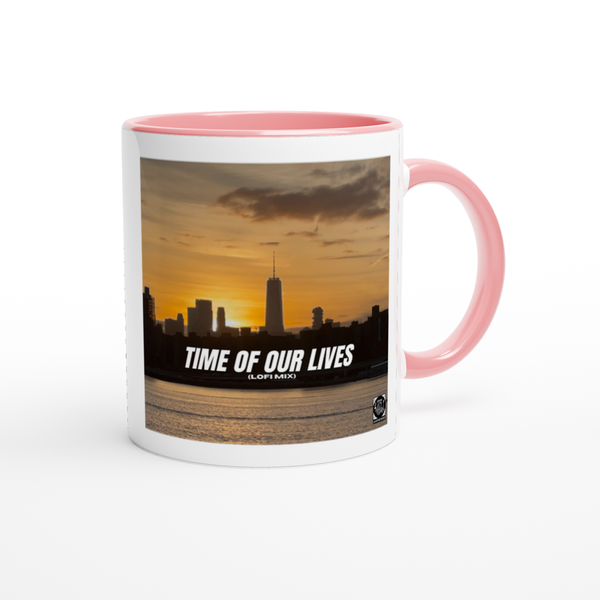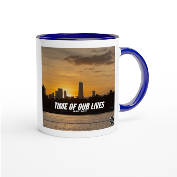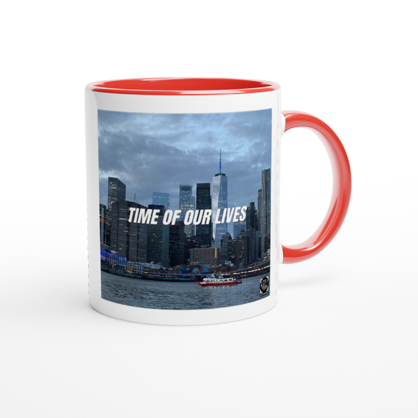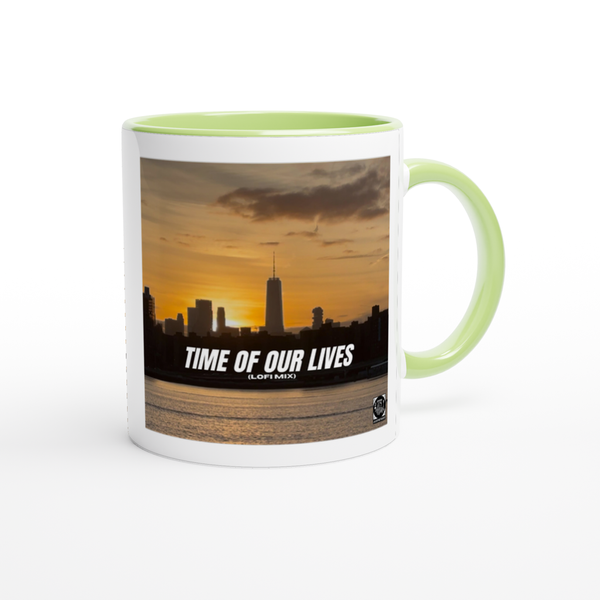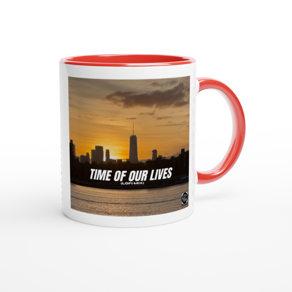 This mug is glossy white with a colored rim, inside, and handle. Microwave and dishwasher safe.