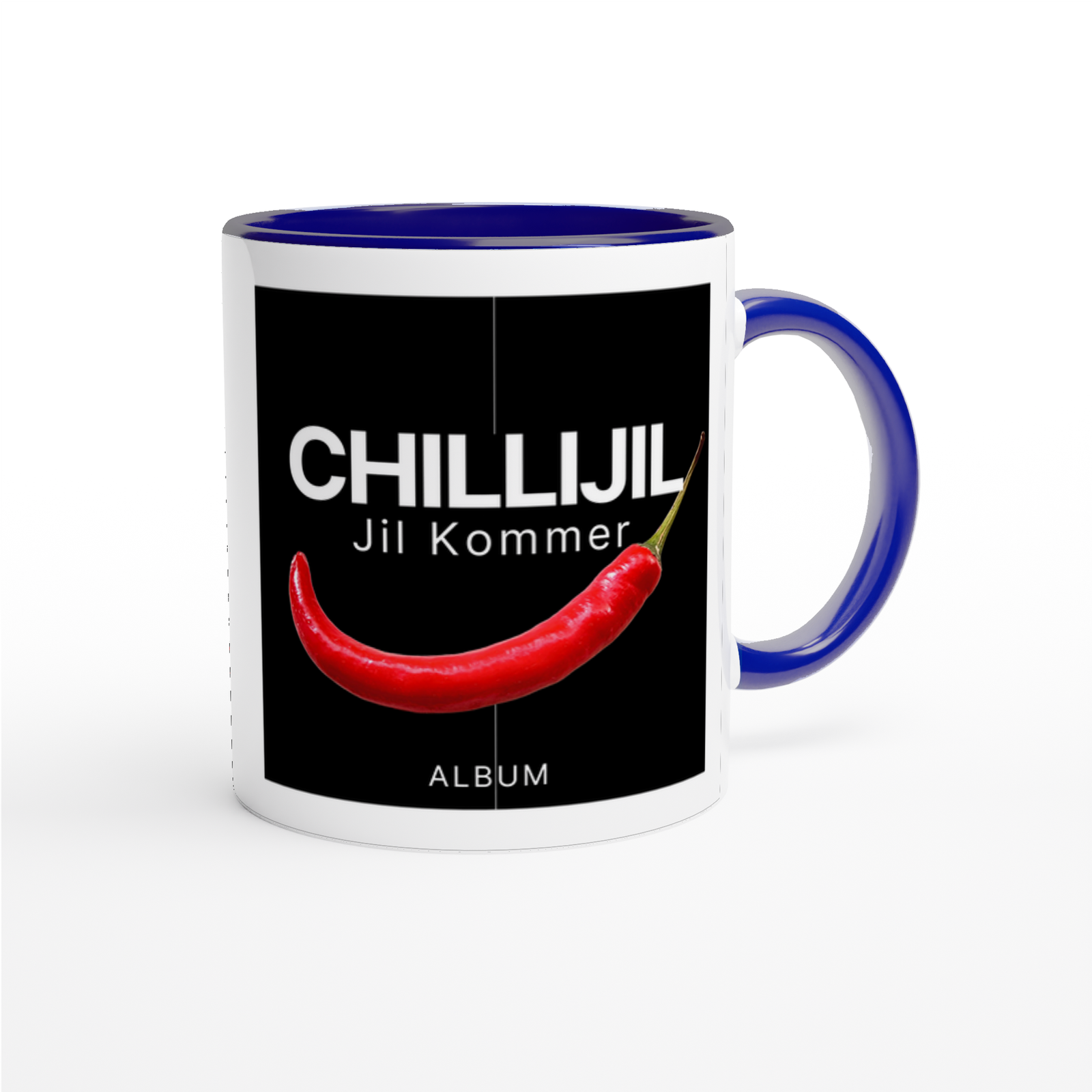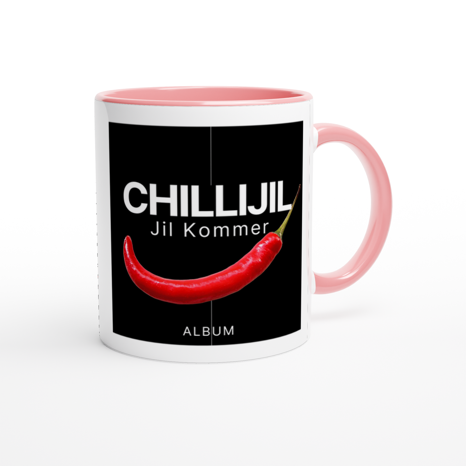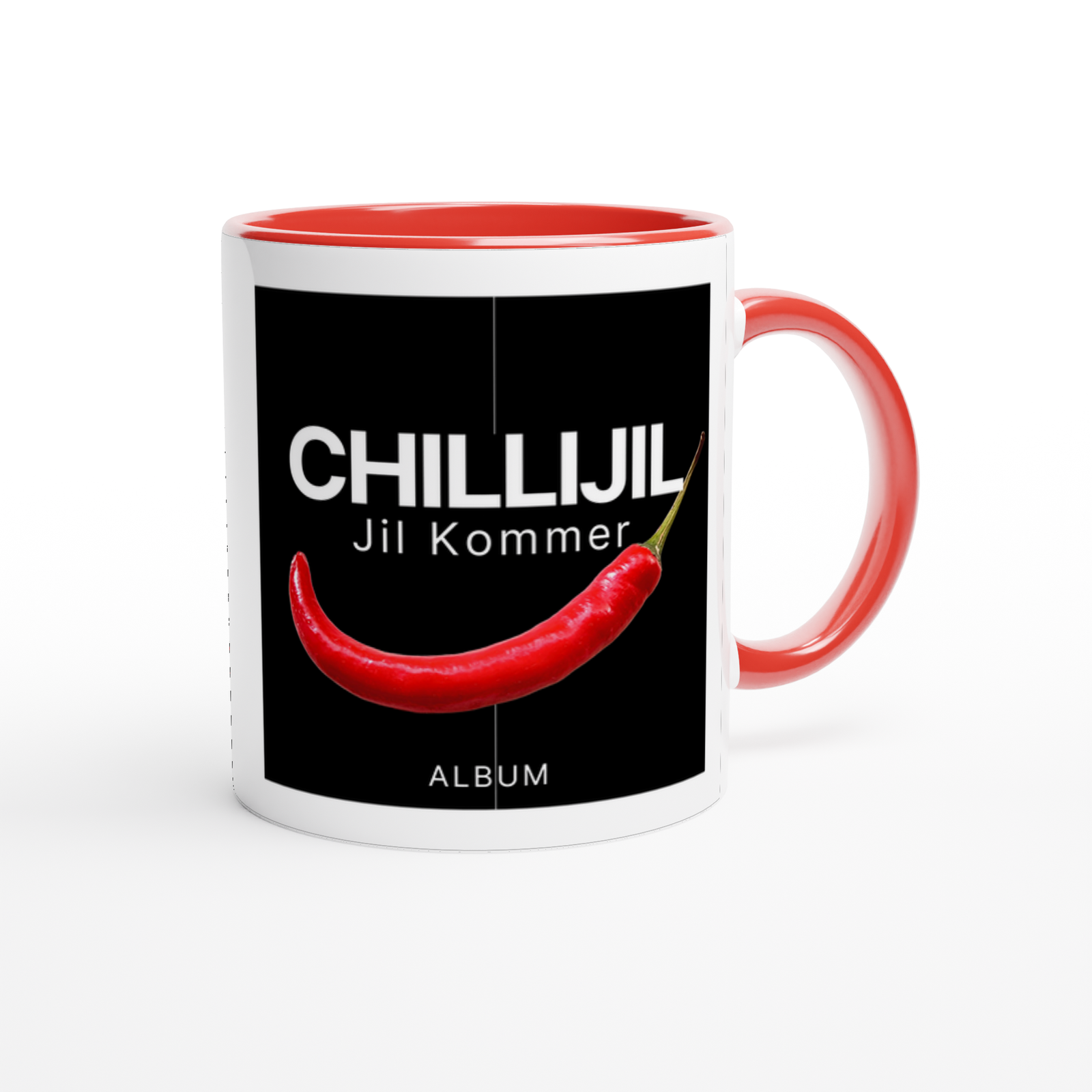 This mug is glossy white with a colored rim, inside, and handle. Microwave and dishwasher safe.