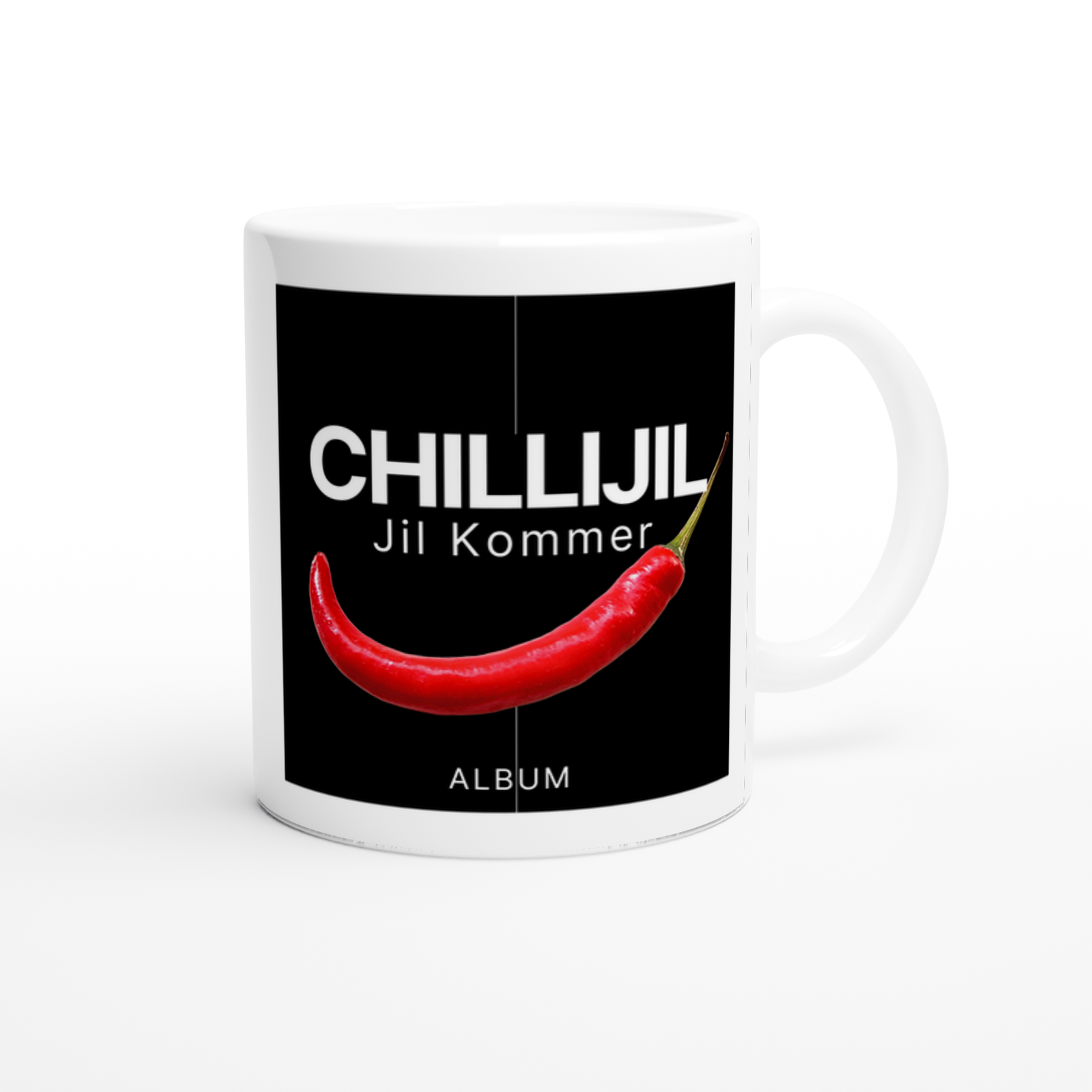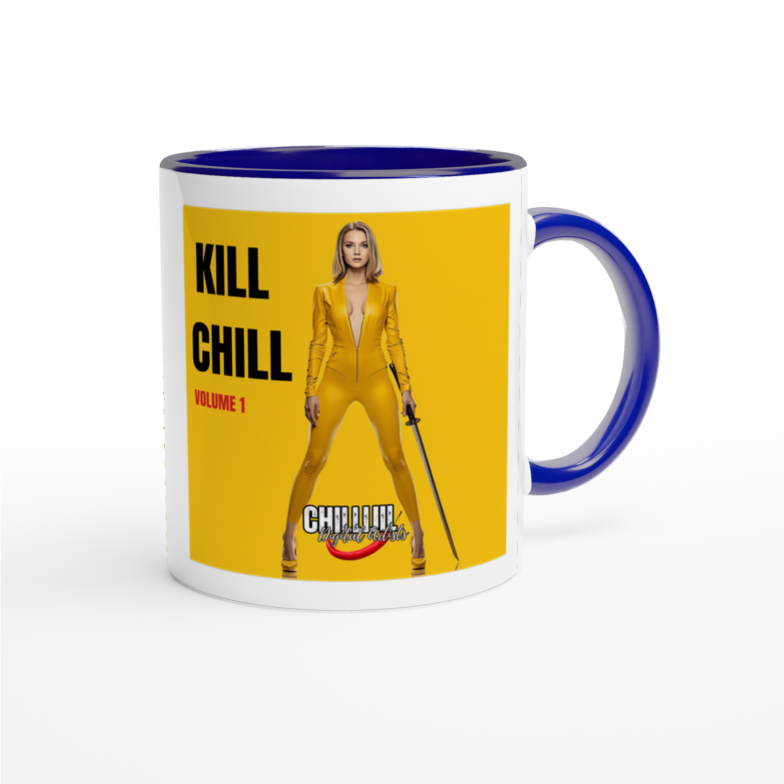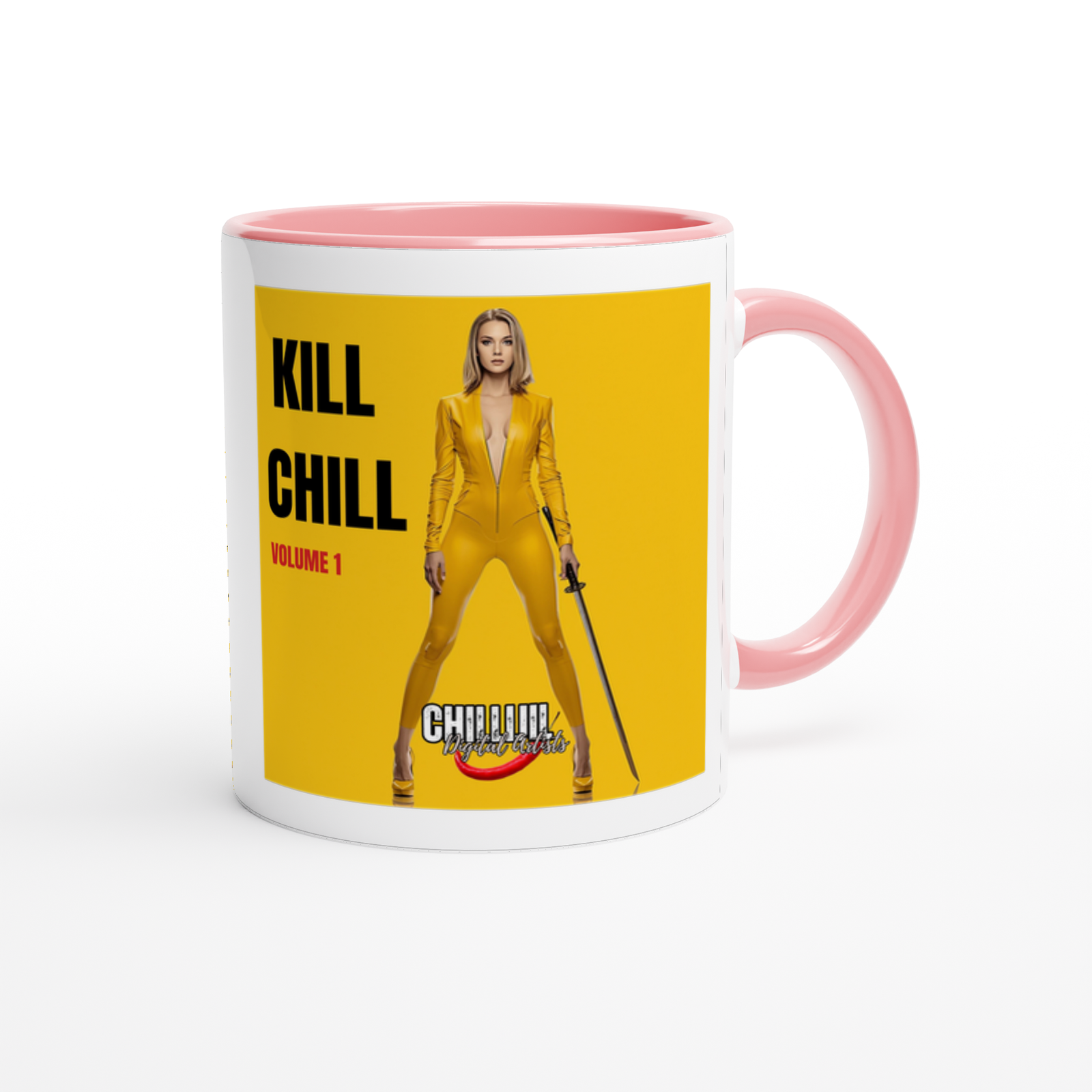 This mug is glossy white with a colored rim, inside, and handle. Microwave and dishwasher safe.