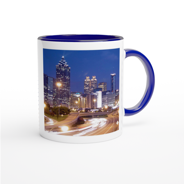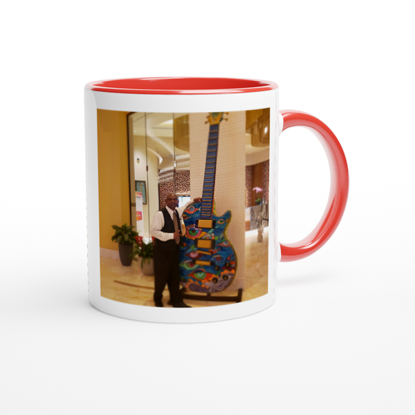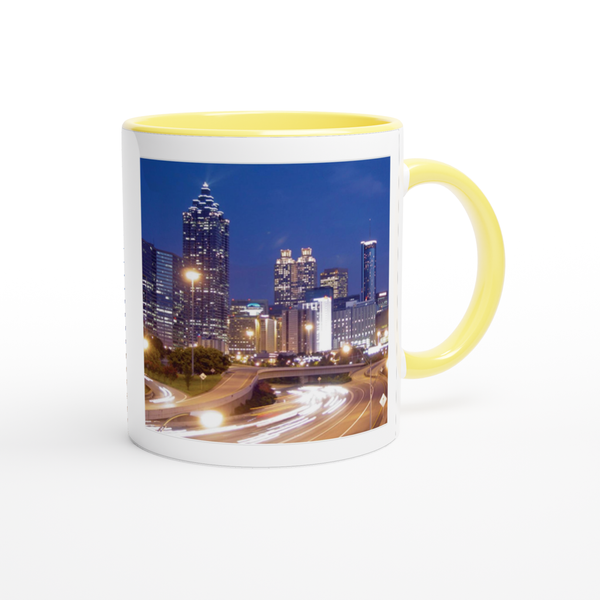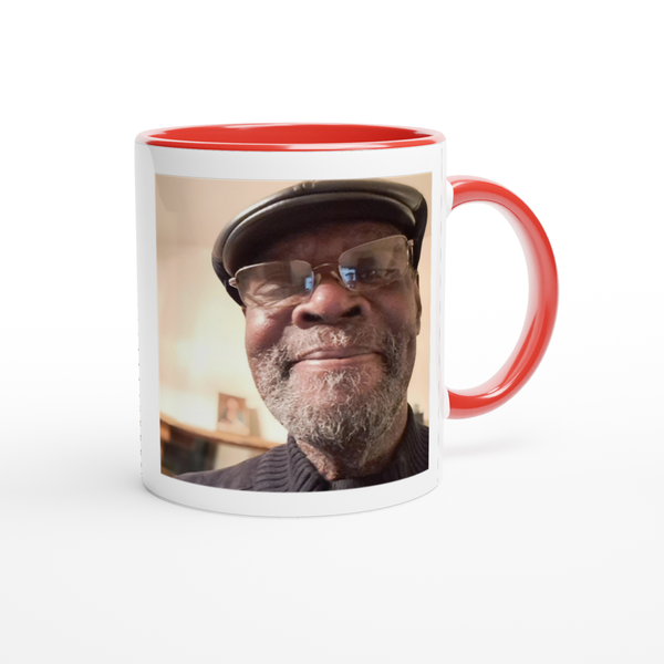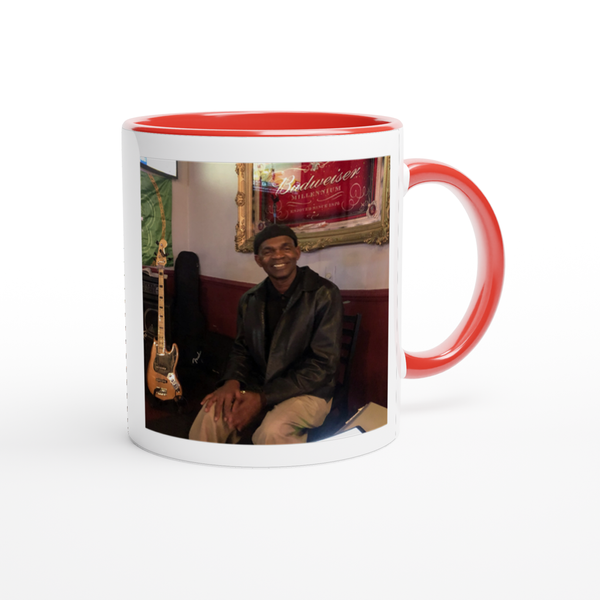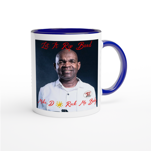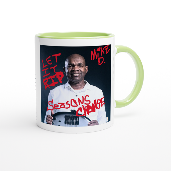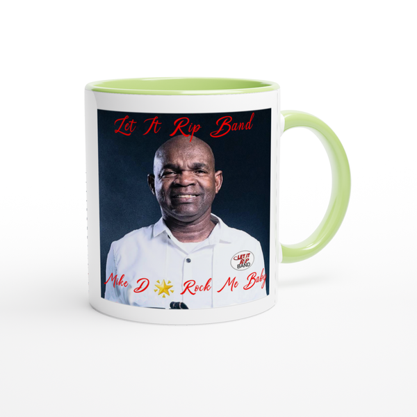 This mug is glossy white with a colored rim, inside, and handle. Microwave and dishwasher safe.