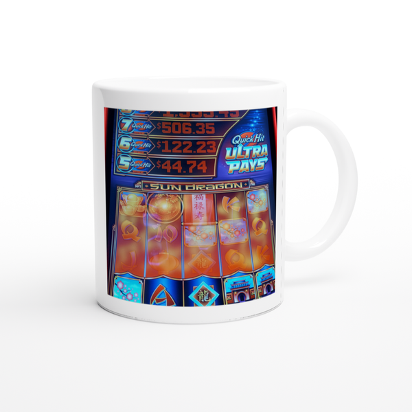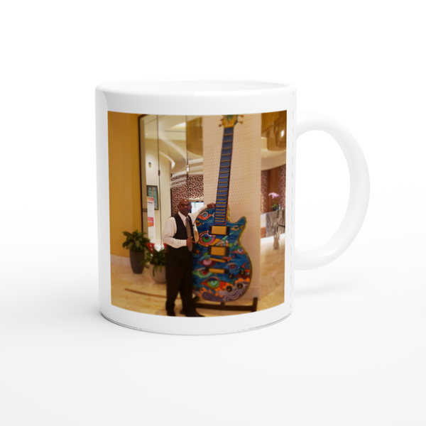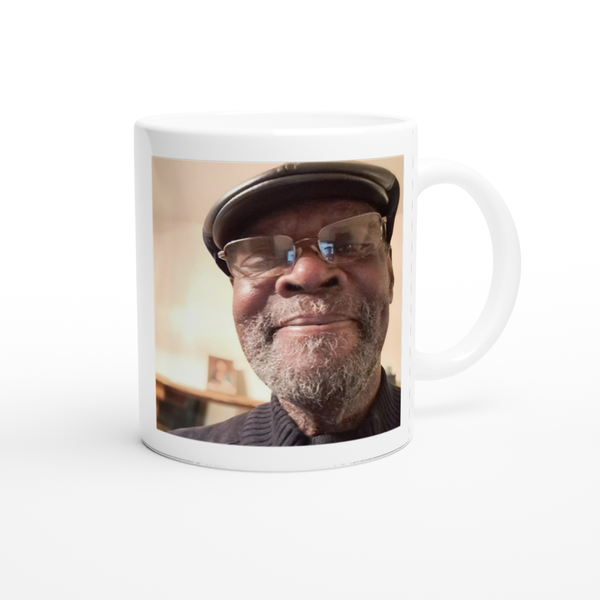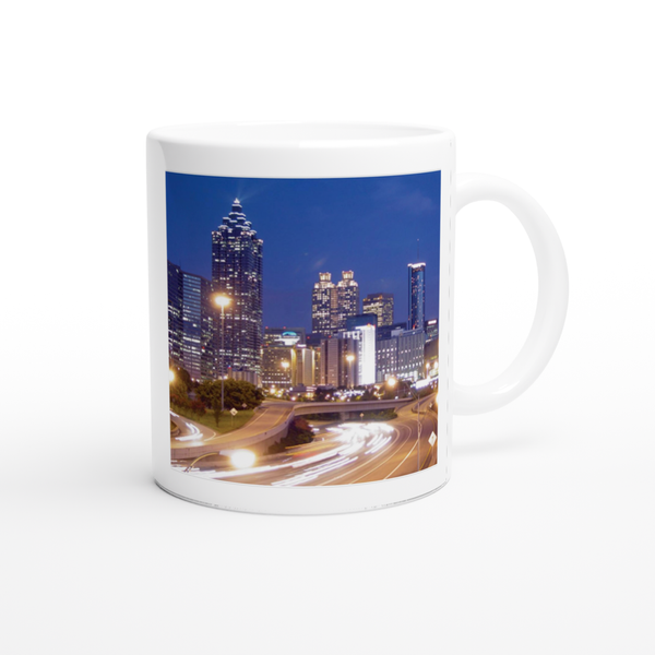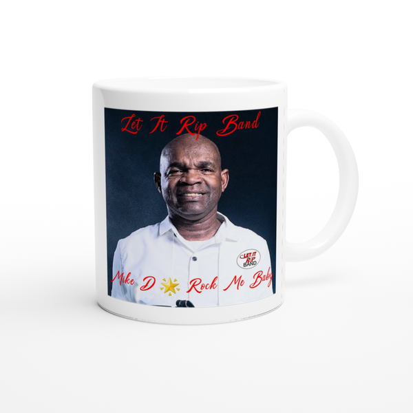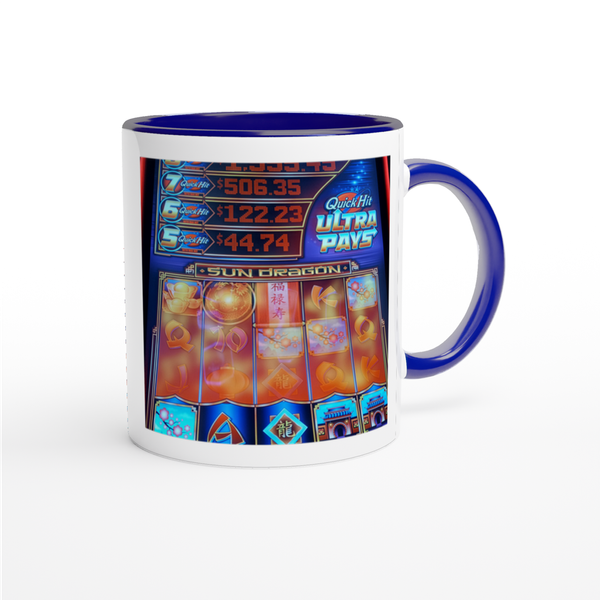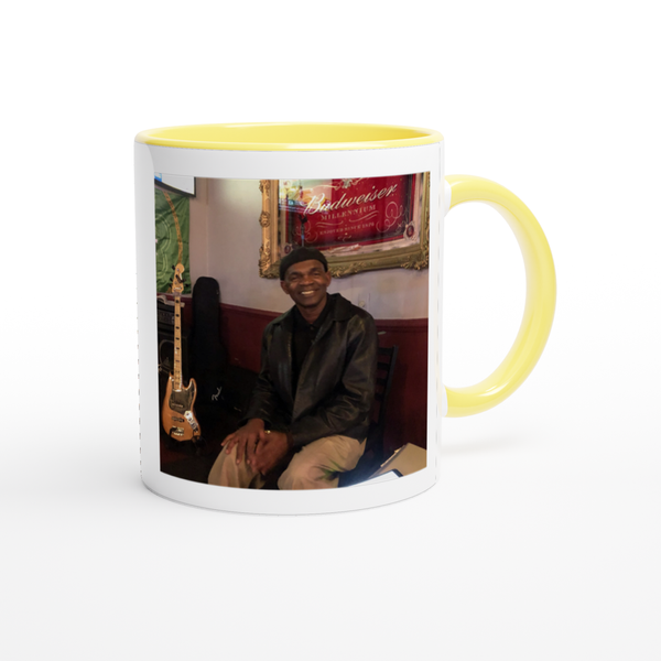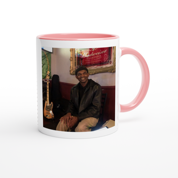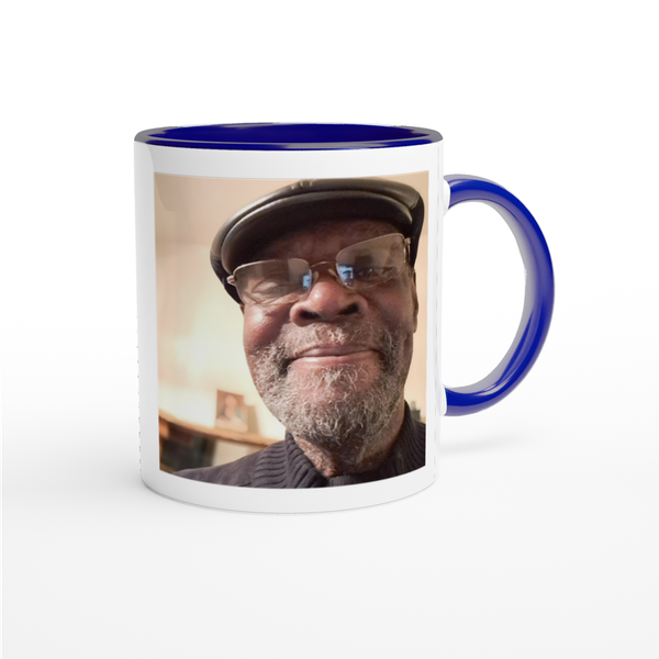 This mug is glossy white with a colored rim, inside, and handle. Microwave and dishwasher safe.
