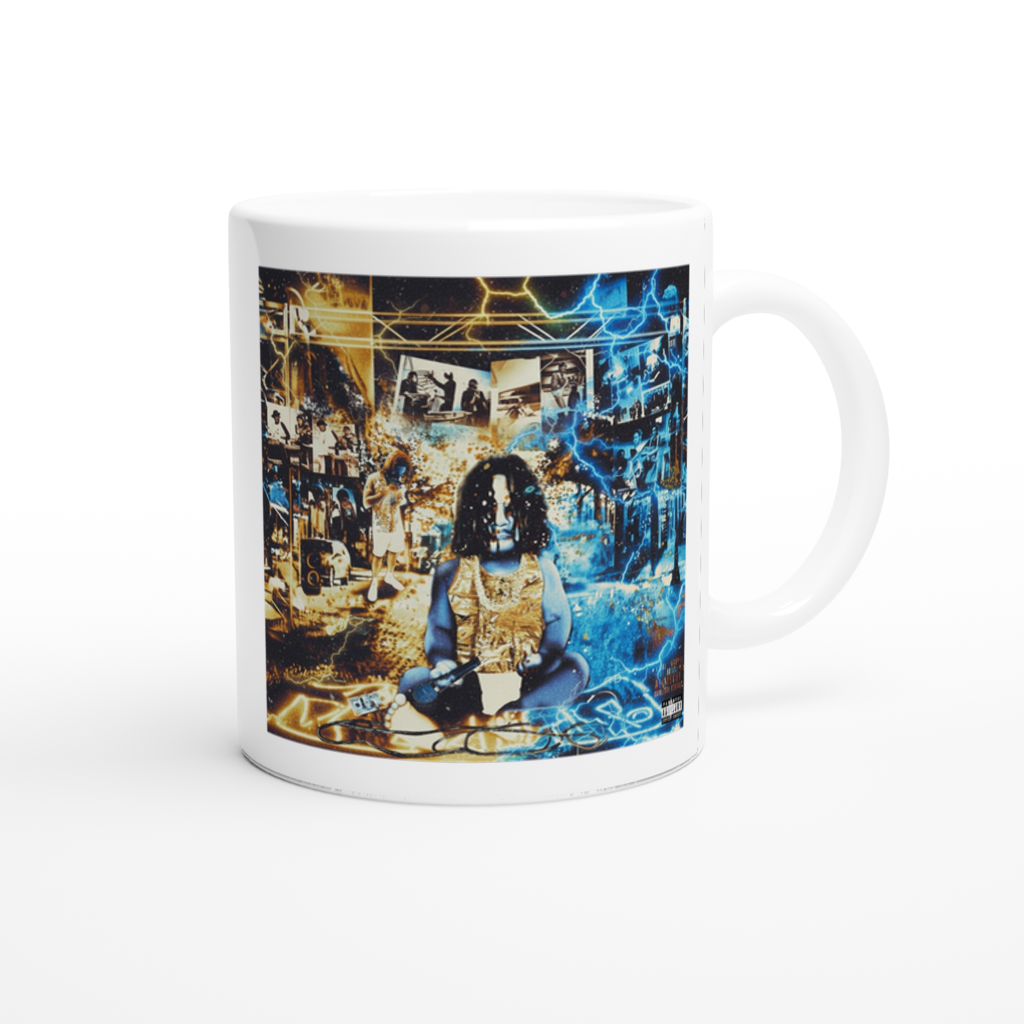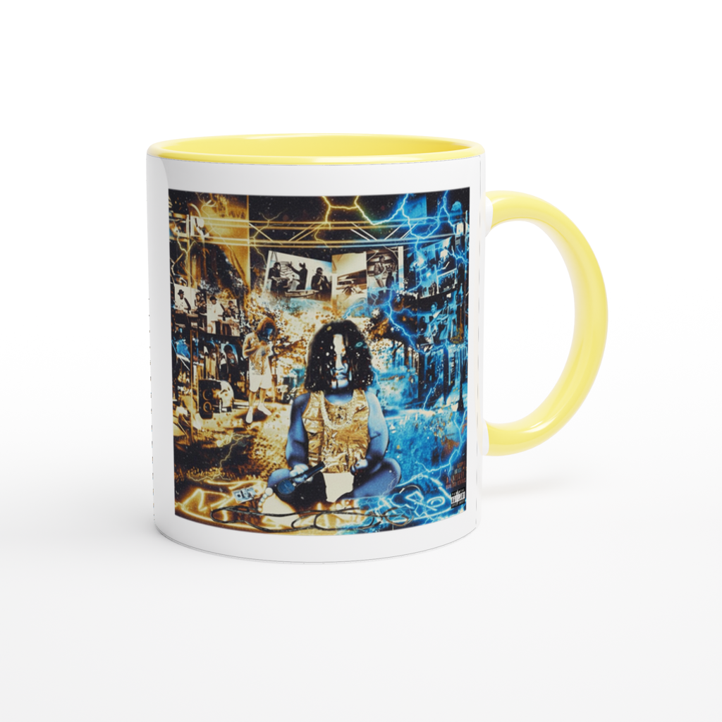 This mug is glossy white with a colored rim, inside, and handle. Microwave and dishwasher safe.