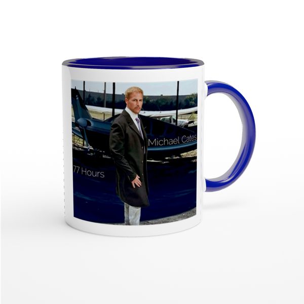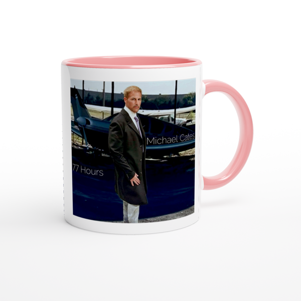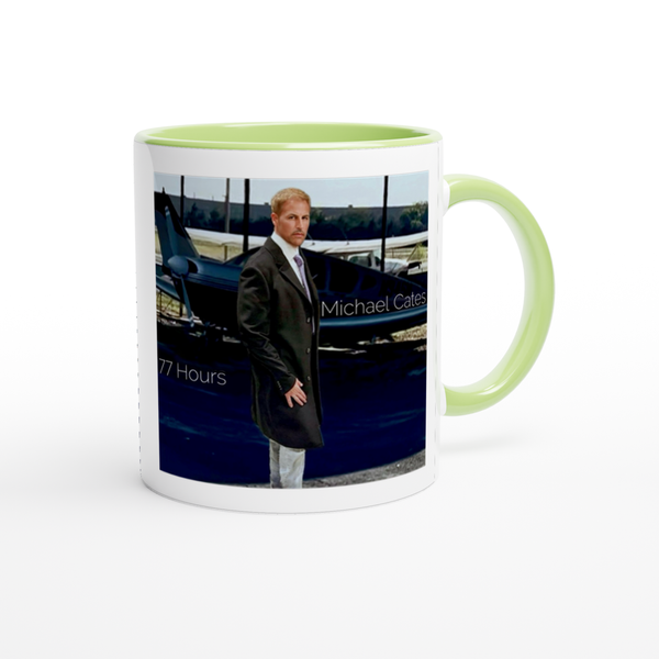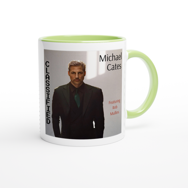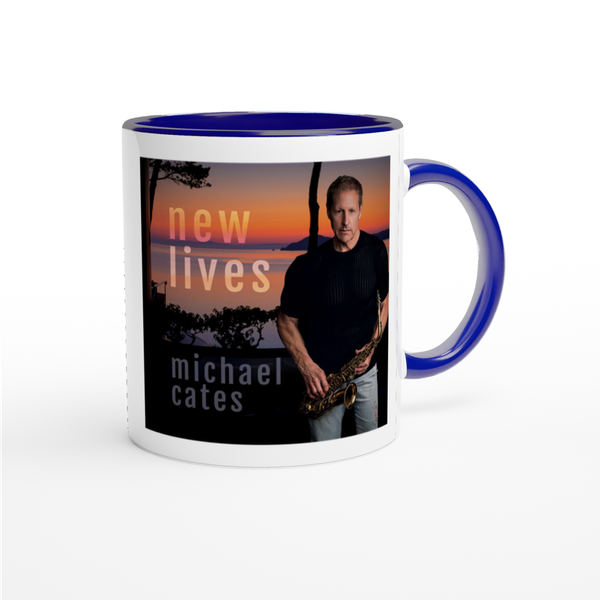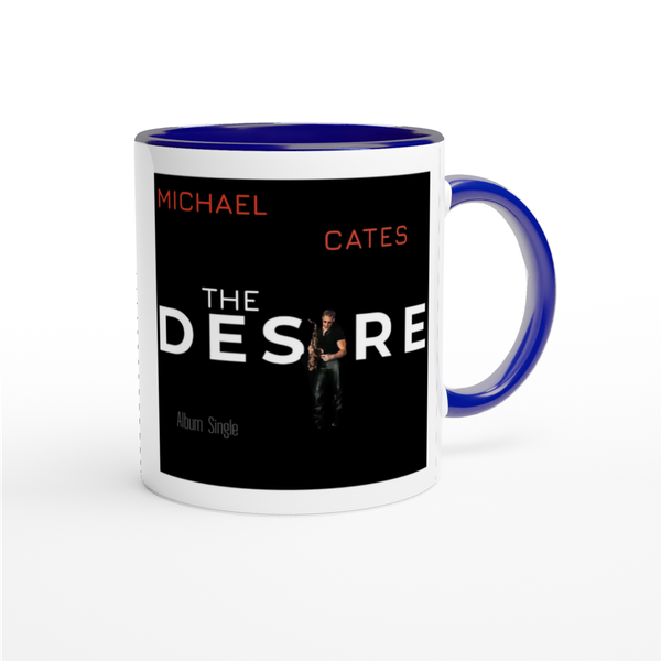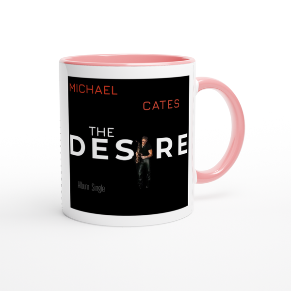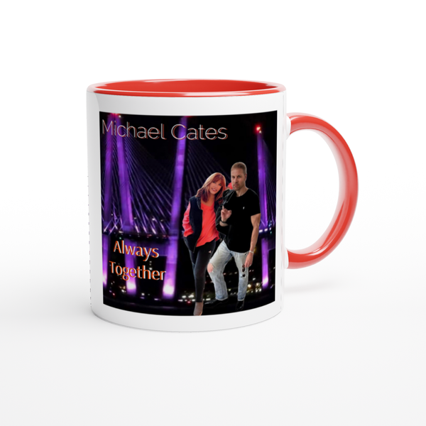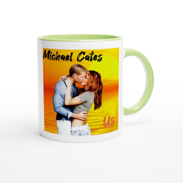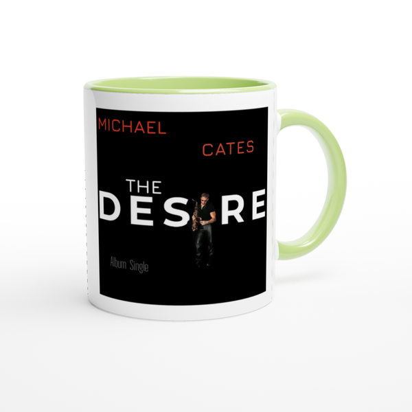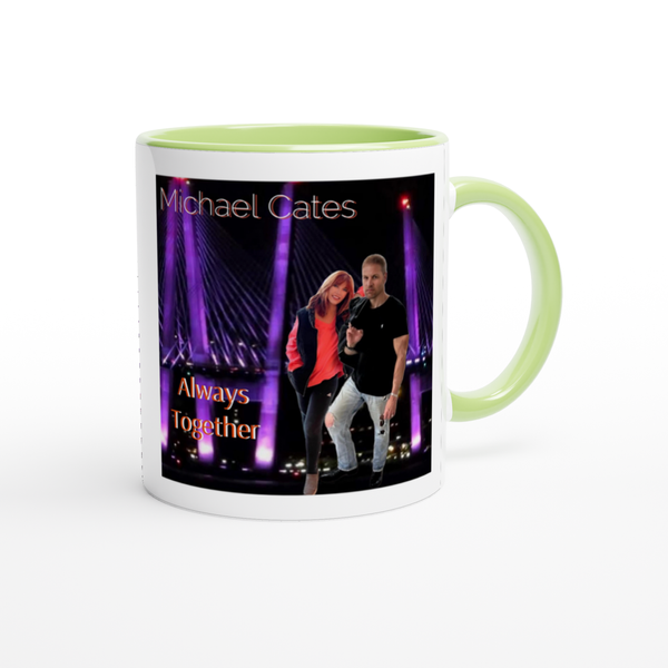 This mug is glossy white with a colored rim, inside, and handle. Microwave and dishwasher safe.