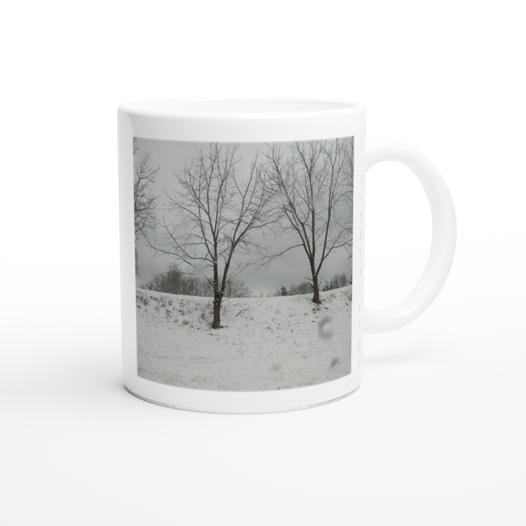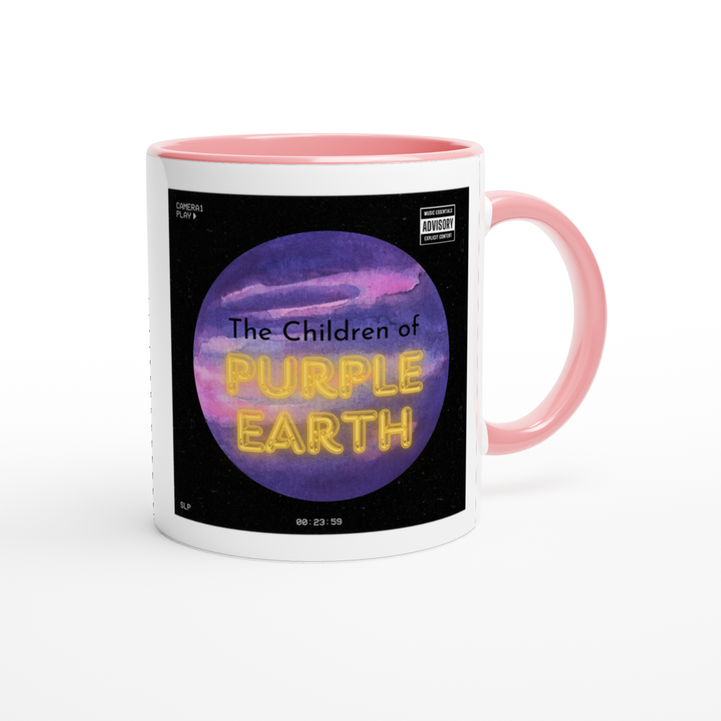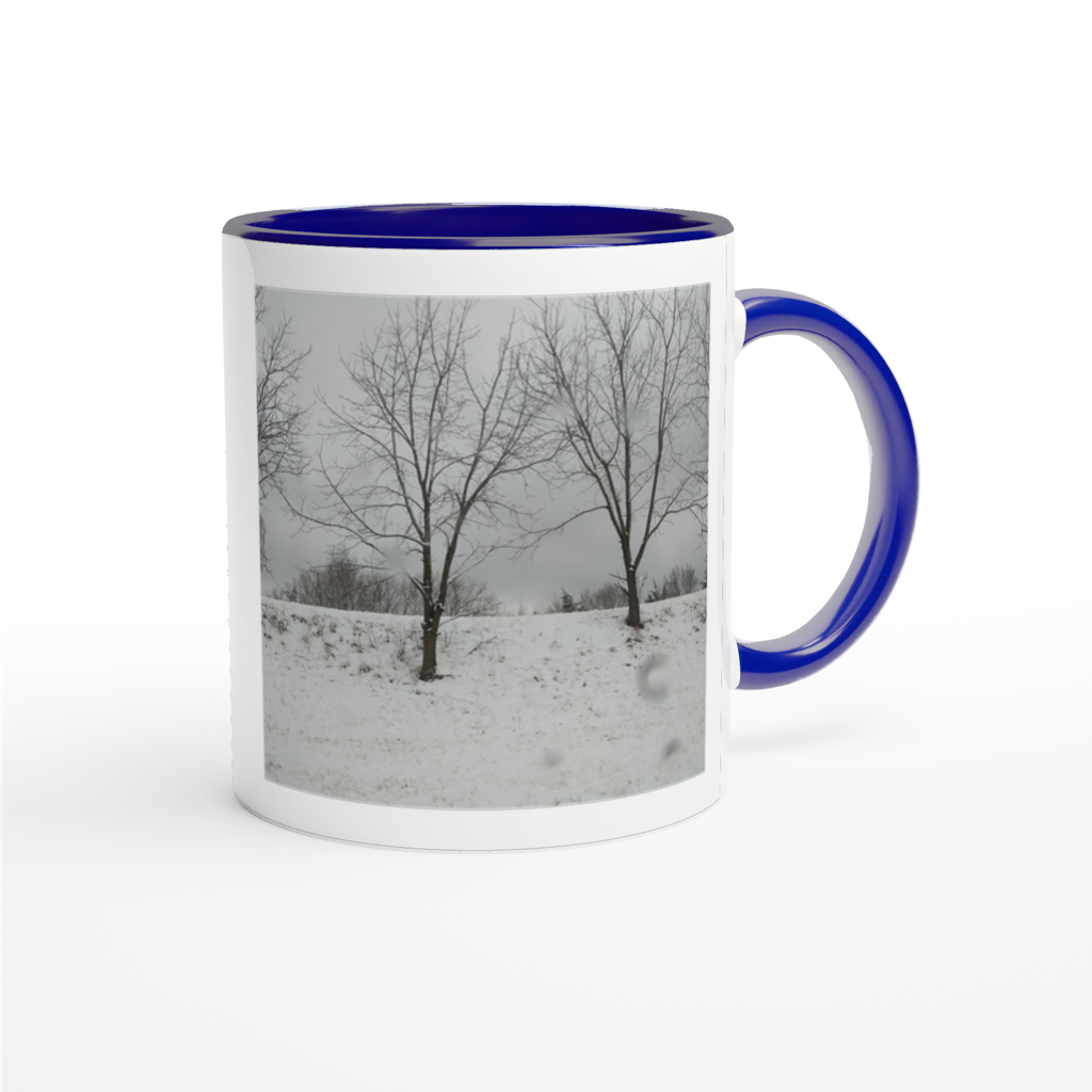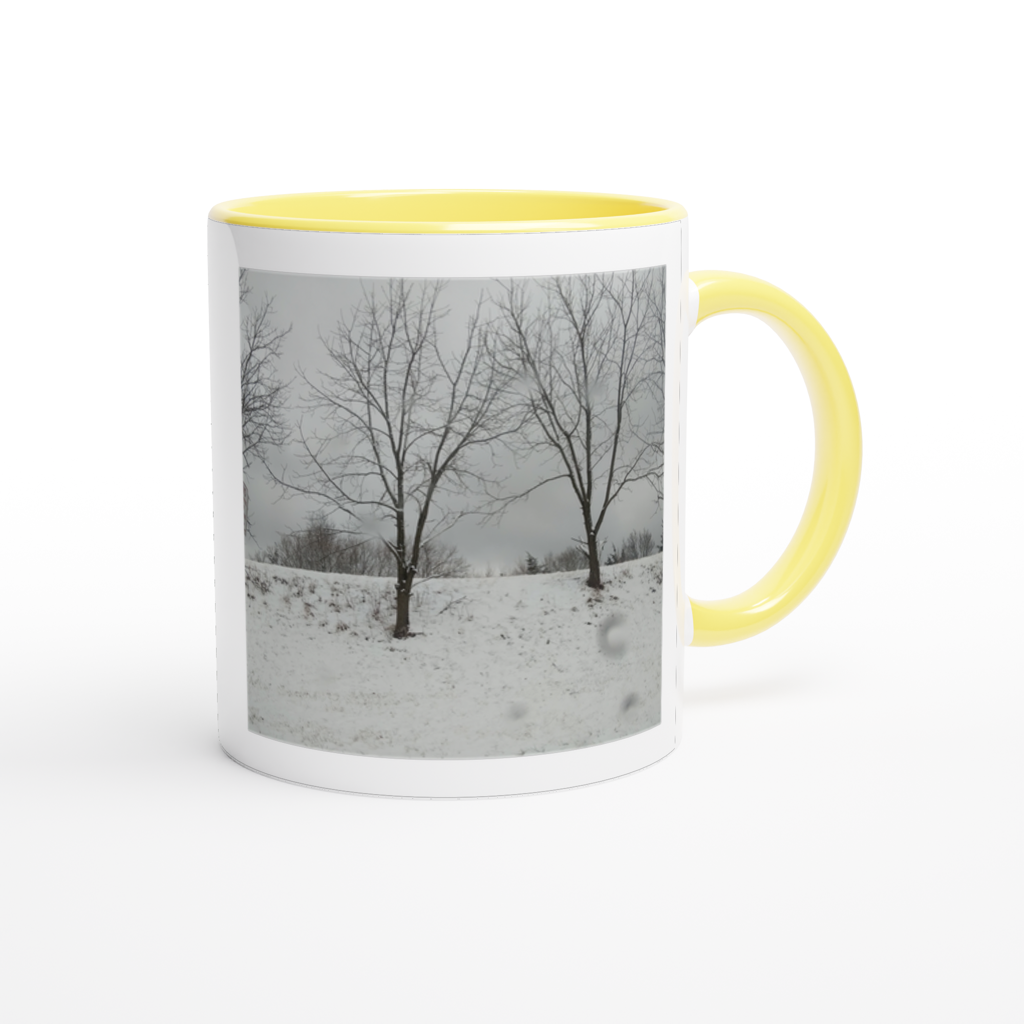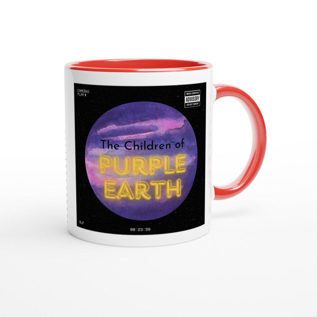 This mug is glossy white with a colored rim, inside, and handle. Microwave and dishwasher safe.