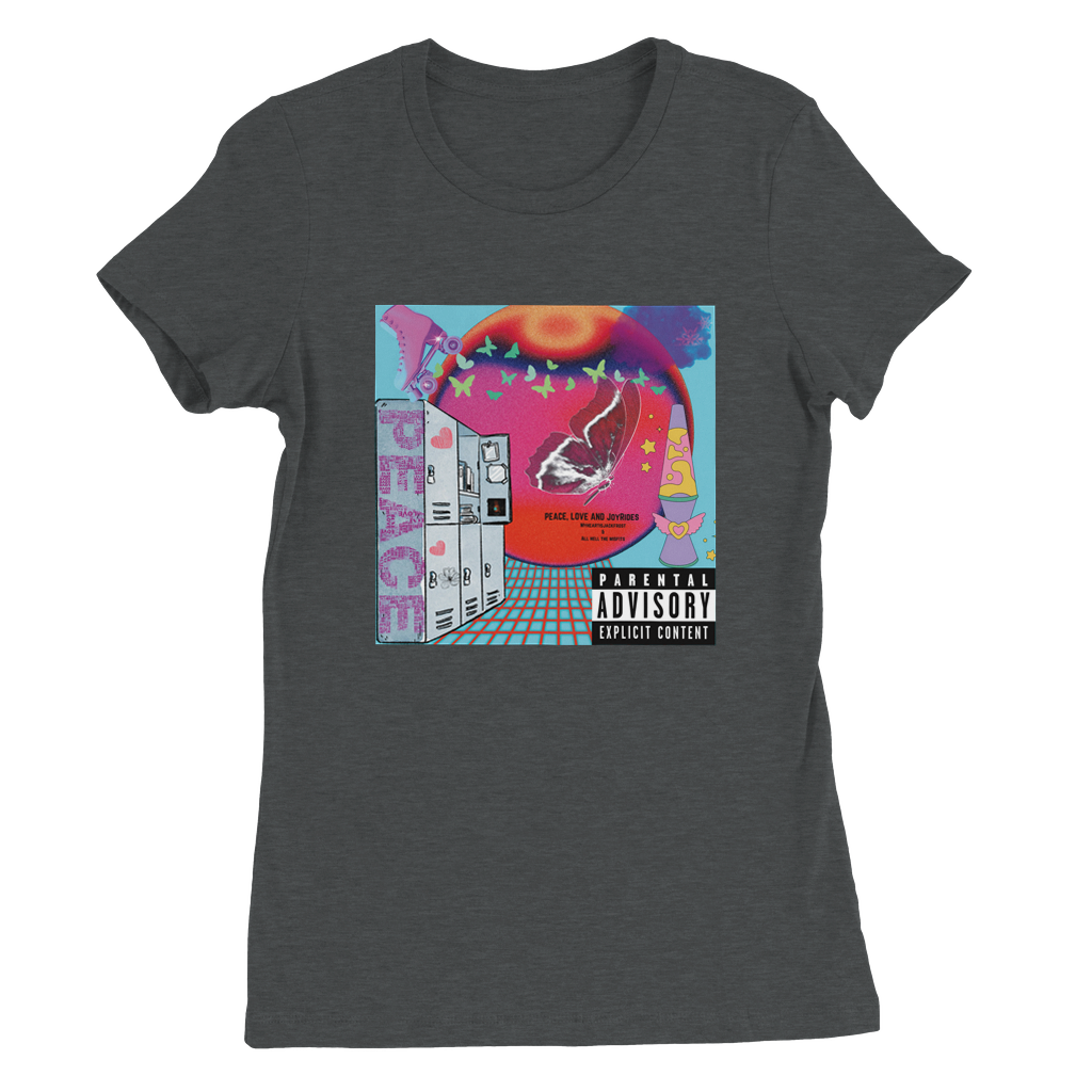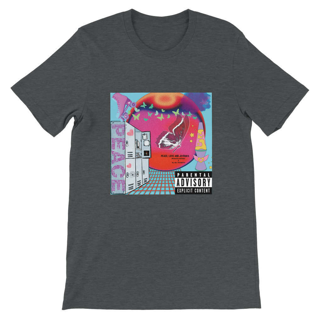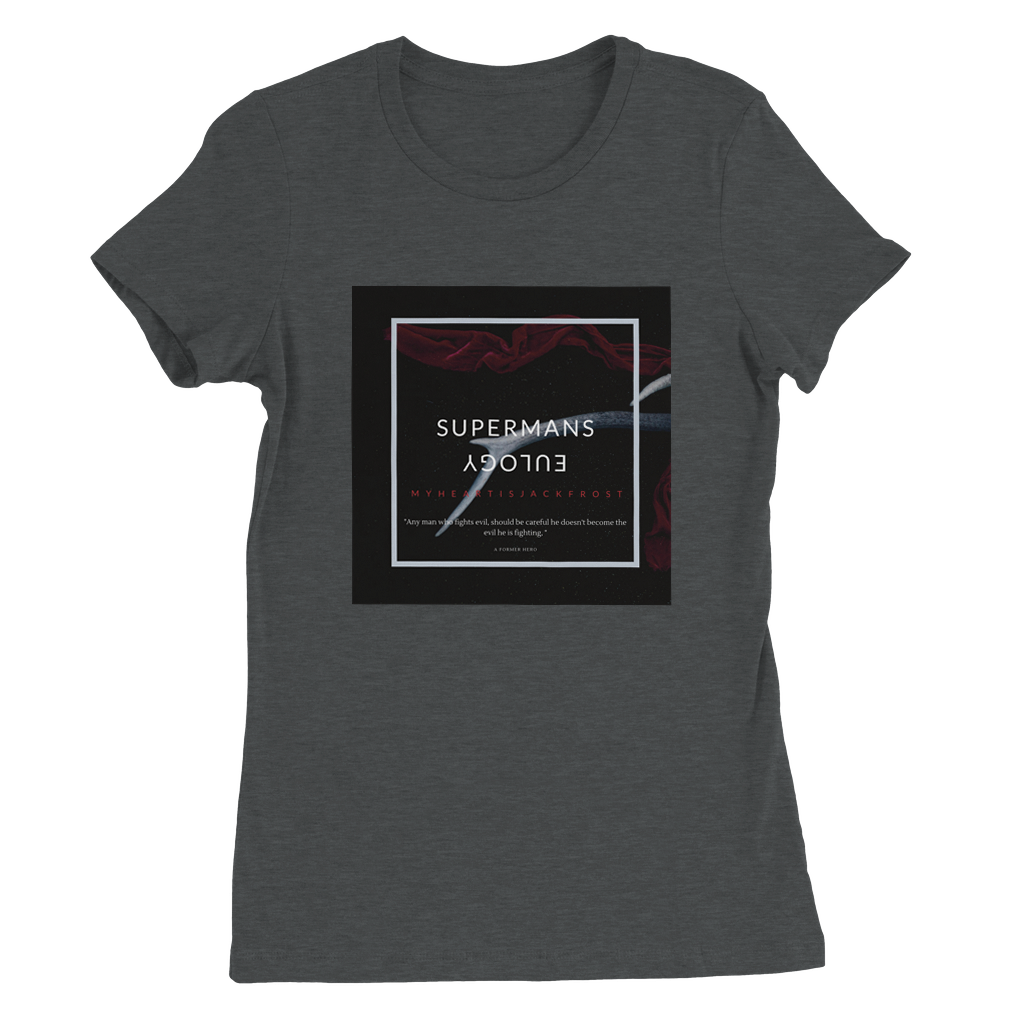 Constructed from 100% Airlume combed and ring-spun cotton, with heather/blend colors incorporating polyester. Features include side seams for a slim fit, shoulder taping, fitted sleeves, and a longer body length. Inspired by Myheartisjackfrost Harley Quinn and Joker Life