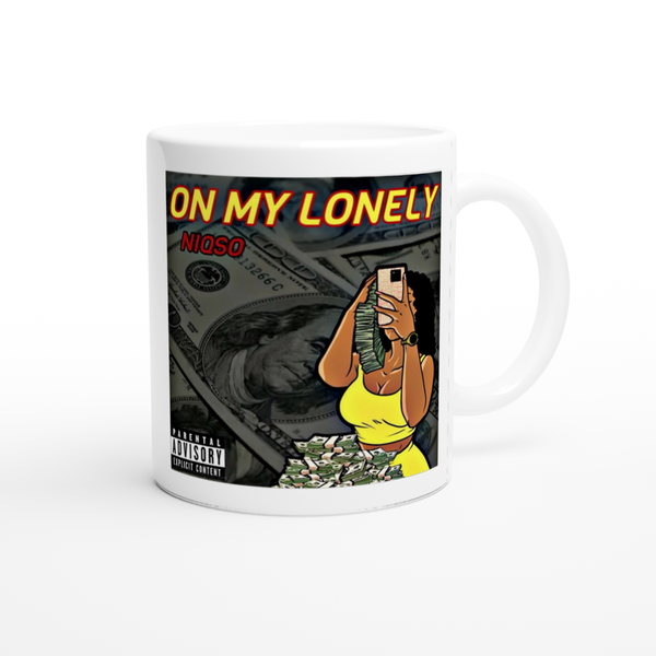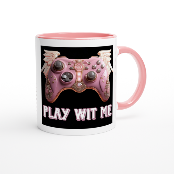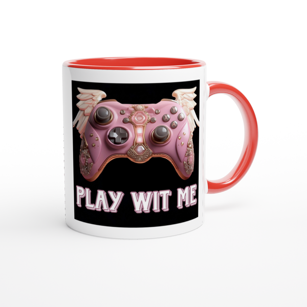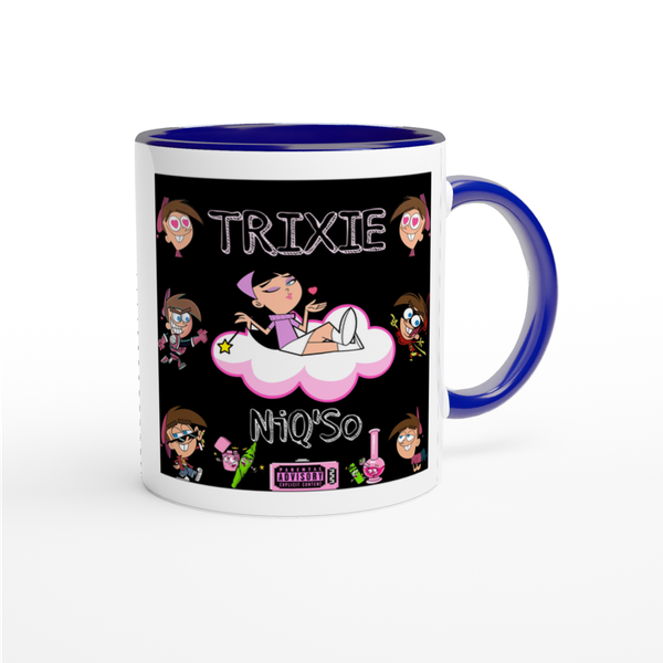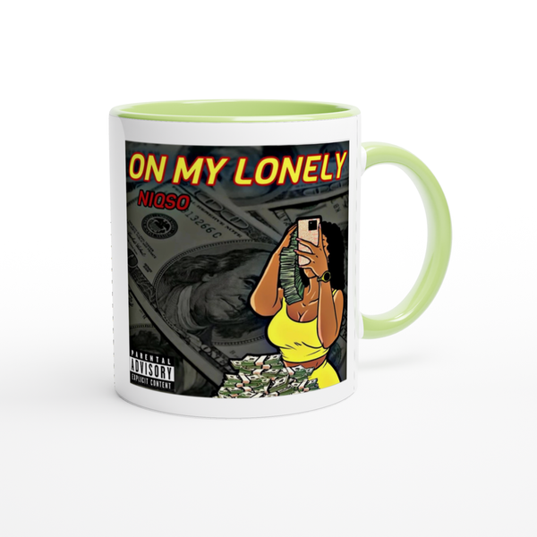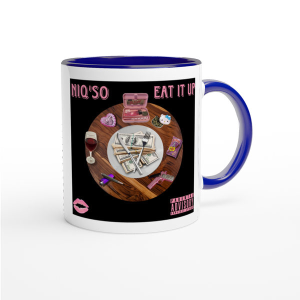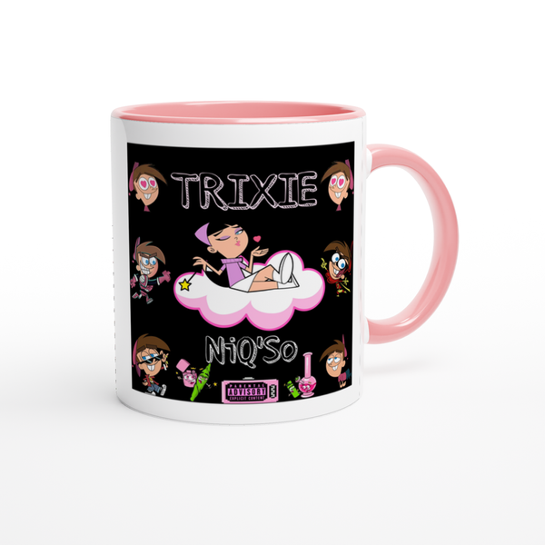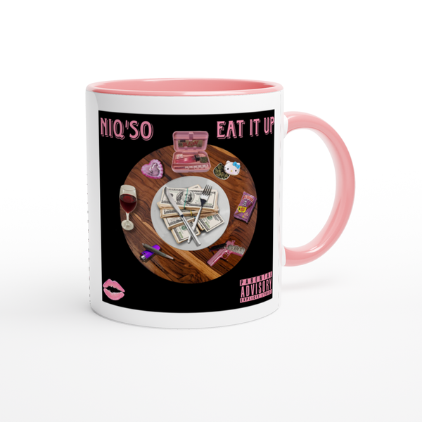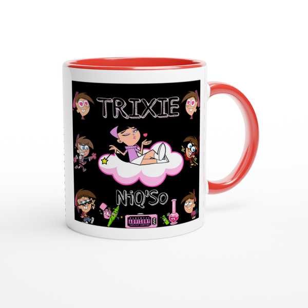 This mug is glossy white with a colored rim, inside, and handle. Microwave and dishwasher safe.