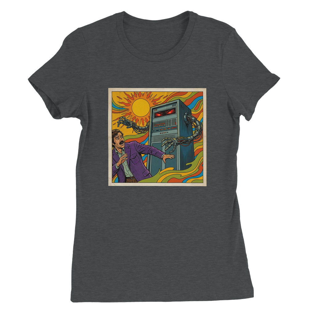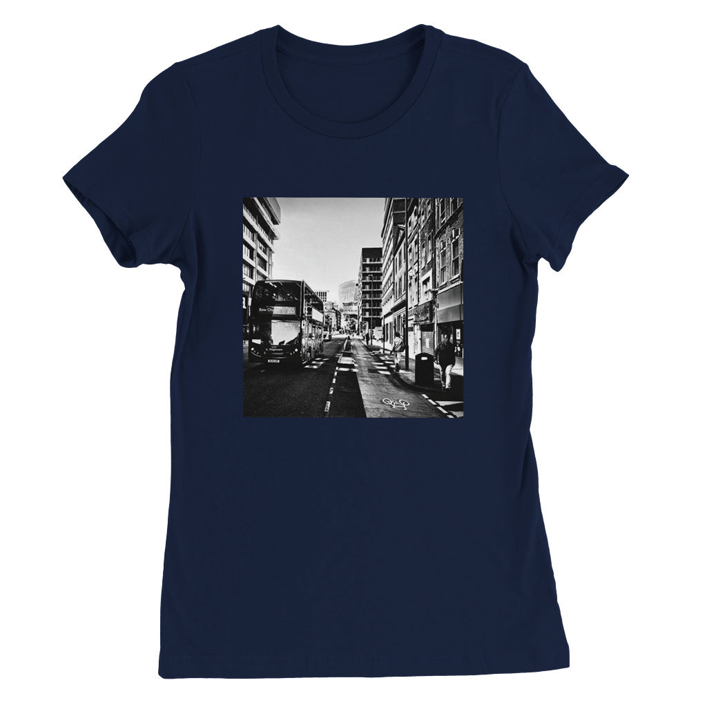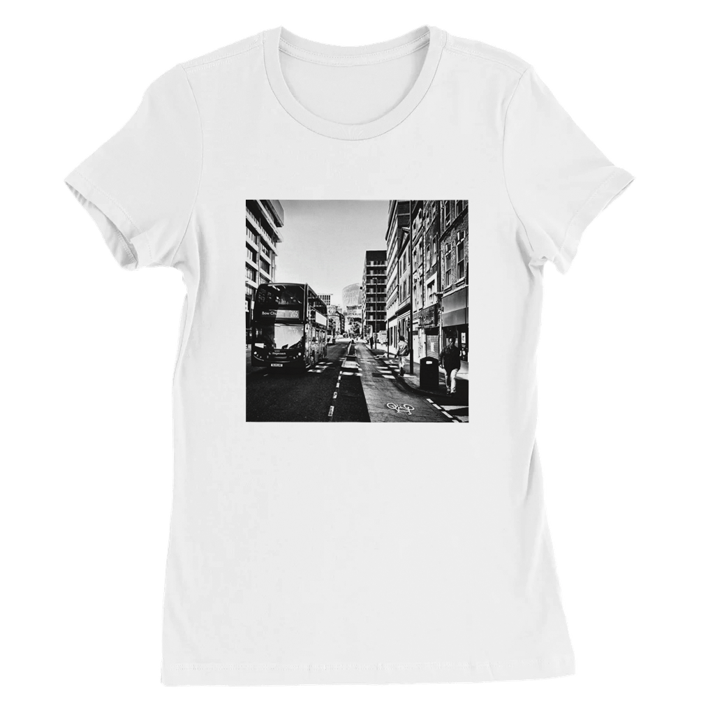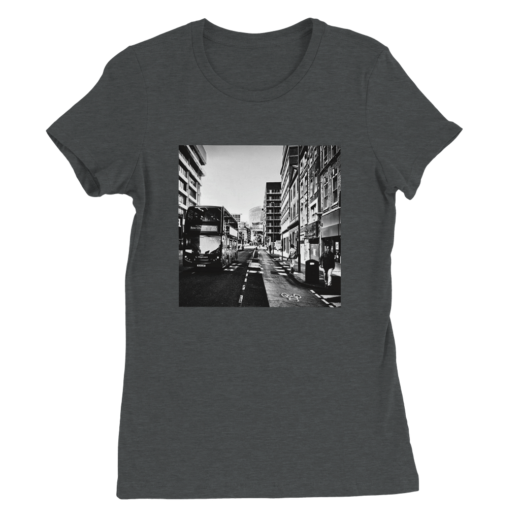 Constructed from 100% Airlume combed and ring-spun cotton, with heather/blend colors incorporating polyester. Features include side seams for a slim fit, shoulder taping, fitted sleeves, and a longer body length.