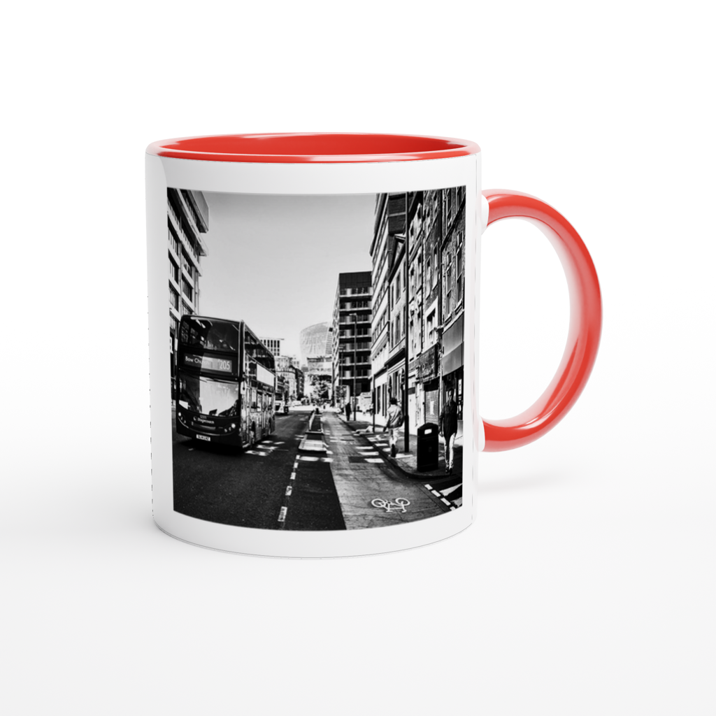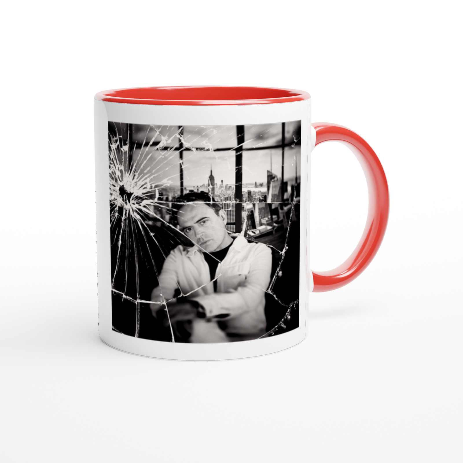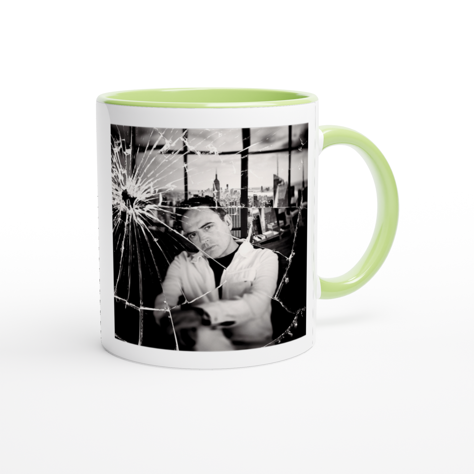 This mug is glossy white with a colored rim, inside, and handle. Microwave and dishwasher safe.