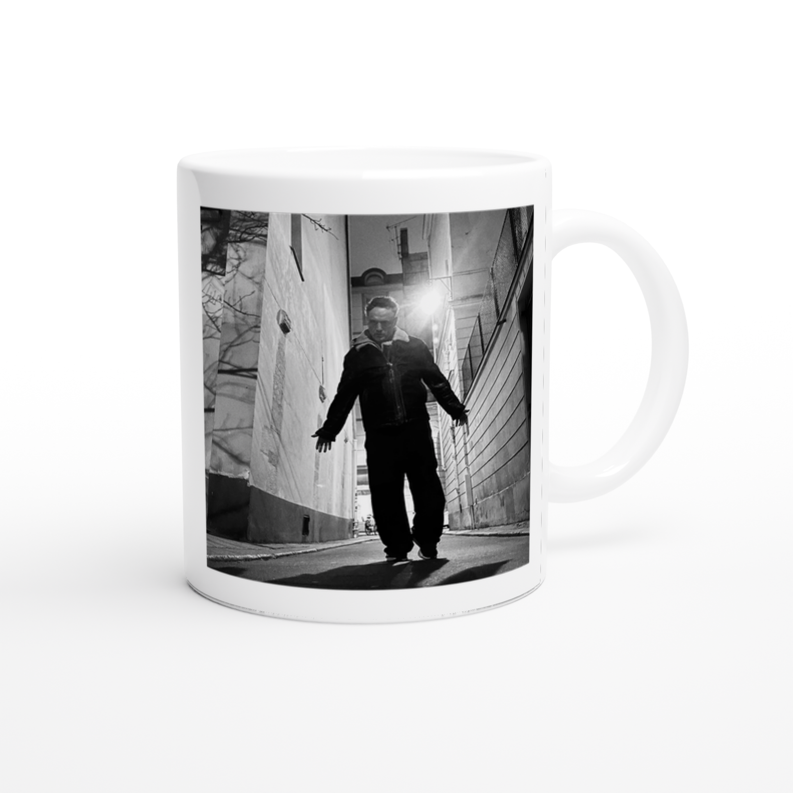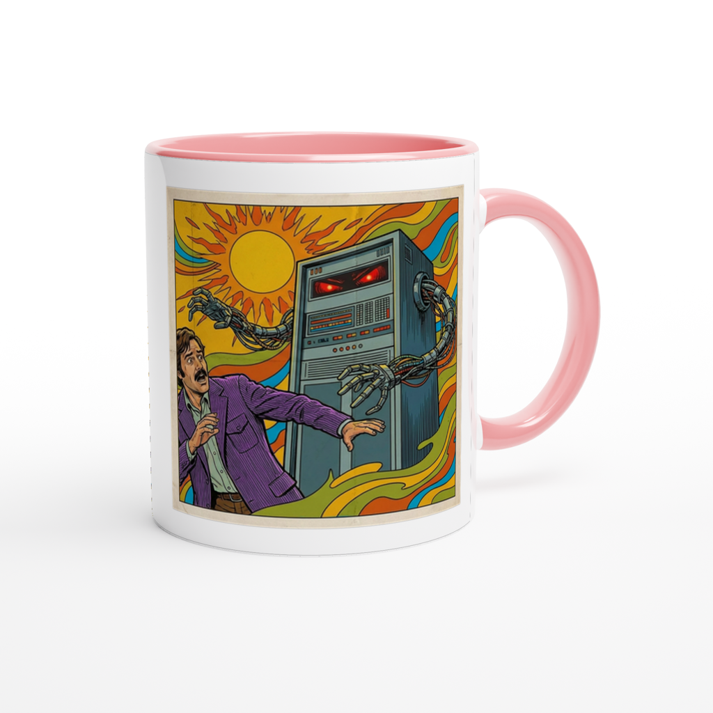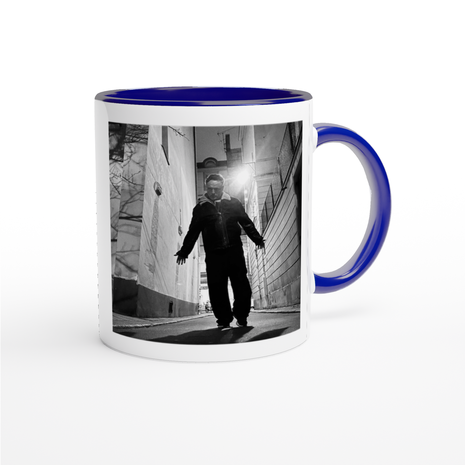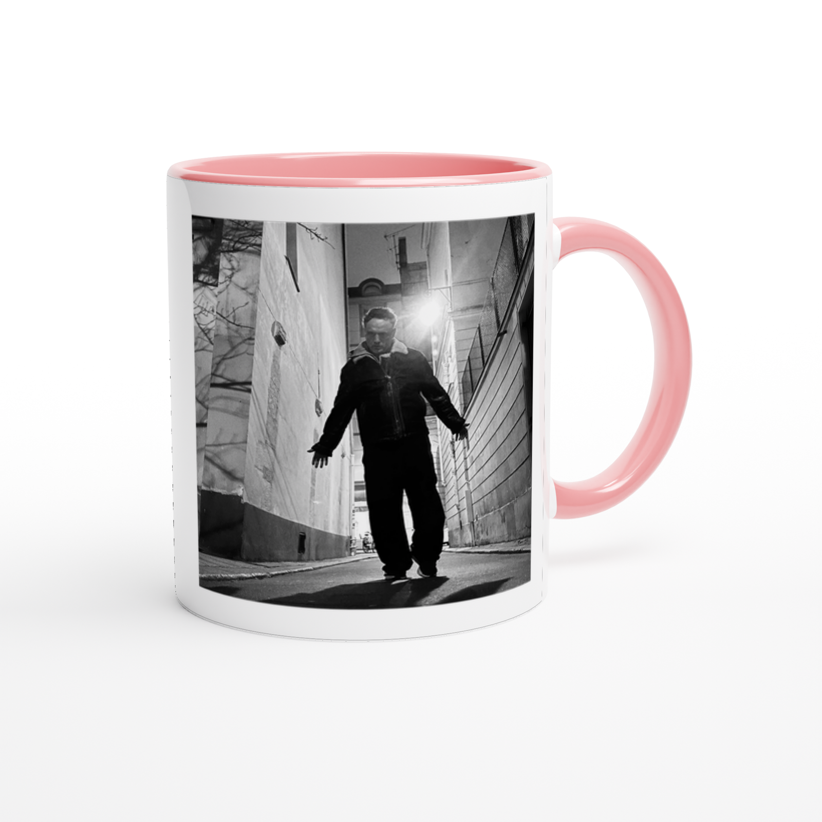 This mug is glossy white with a colored rim, inside, and handle. Microwave and dishwasher safe.