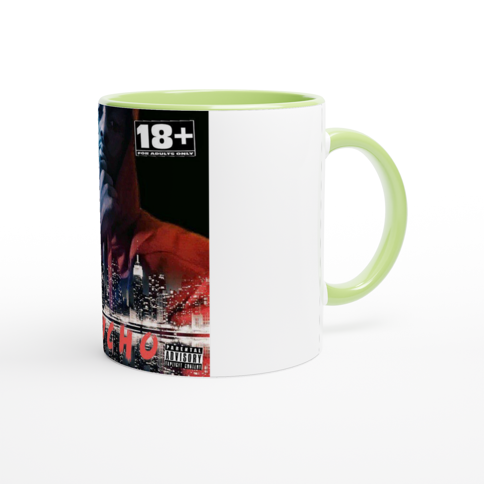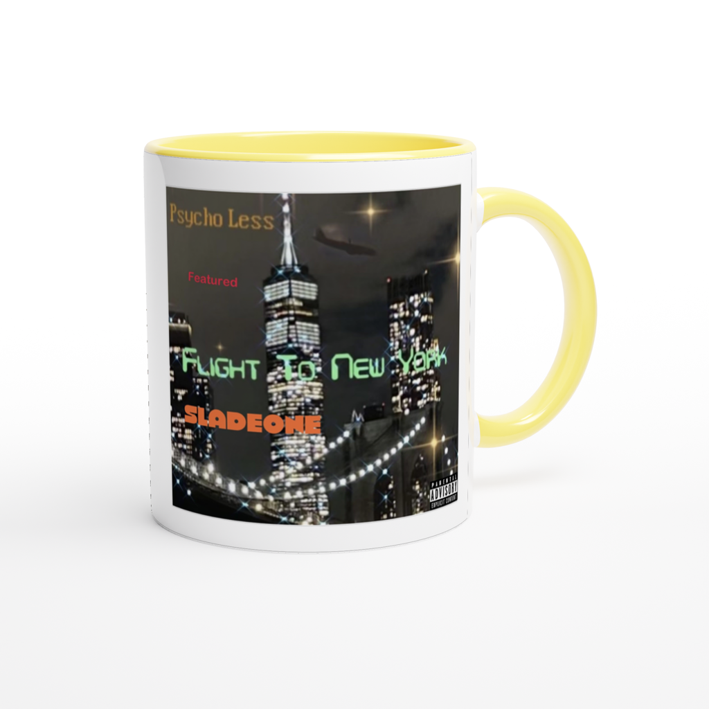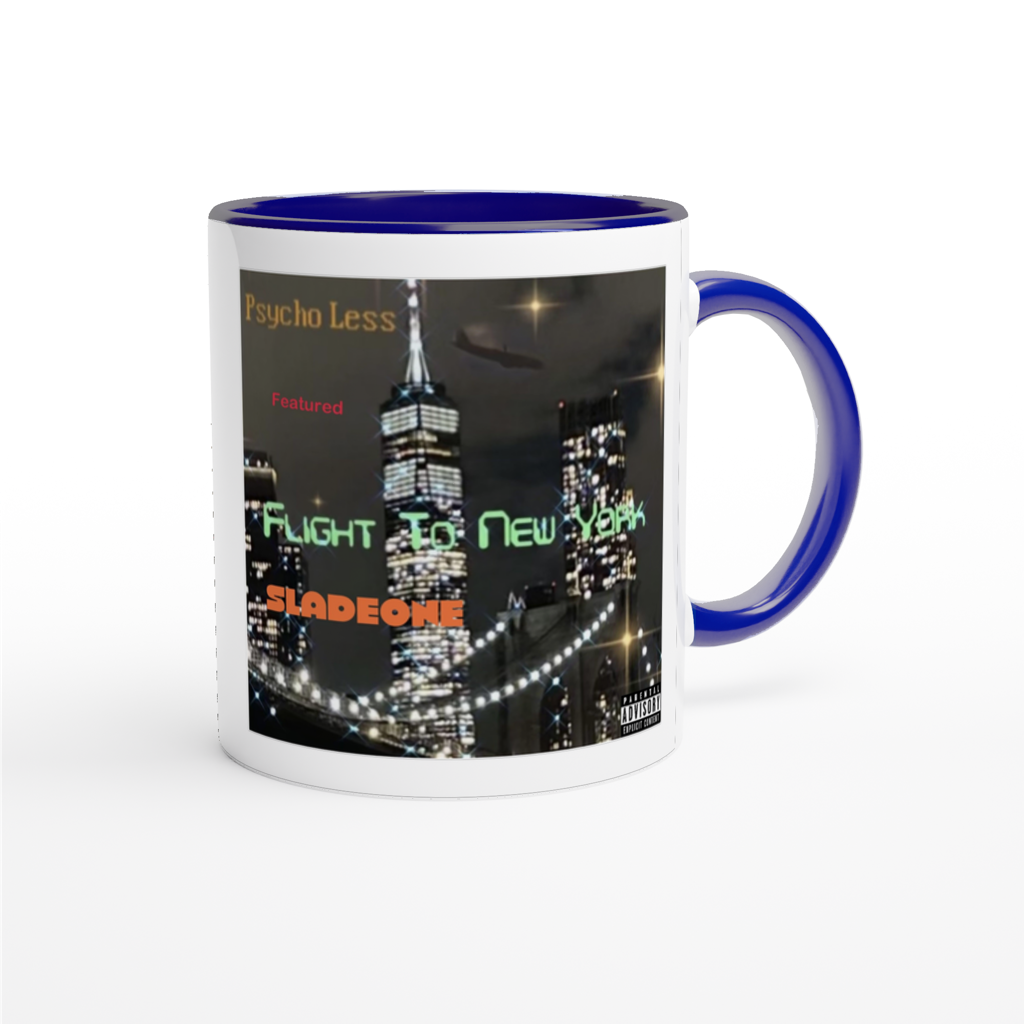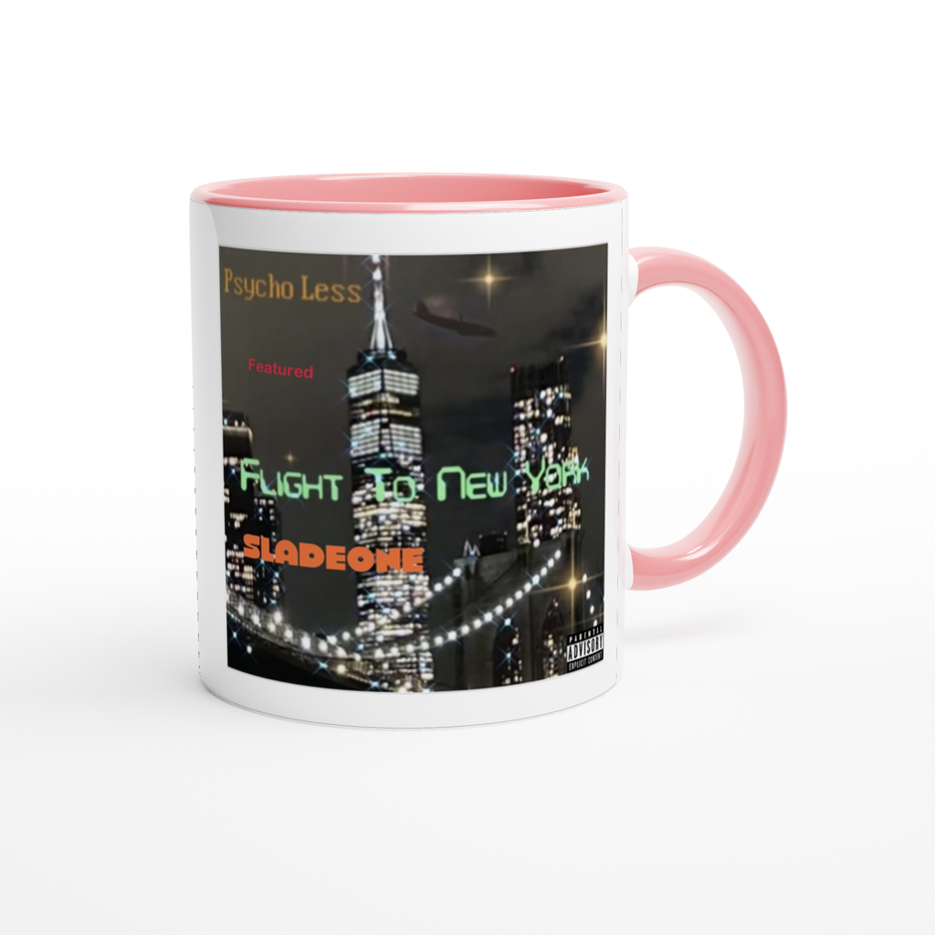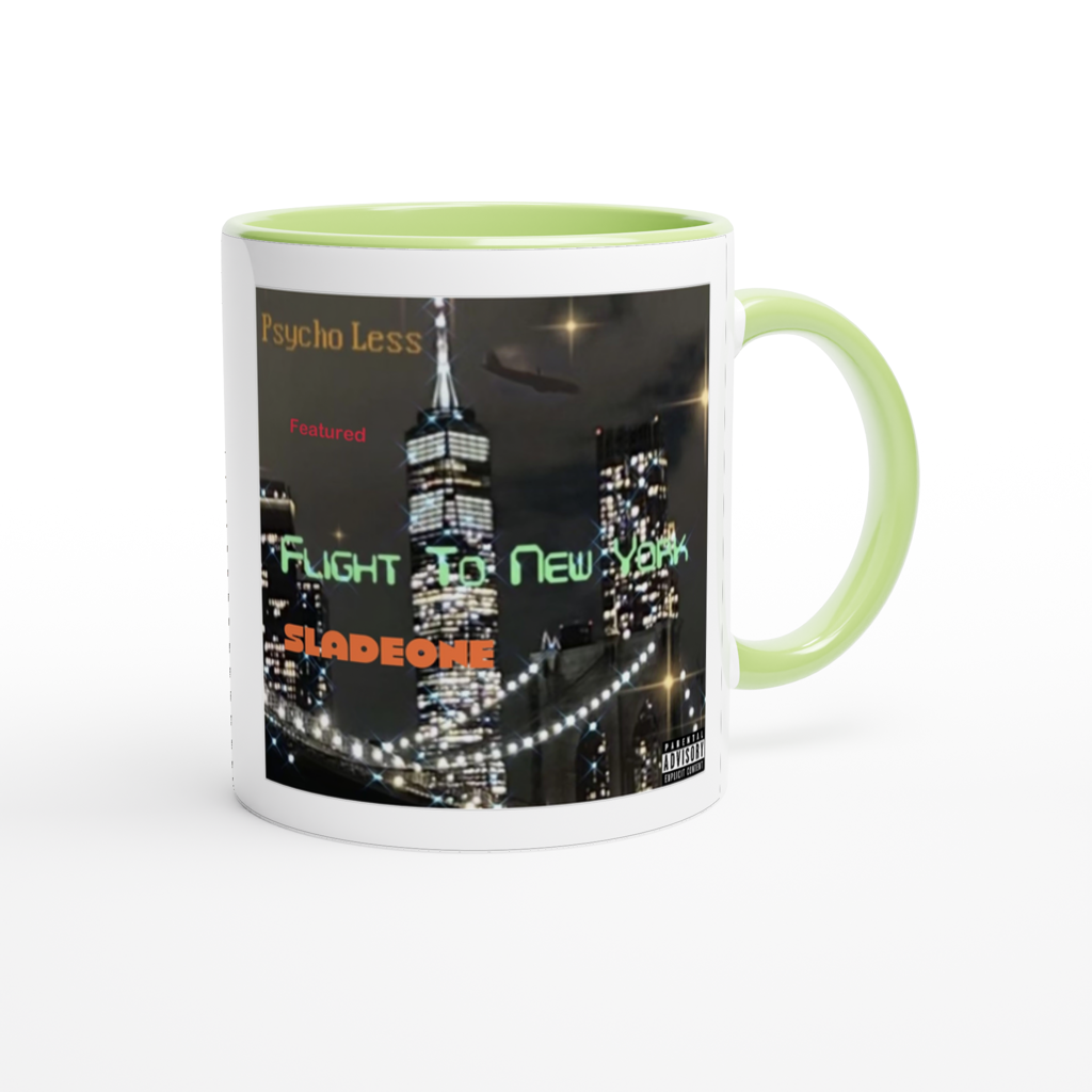 This mug is glossy white with a colored rim, inside, and handle. Microwave and dishwasher safe.