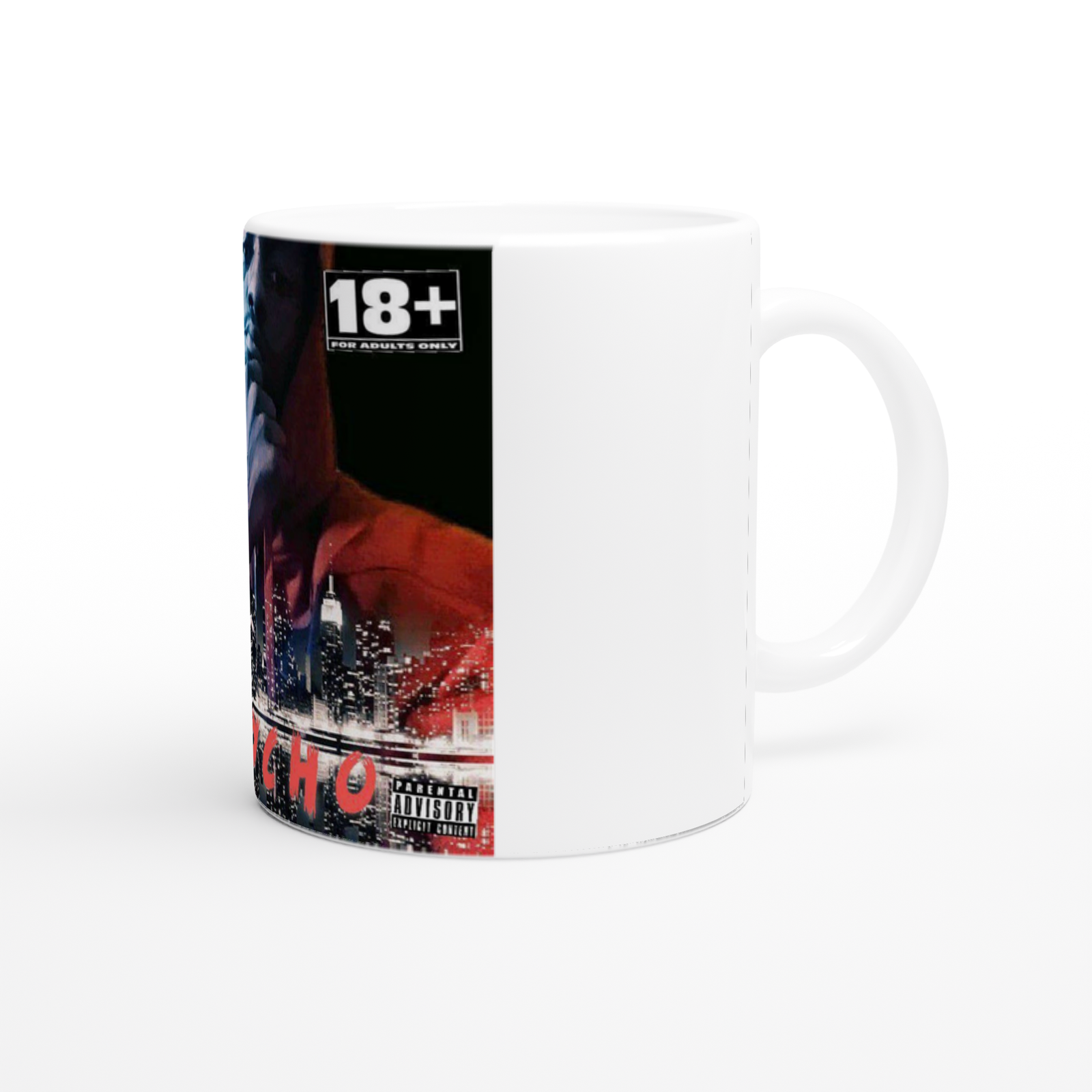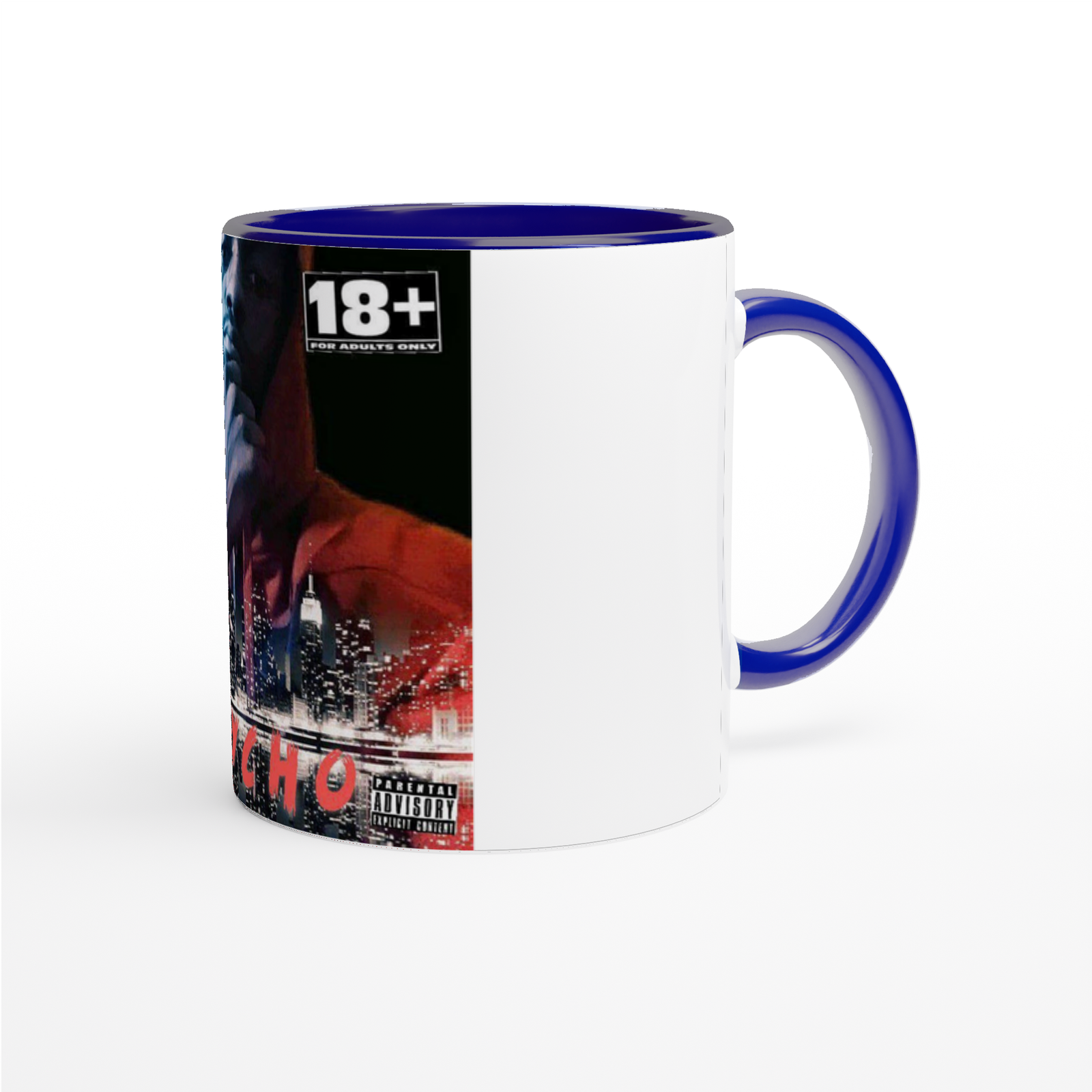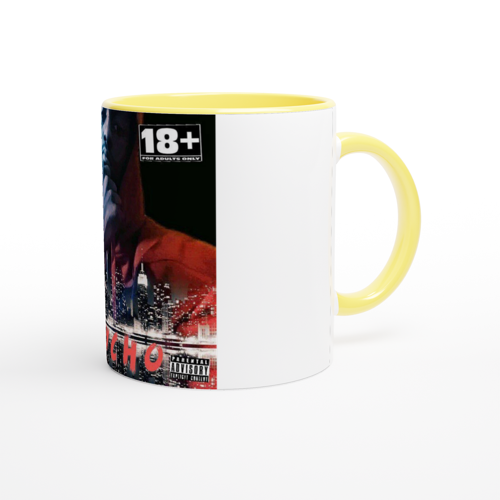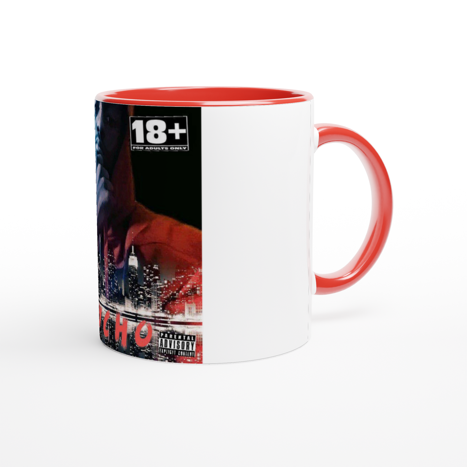 This mug is glossy white with a colored rim, inside, and handle. Microwave and dishwasher safe.
