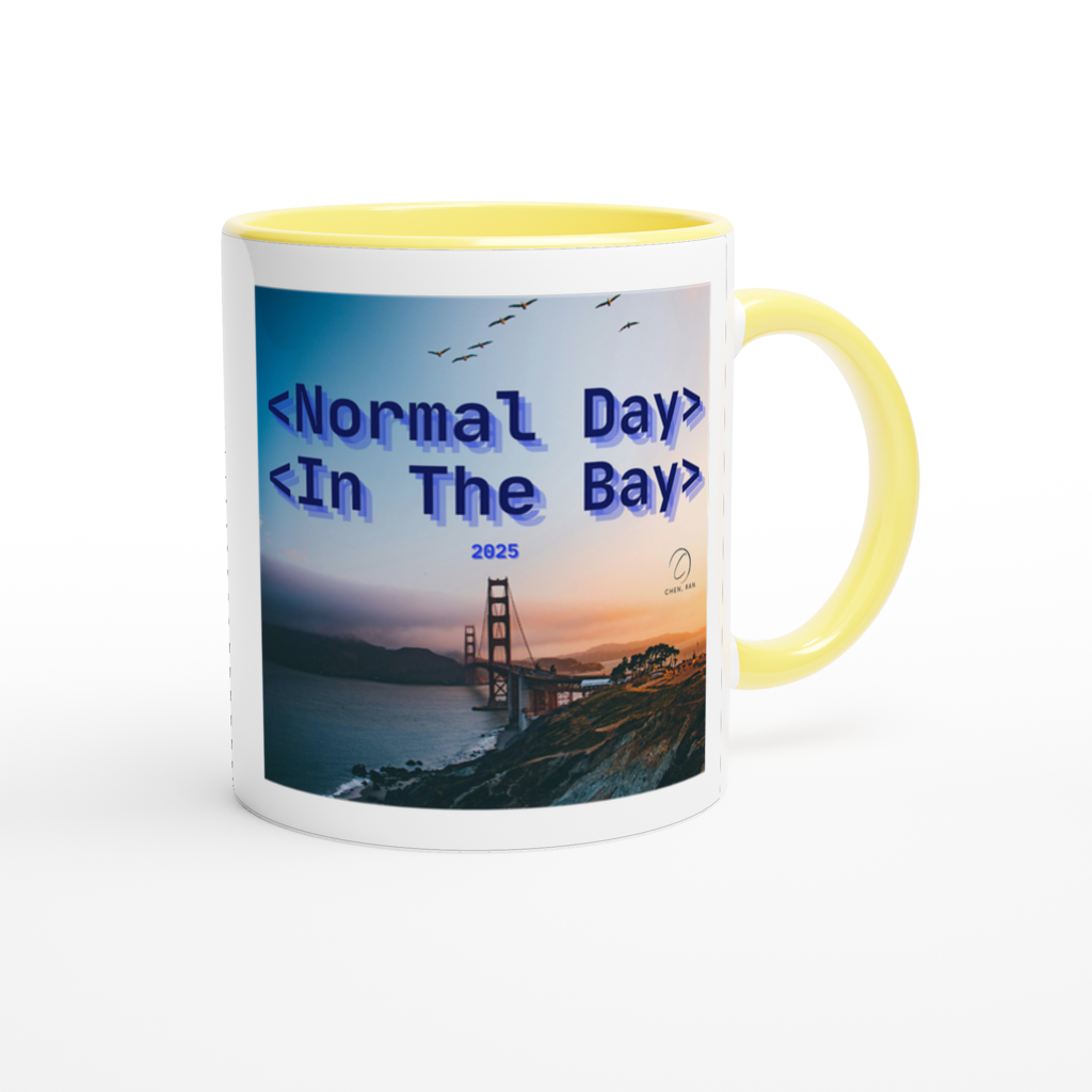 This mug is glossy white with a colored rim, inside, and handle. Microwave and dishwasher safe.