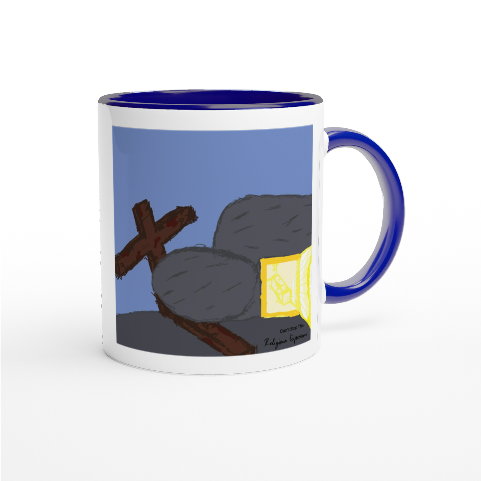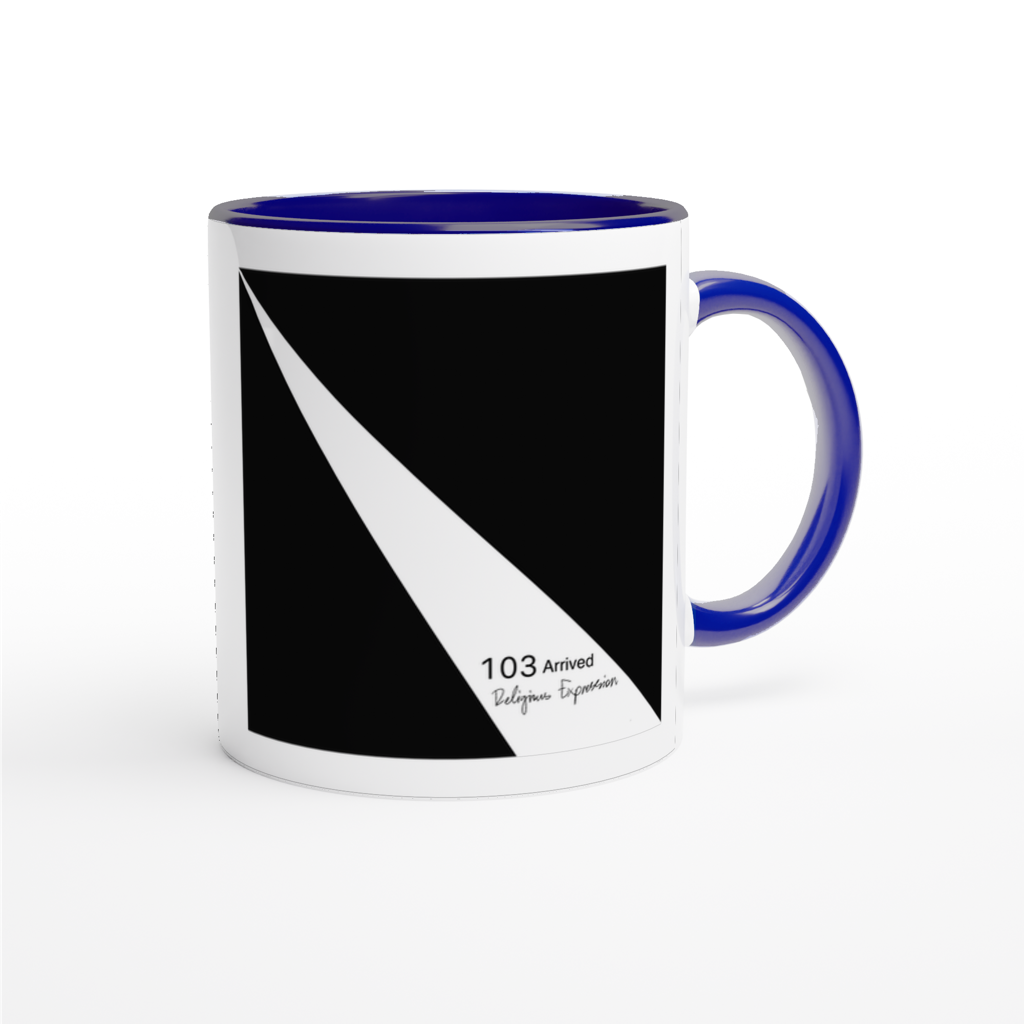 This mug is glossy white with a colored rim, inside, and handle. Microwave and dishwasher safe.