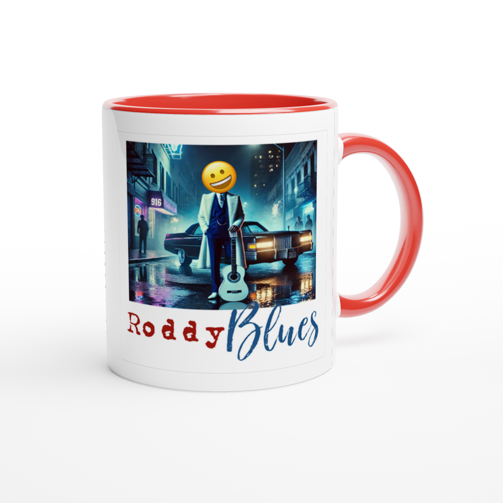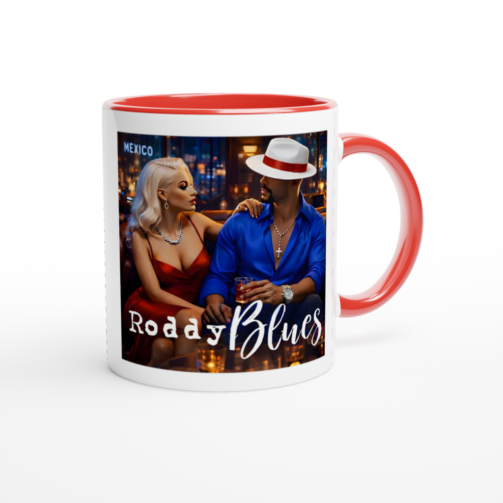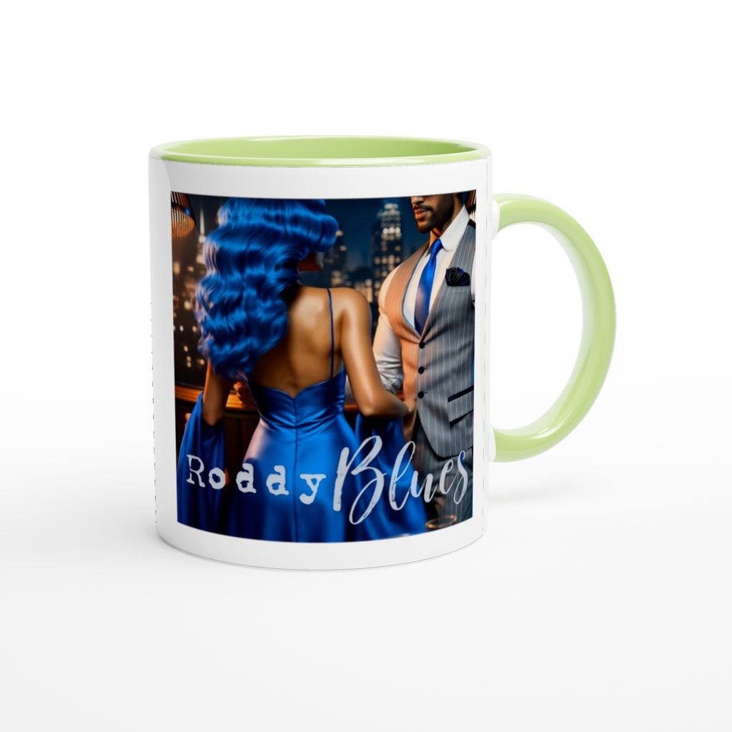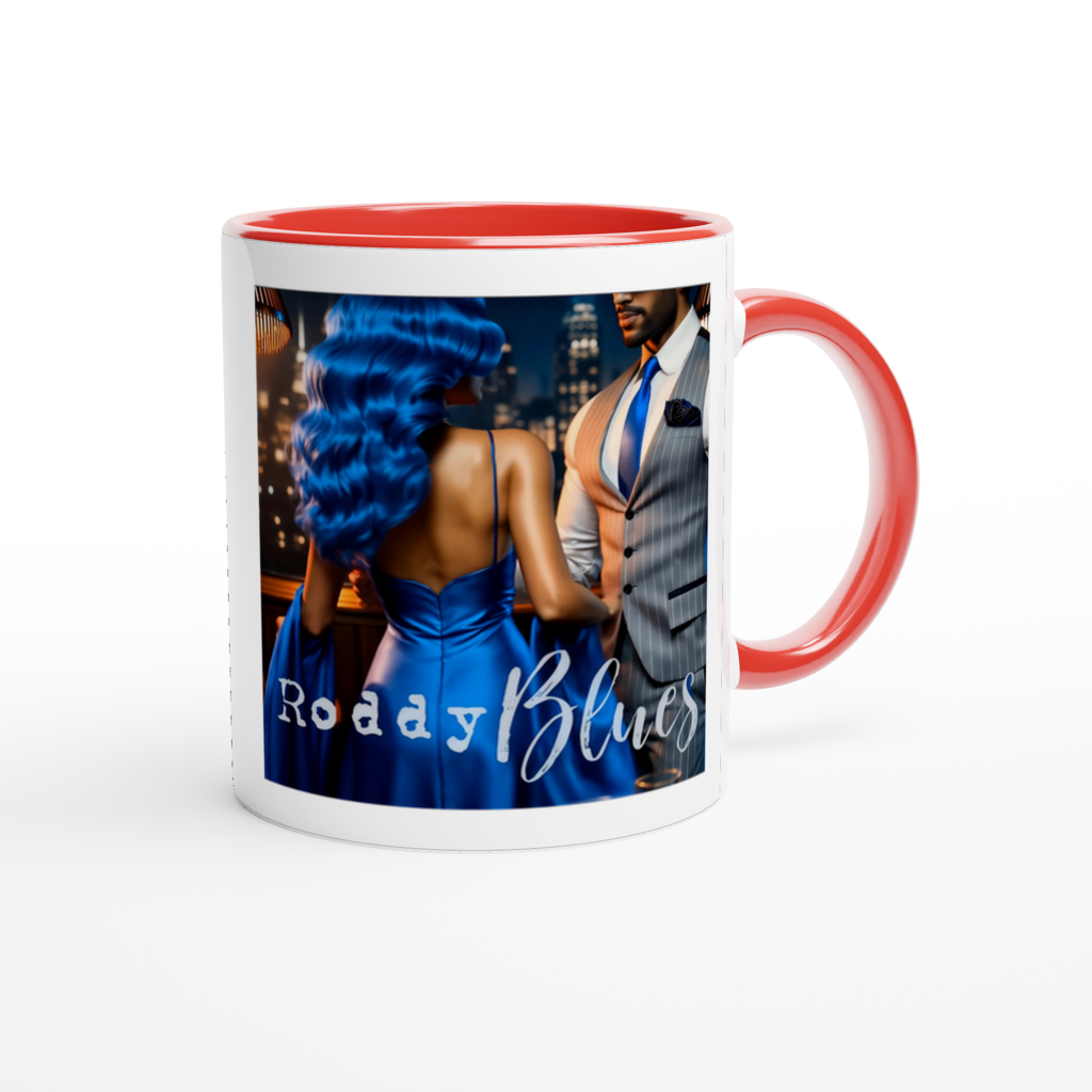 This mug is glossy white with a colored rim, inside, and handle. Microwave and dishwasher safe.