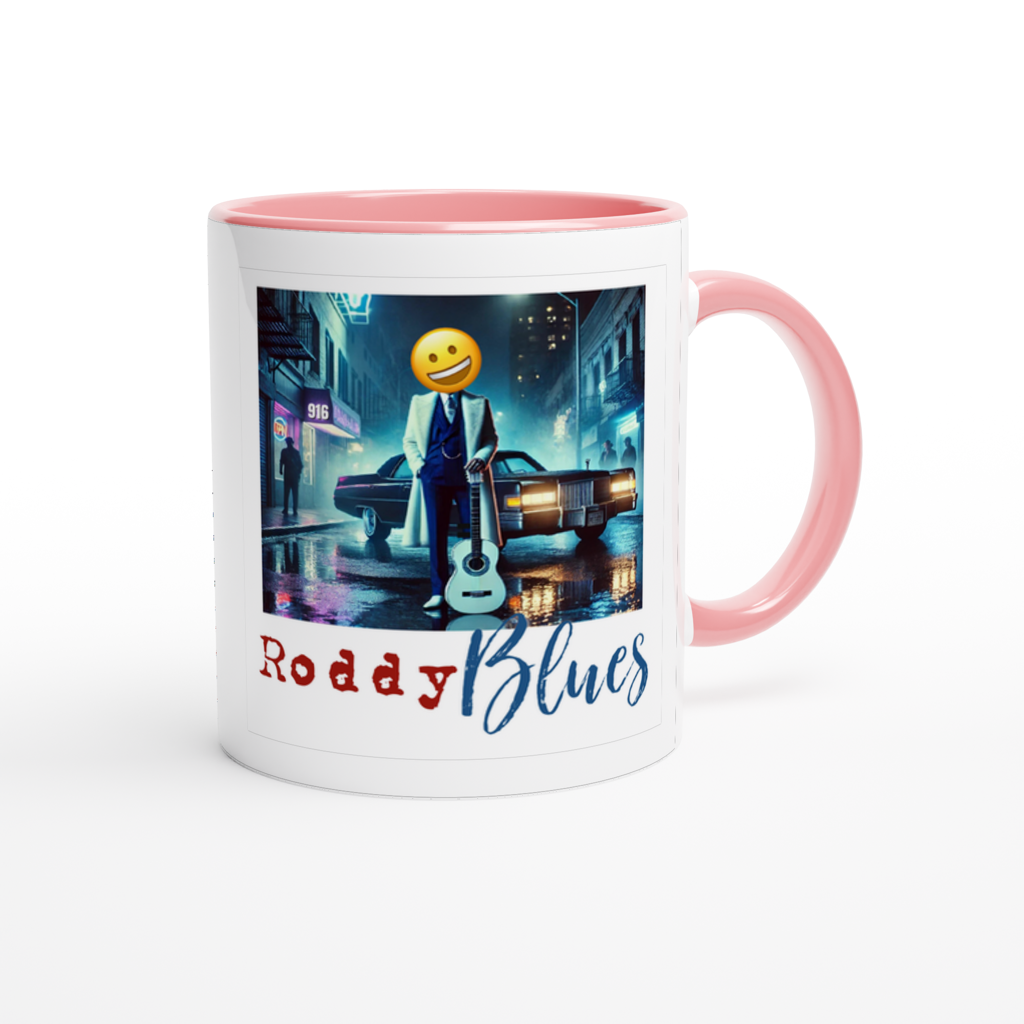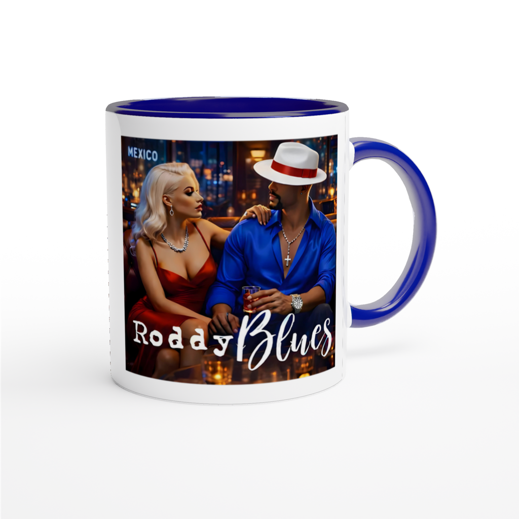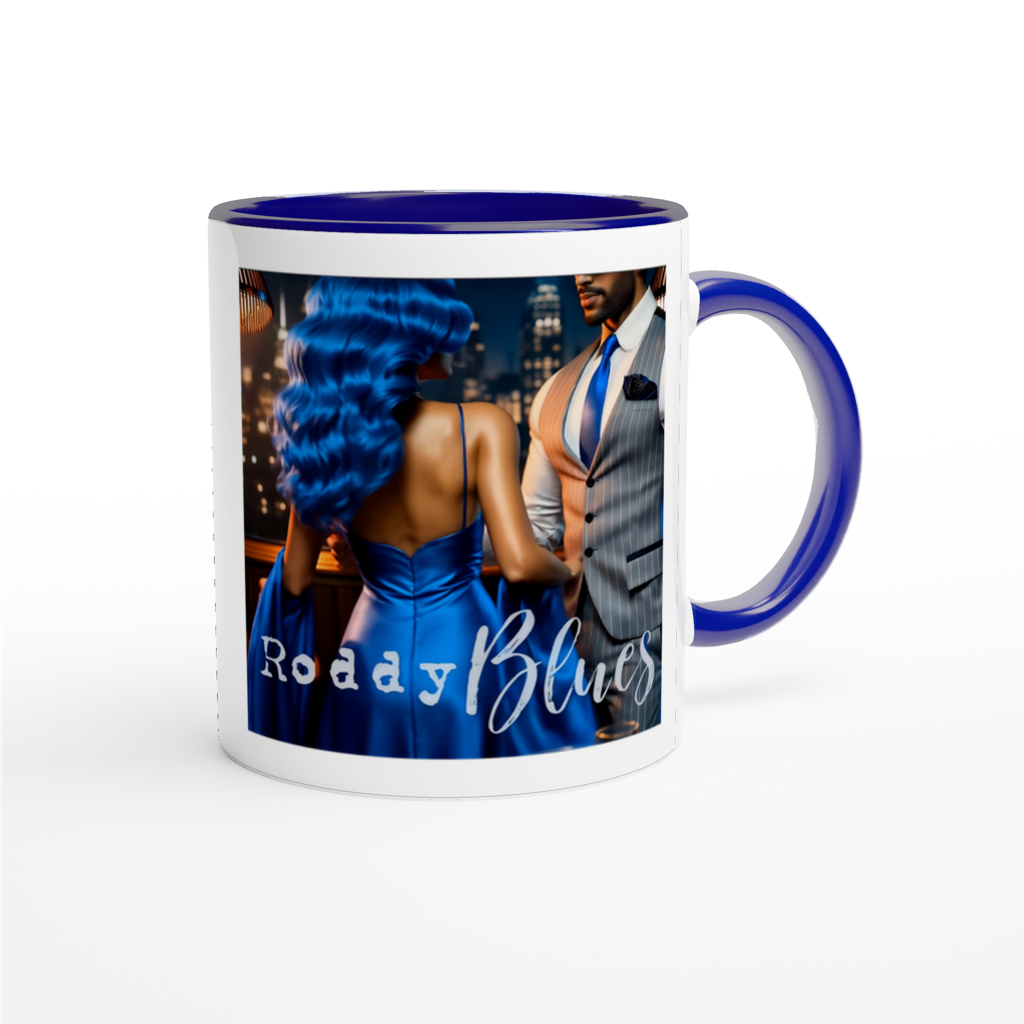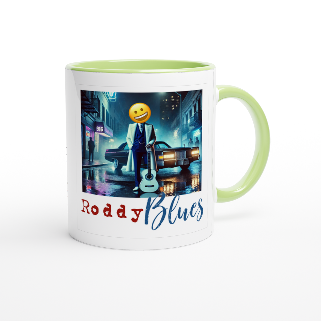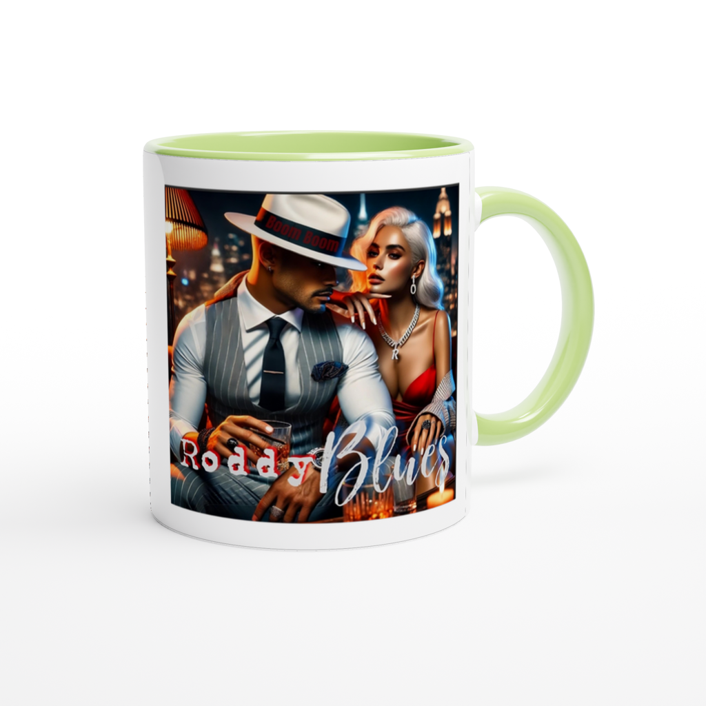 This mug is glossy white with a colored rim, inside, and handle. Microwave and dishwasher safe.