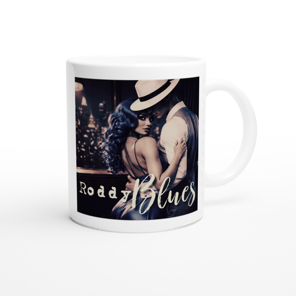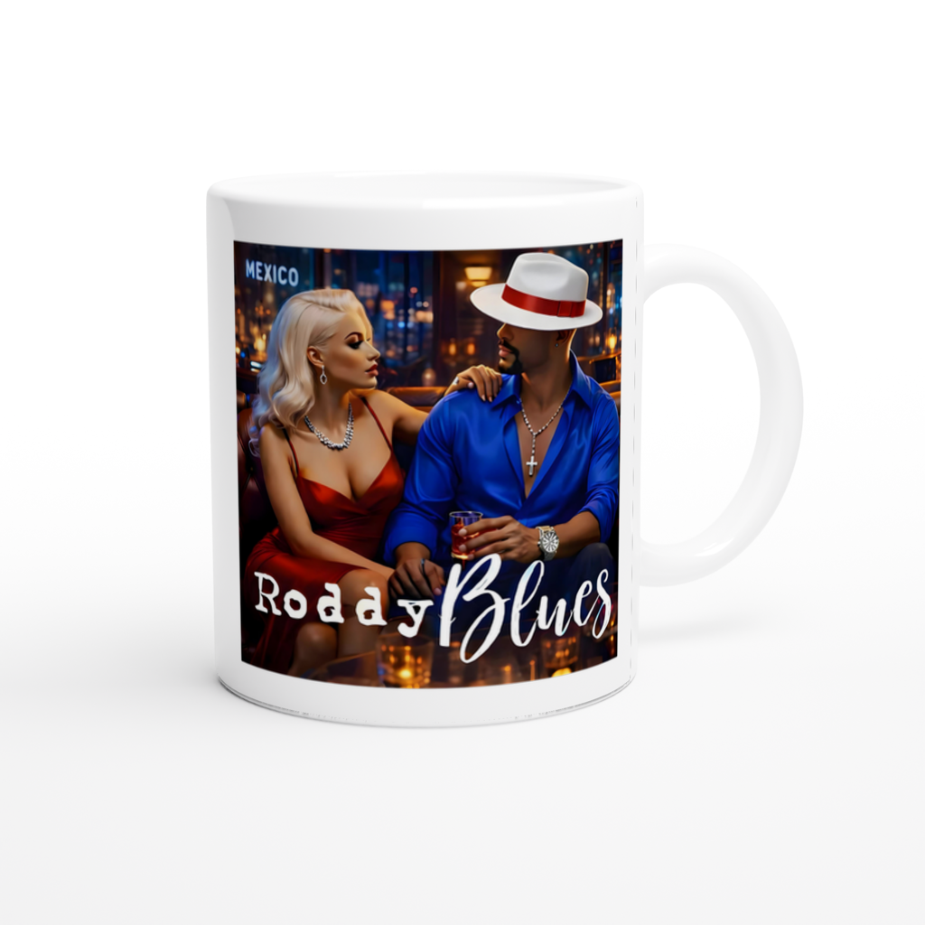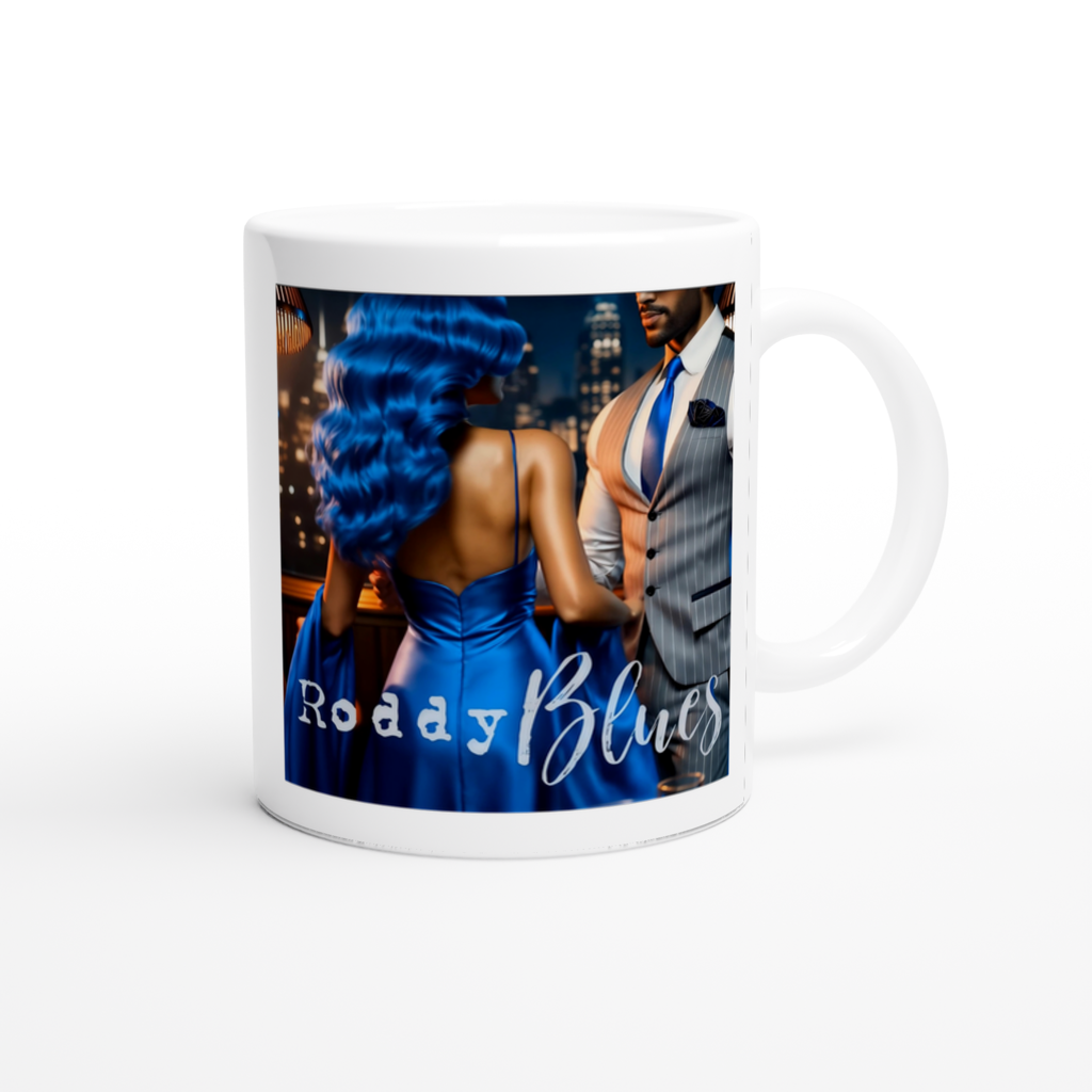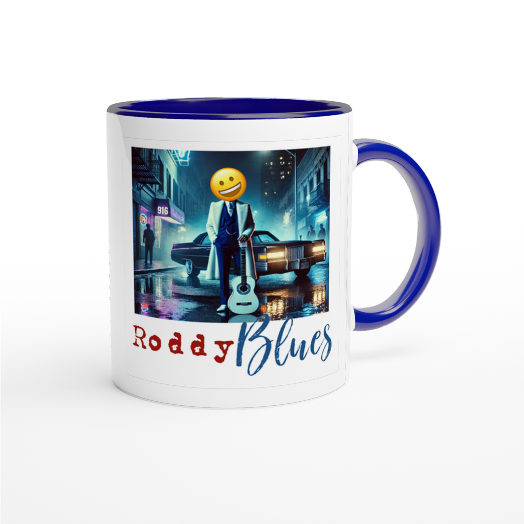 This mug is glossy white with a colored rim, inside, and handle. Microwave and dishwasher safe.