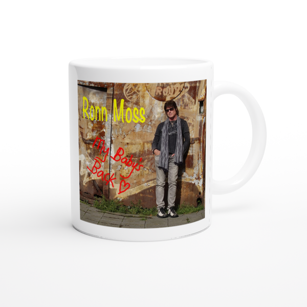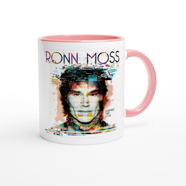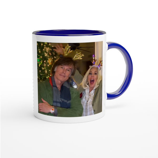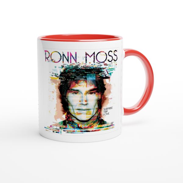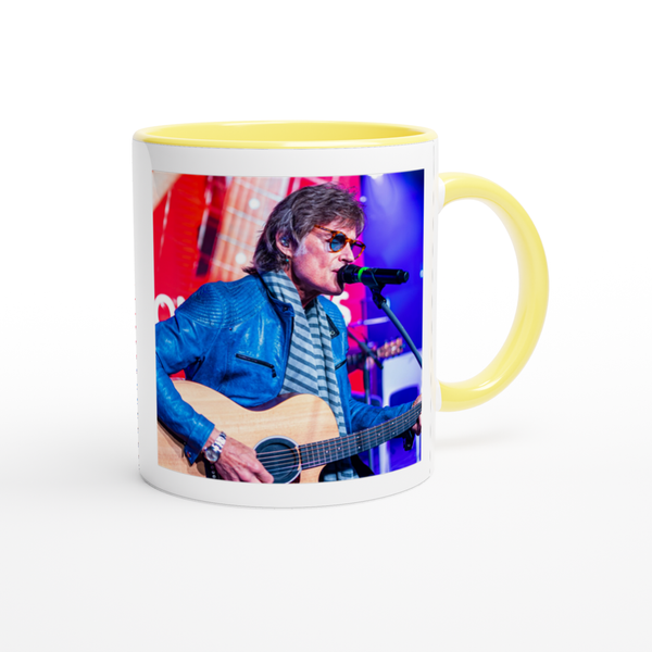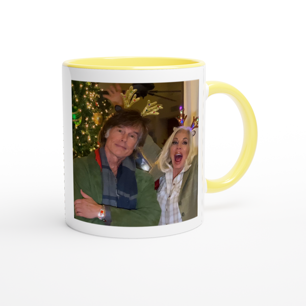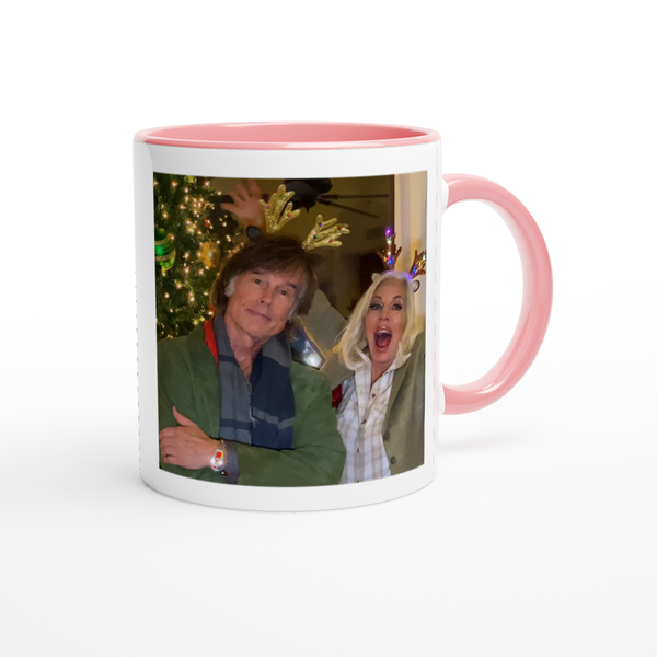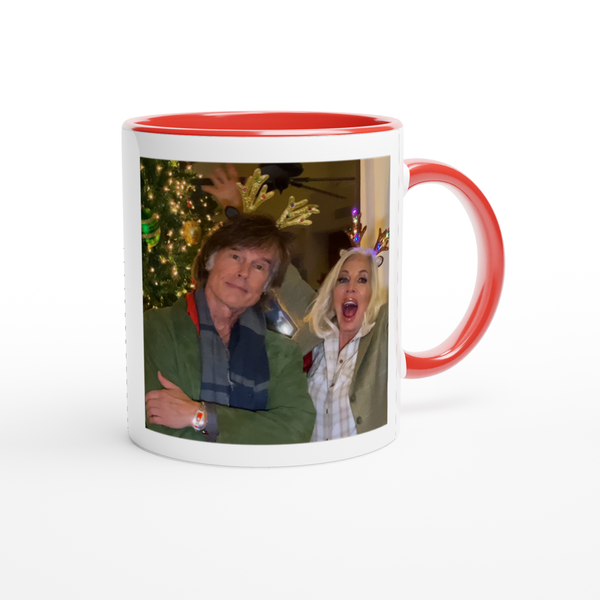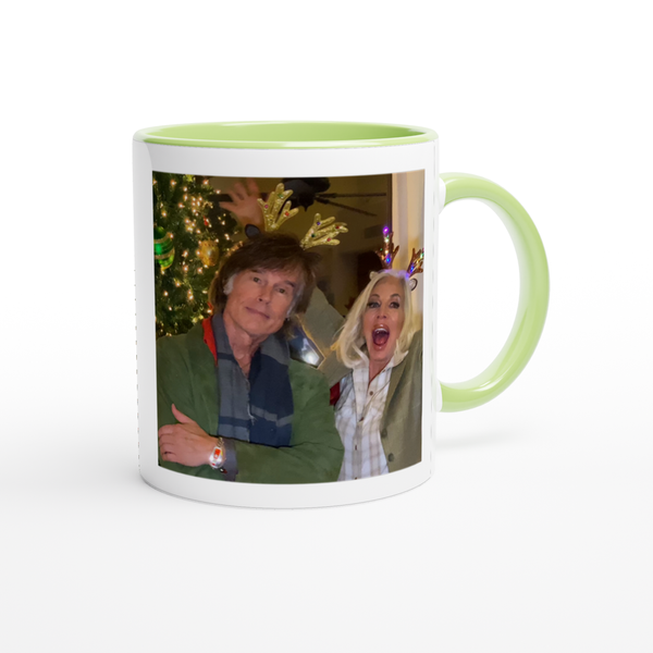 This mug is glossy white with a colored rim, inside, and handle. Microwave and dishwasher safe.