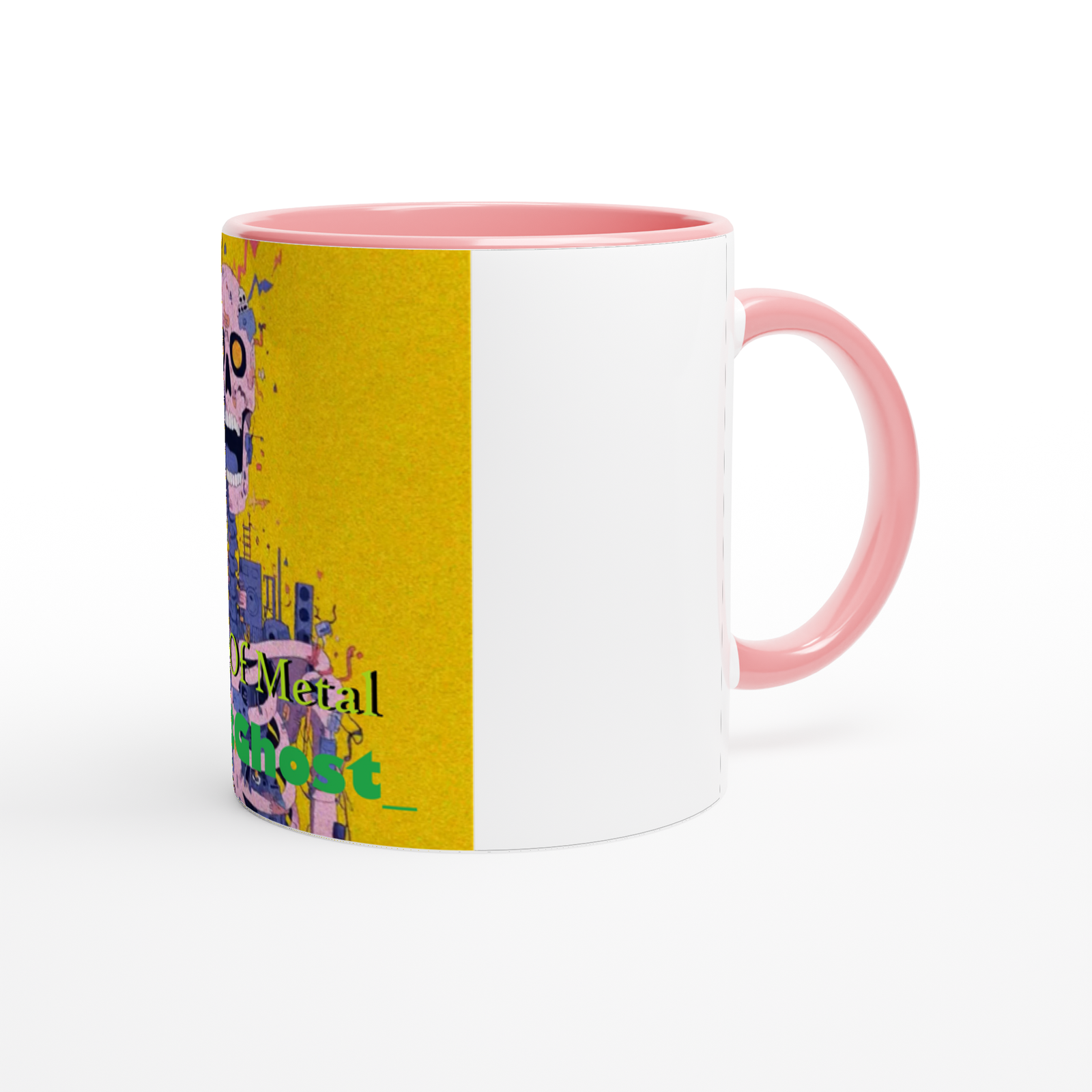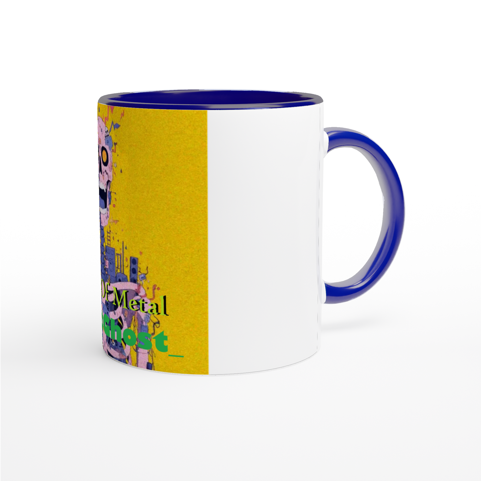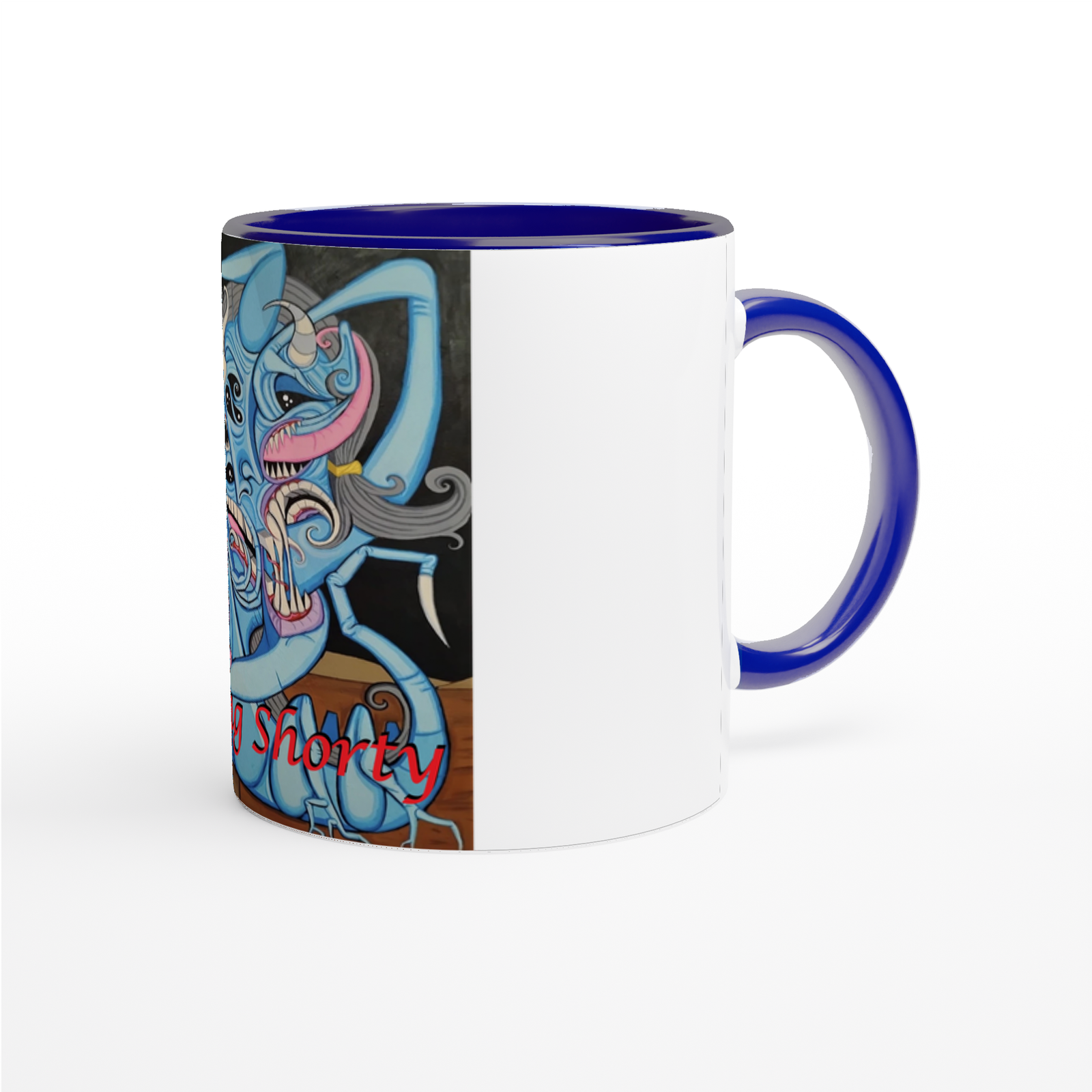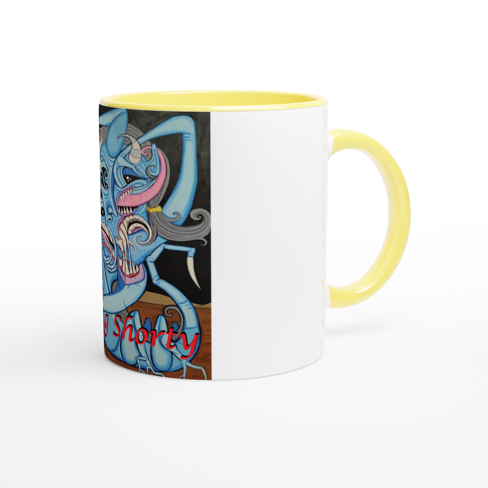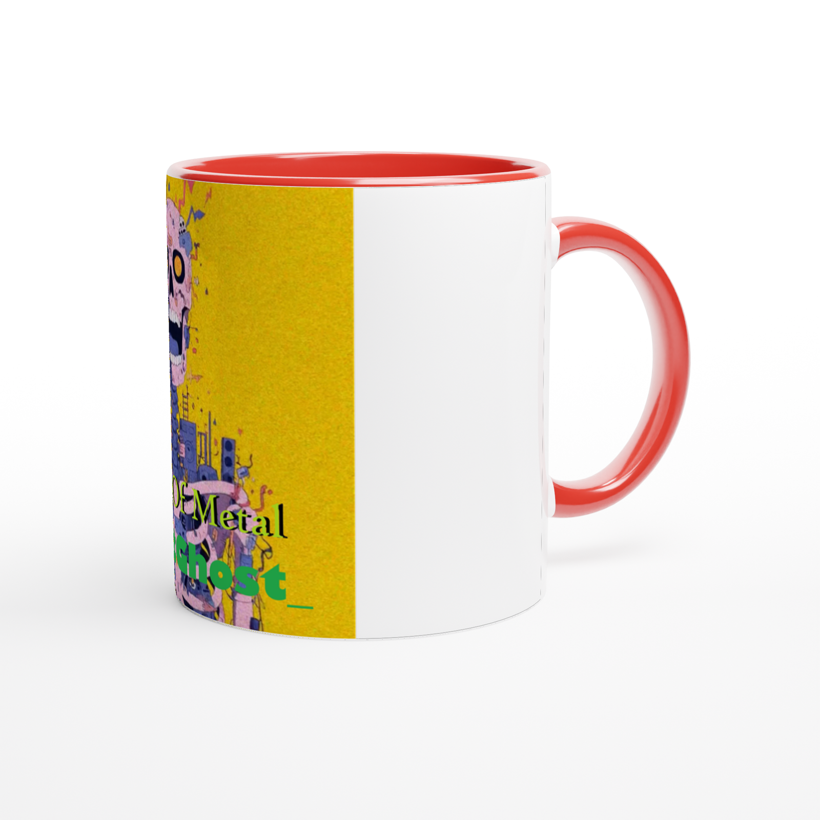 This mug is glossy white with a colored rim, inside, and handle. Microwave and dishwasher safe.
