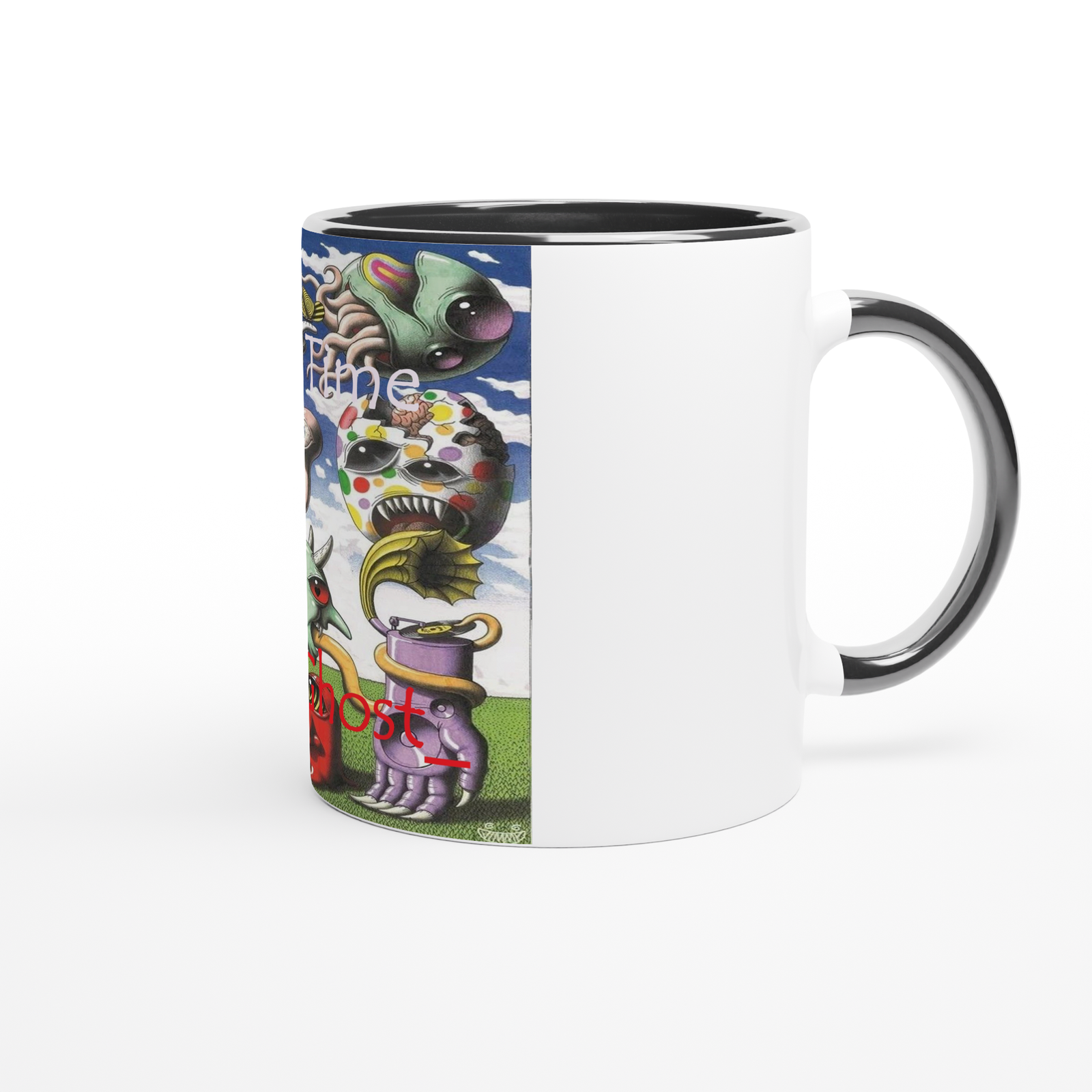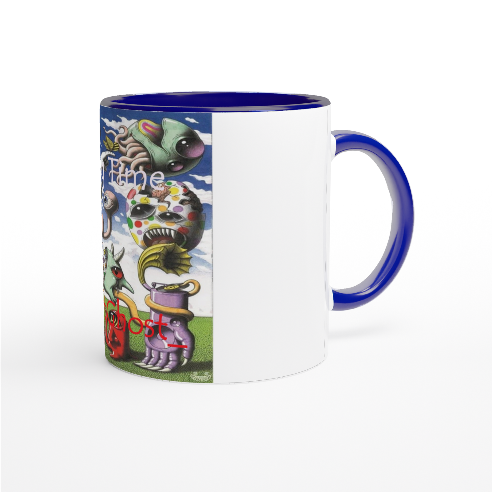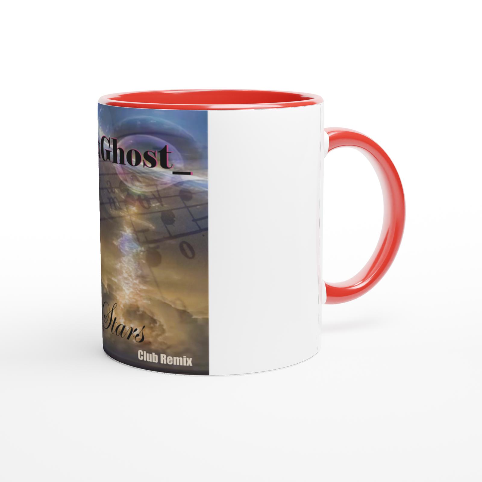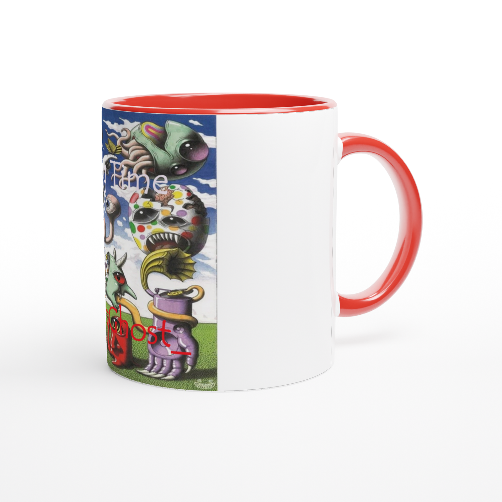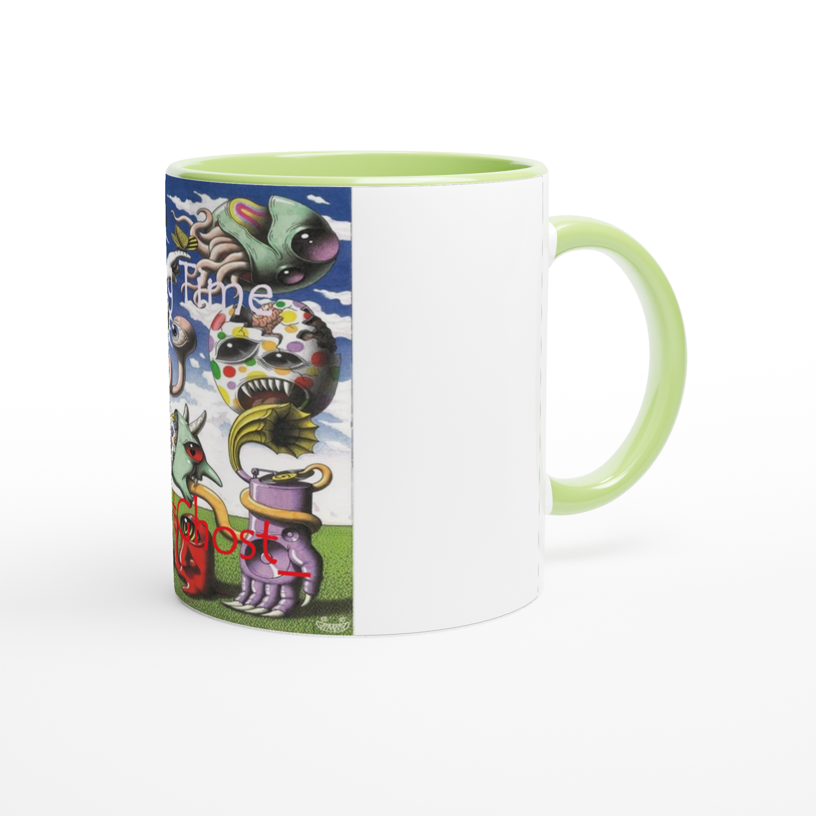 This mug is glossy white with a colored rim, inside, and handle. Microwave and dishwasher safe.