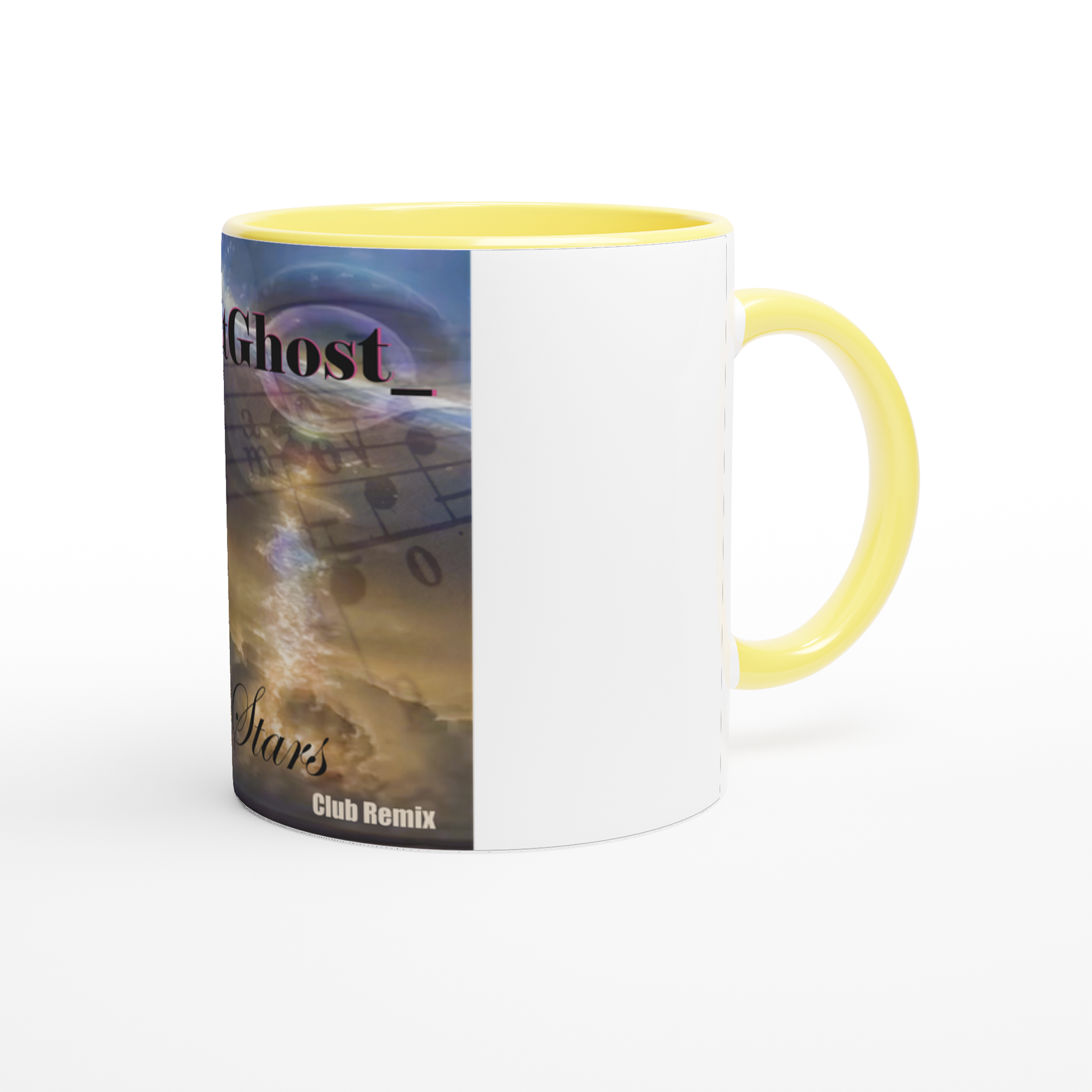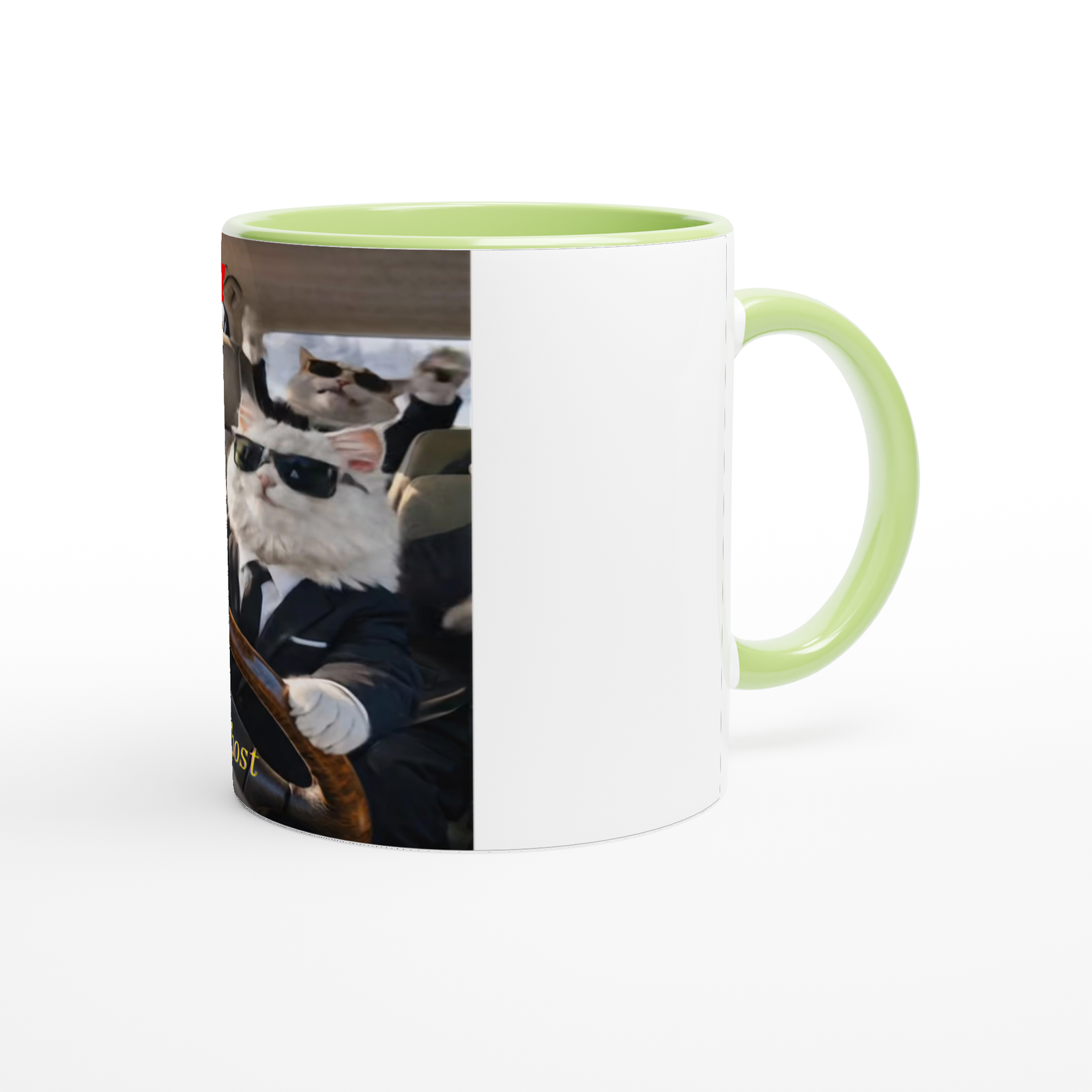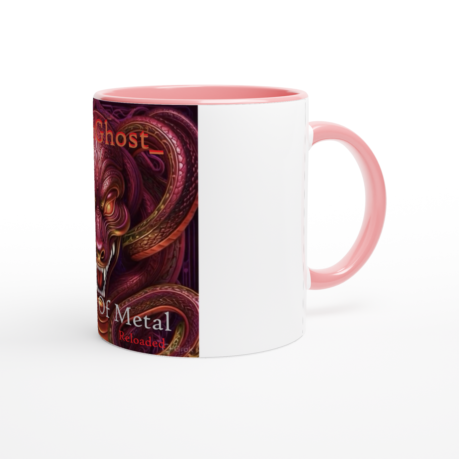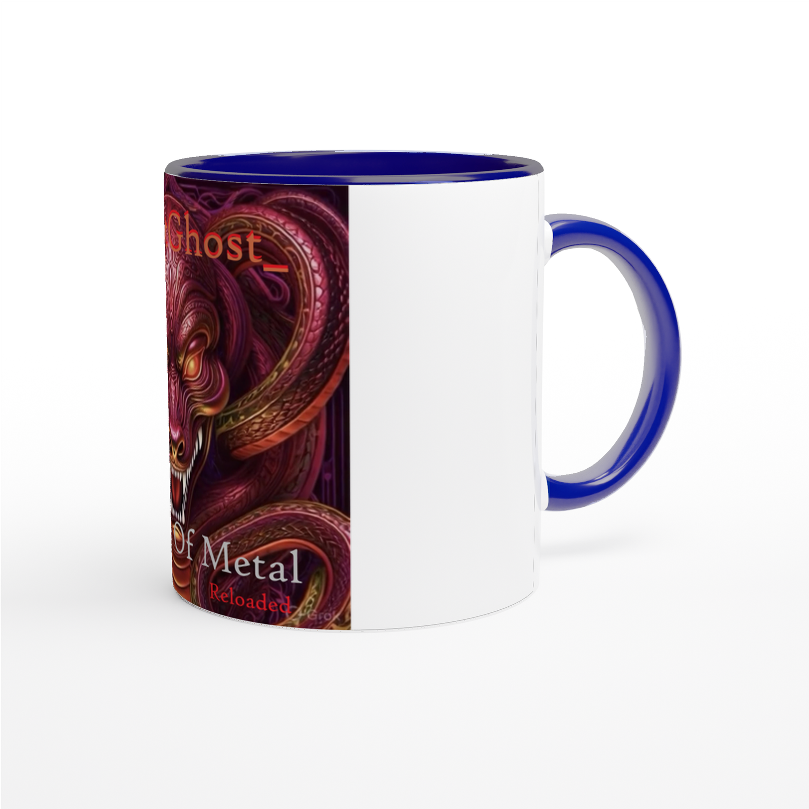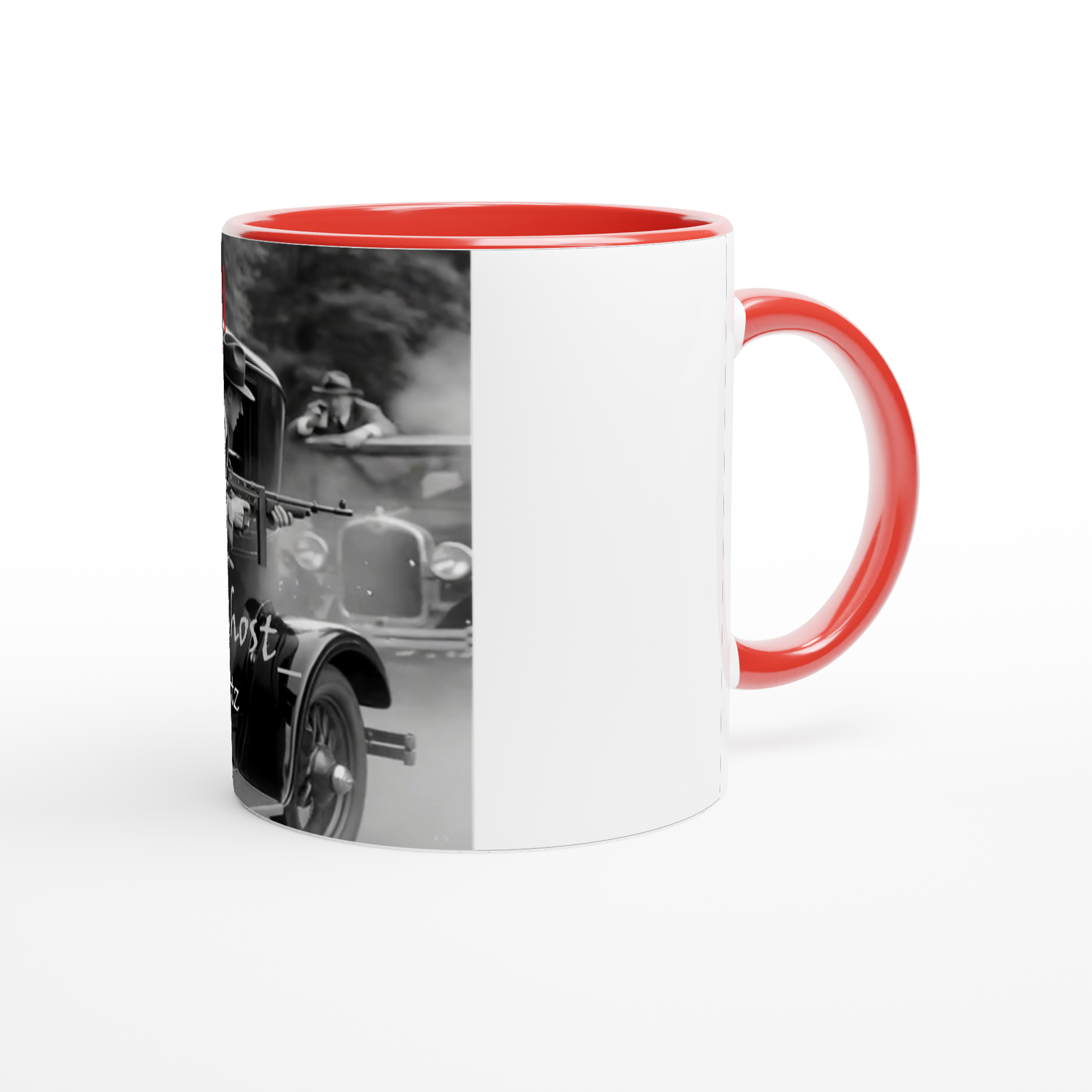 This mug is glossy white with a colored rim, inside, and handle. Microwave and dishwasher safe.