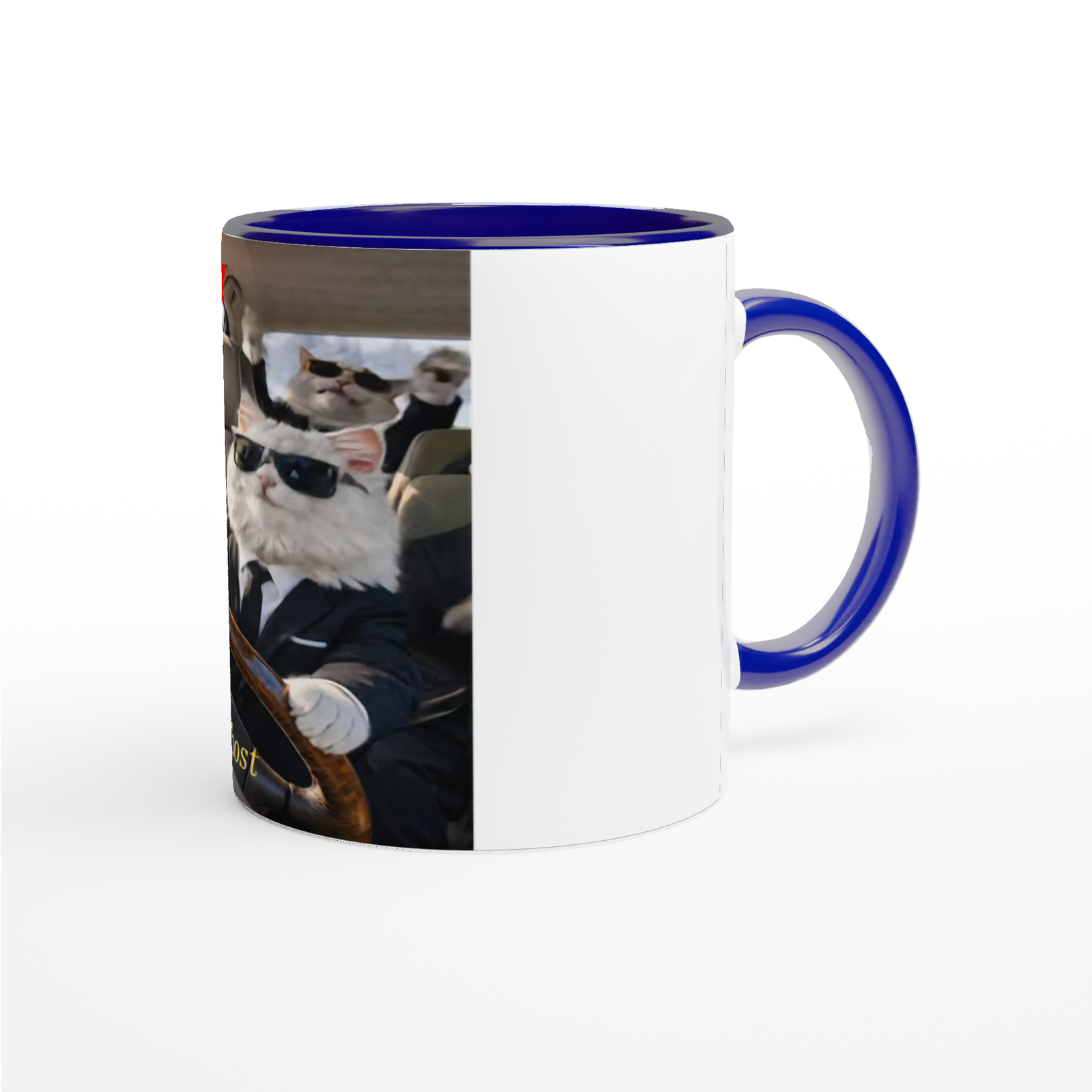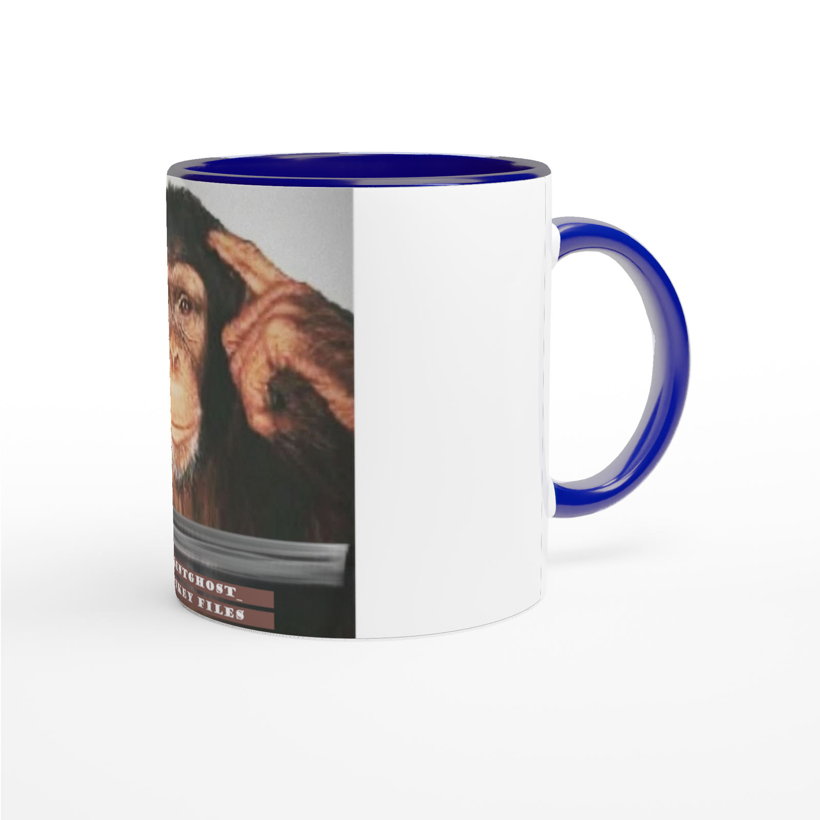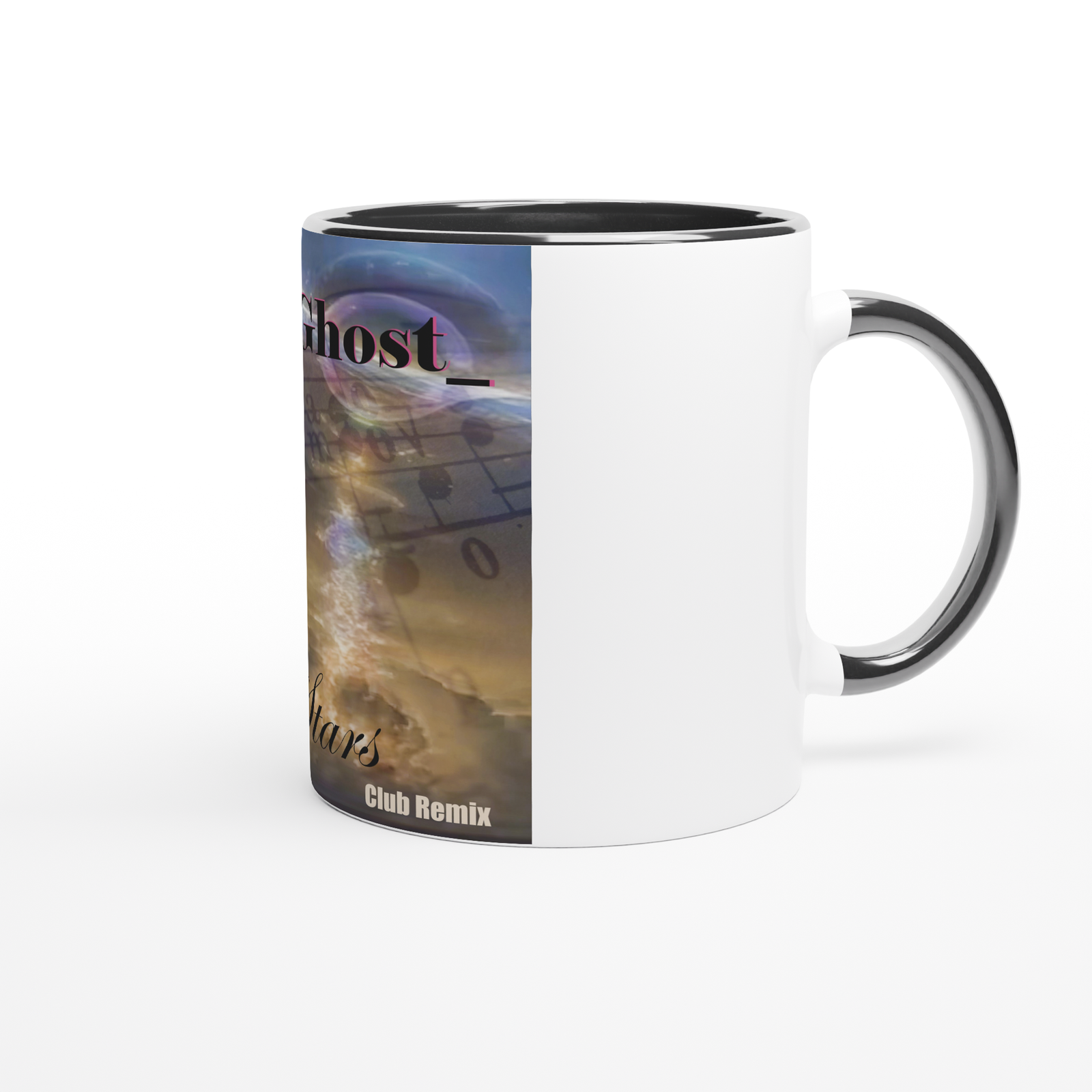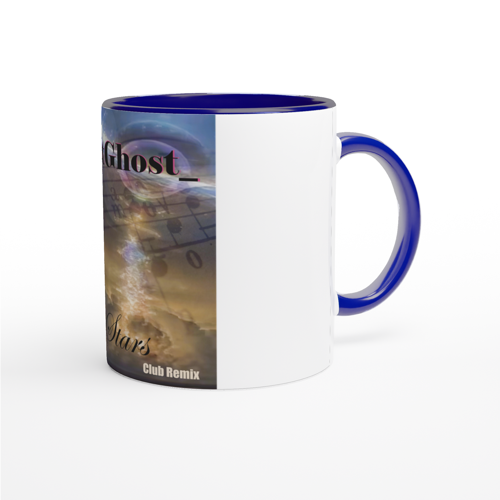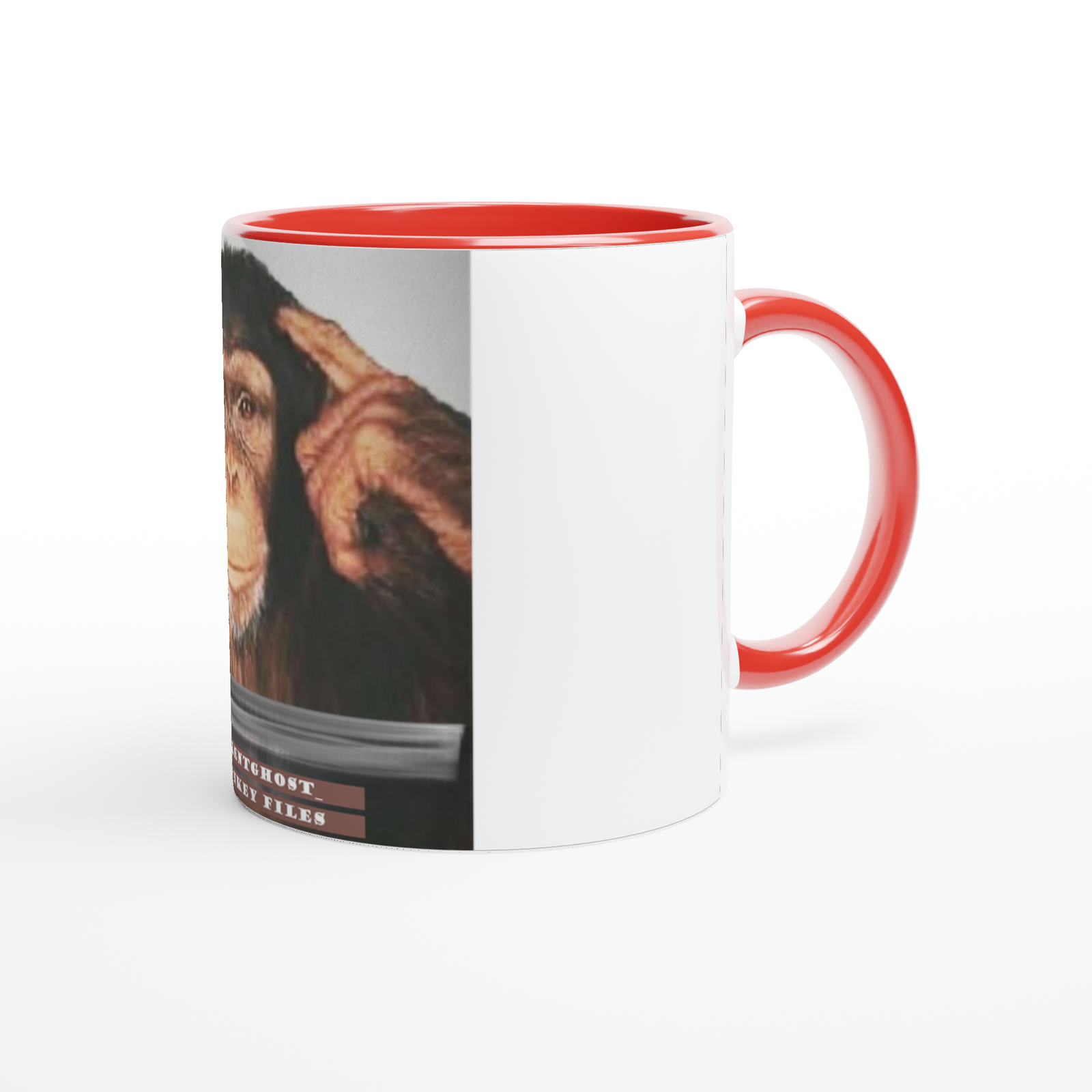 This mug is glossy white with a colored rim, inside, and handle. Microwave and dishwasher safe.