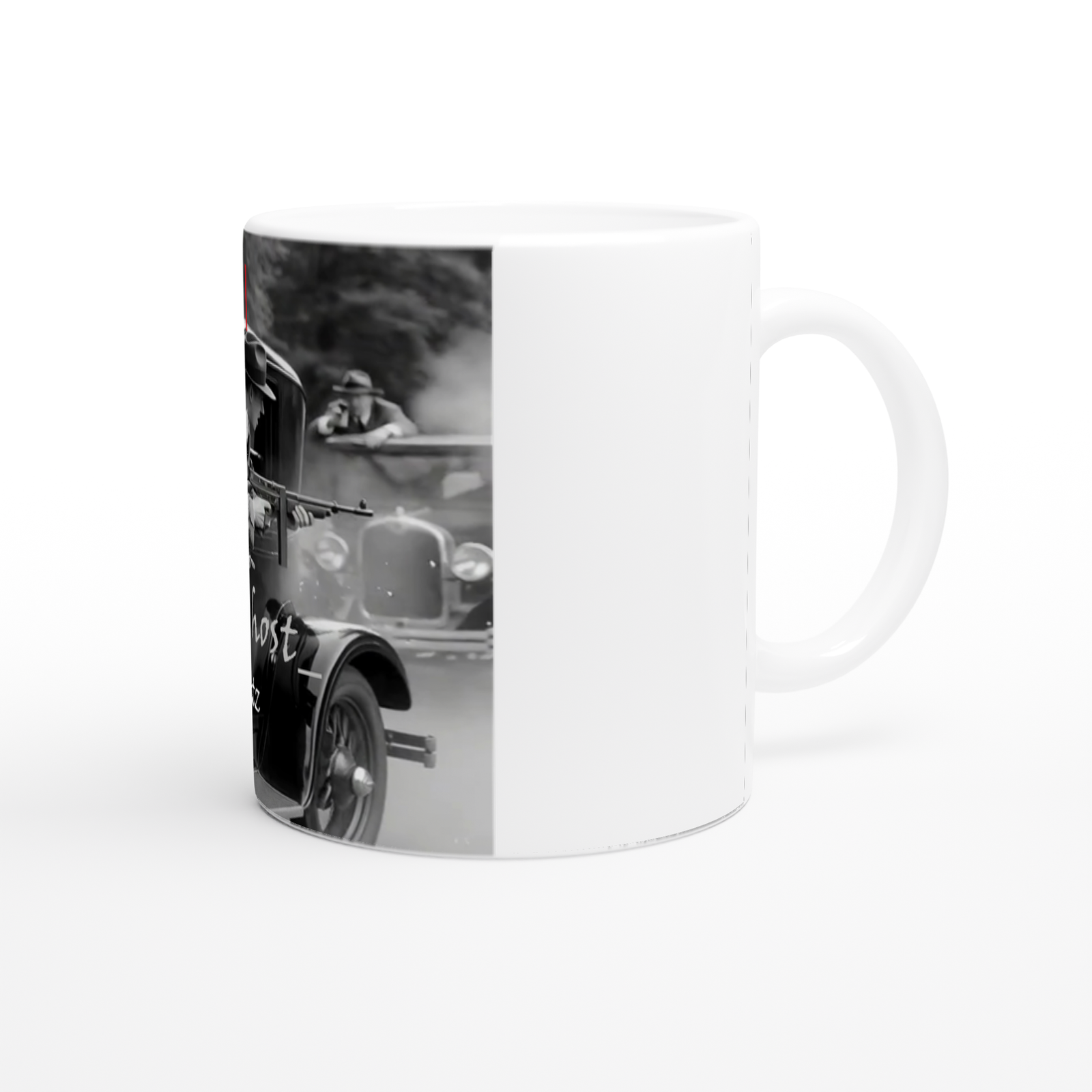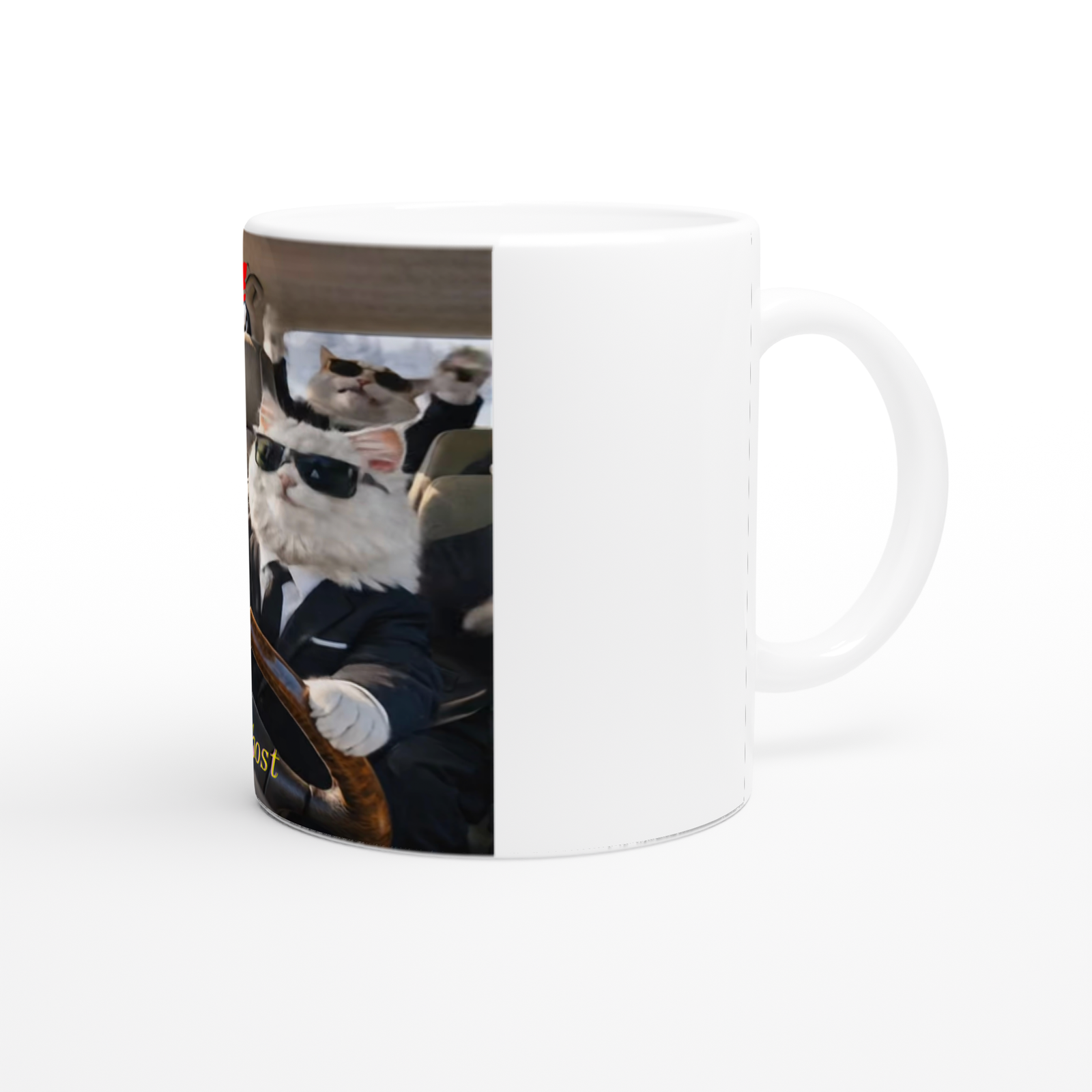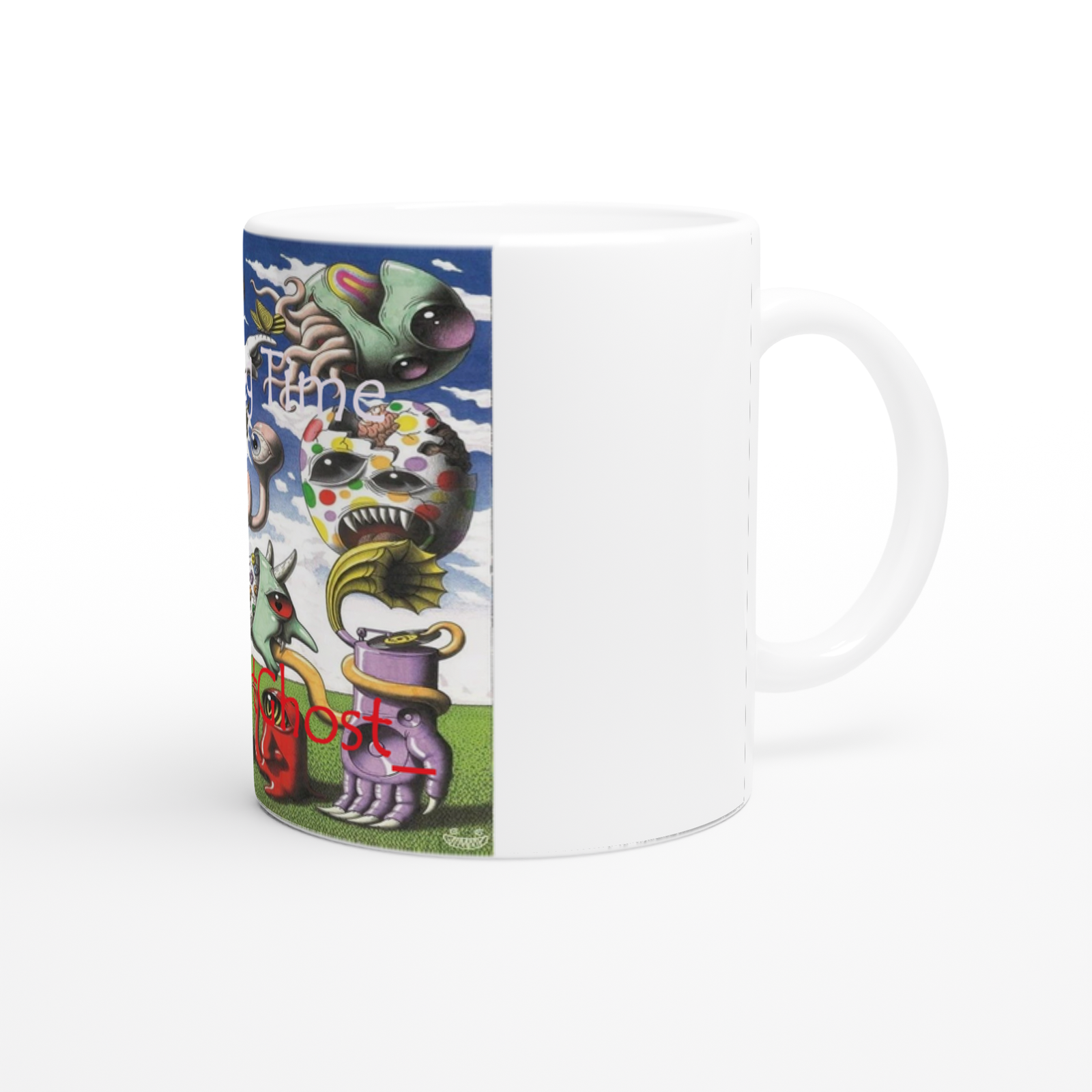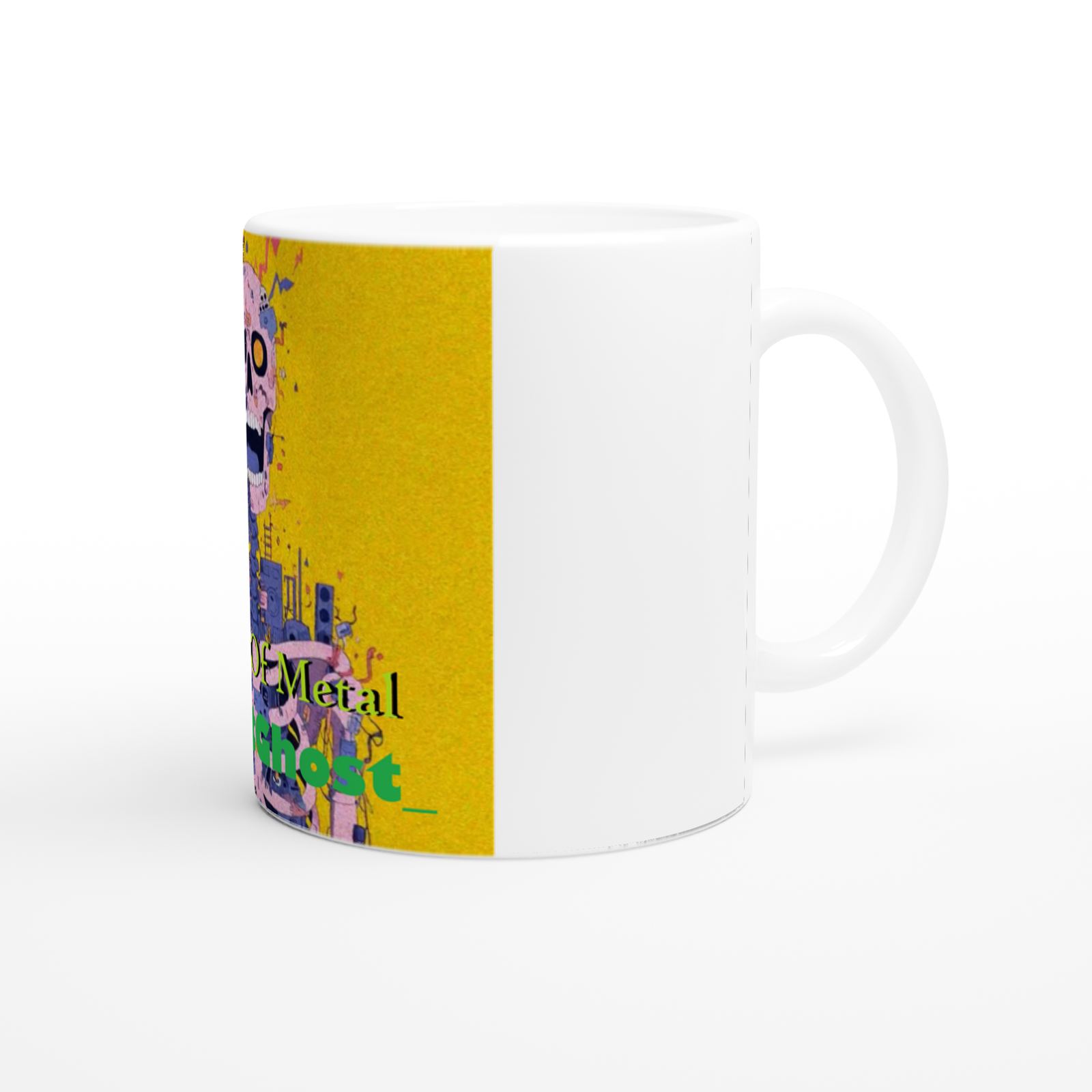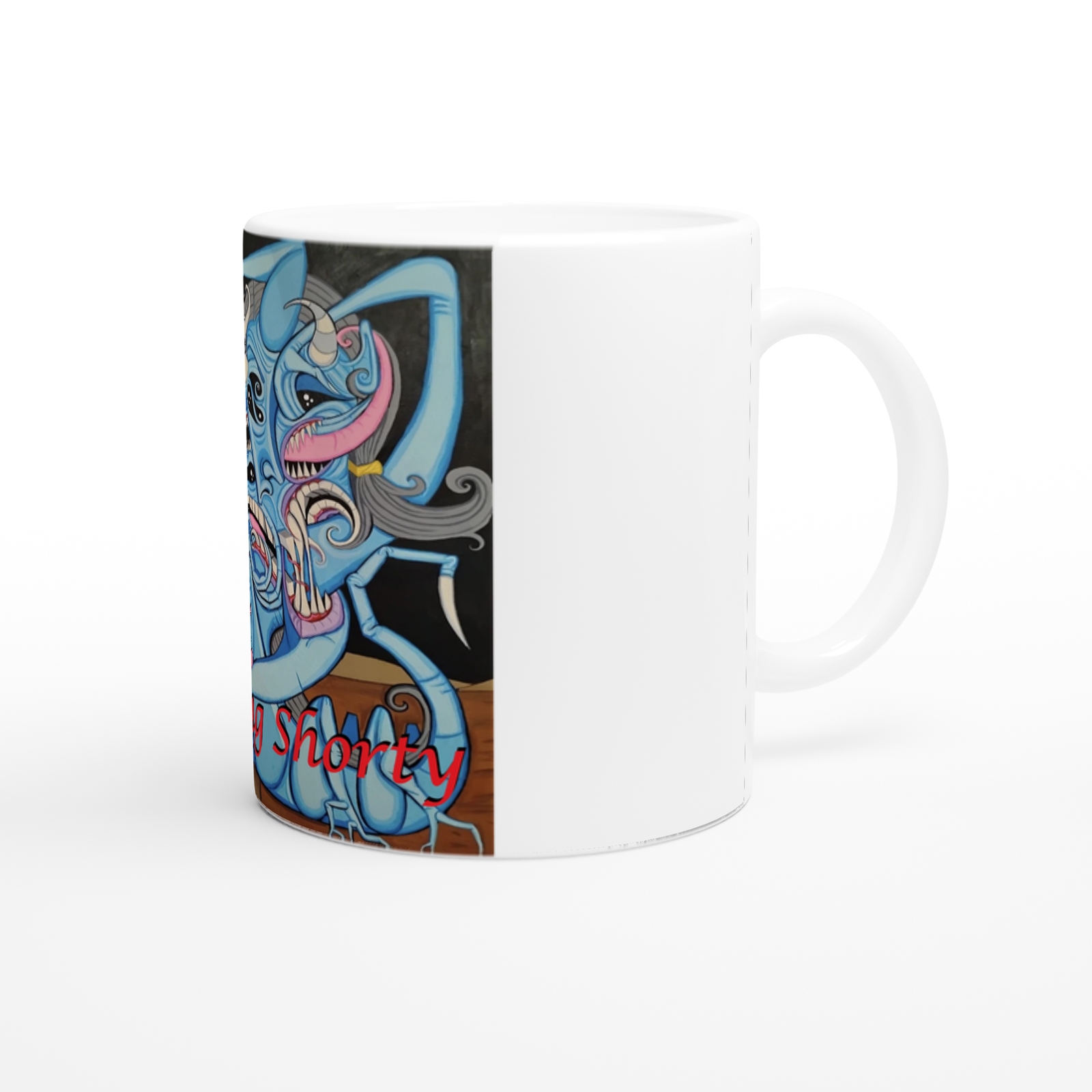 This mug is glossy white with a colored rim, inside, and handle. Microwave and dishwasher safe.