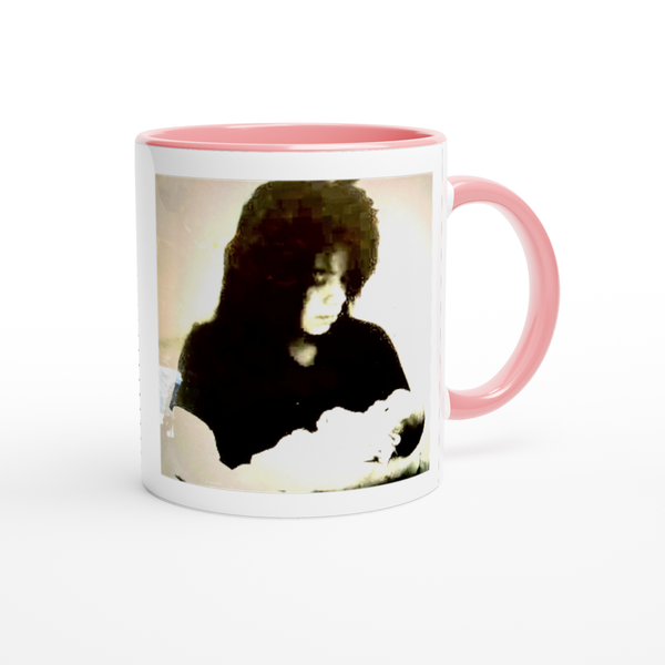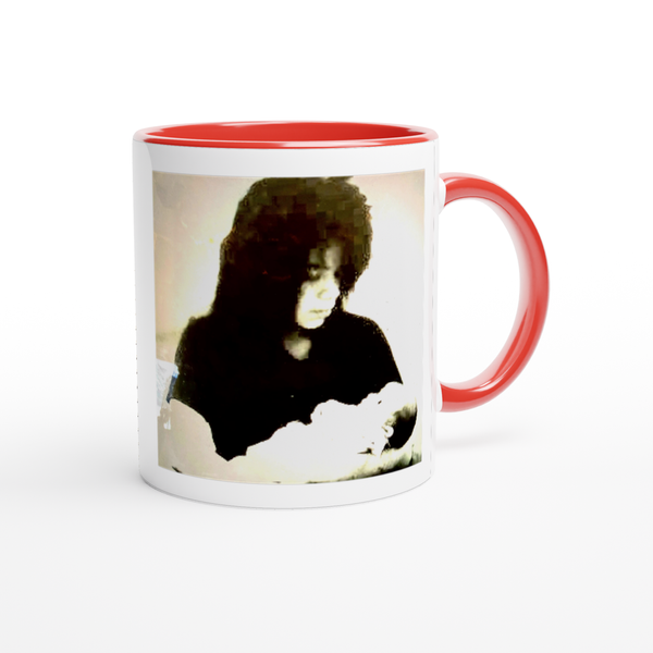 This mug is glossy white with a colored rim, inside, and handle. Microwave and dishwasher safe.