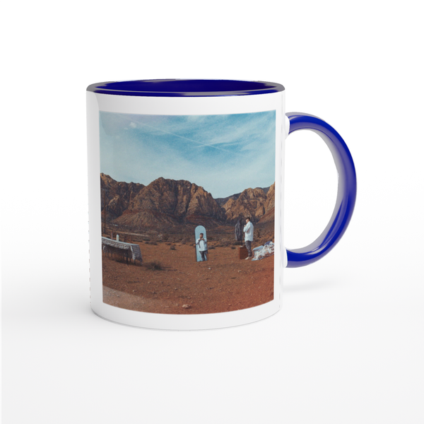 This mug is glossy white with a colored rim, inside, and handle. Microwave and dishwasher safe.