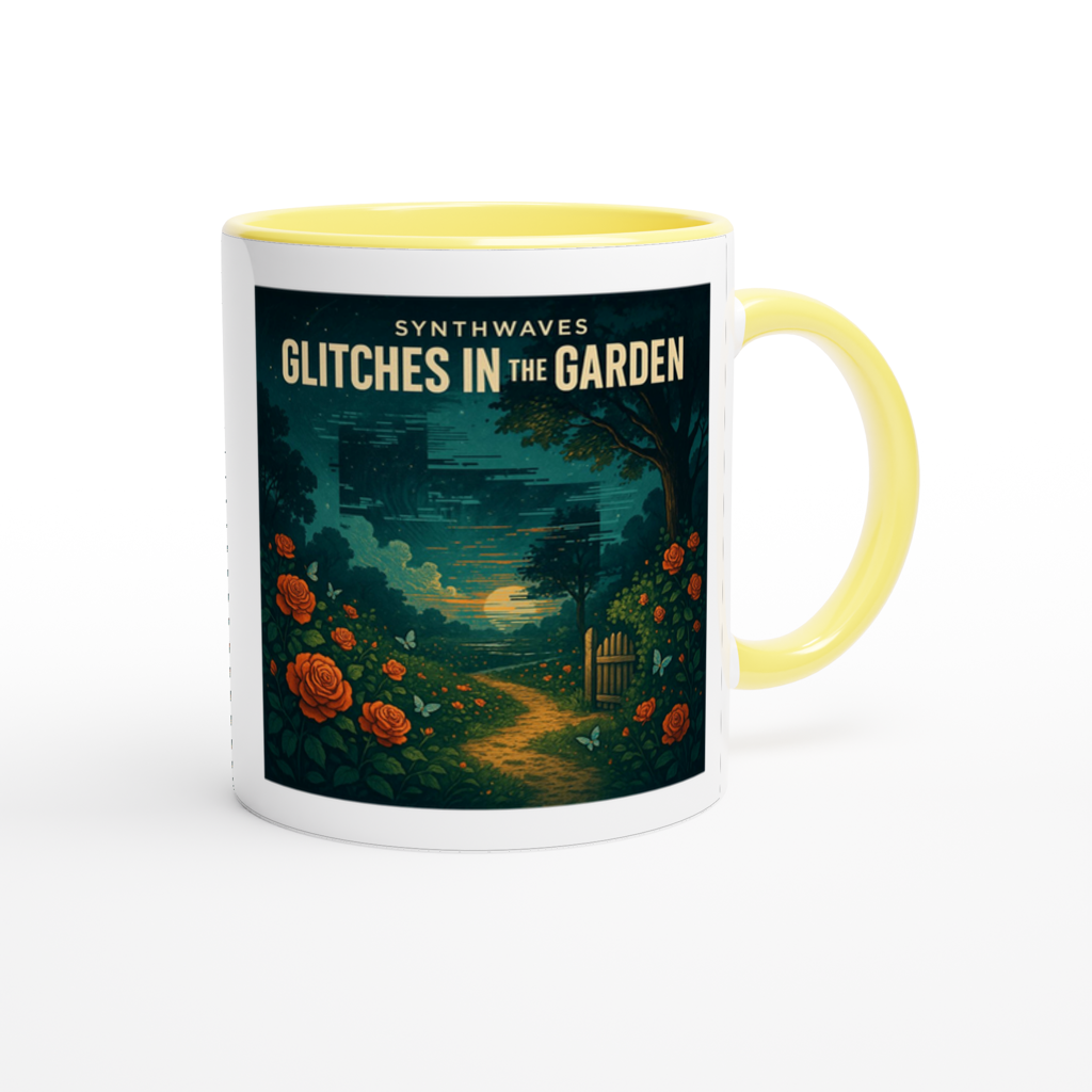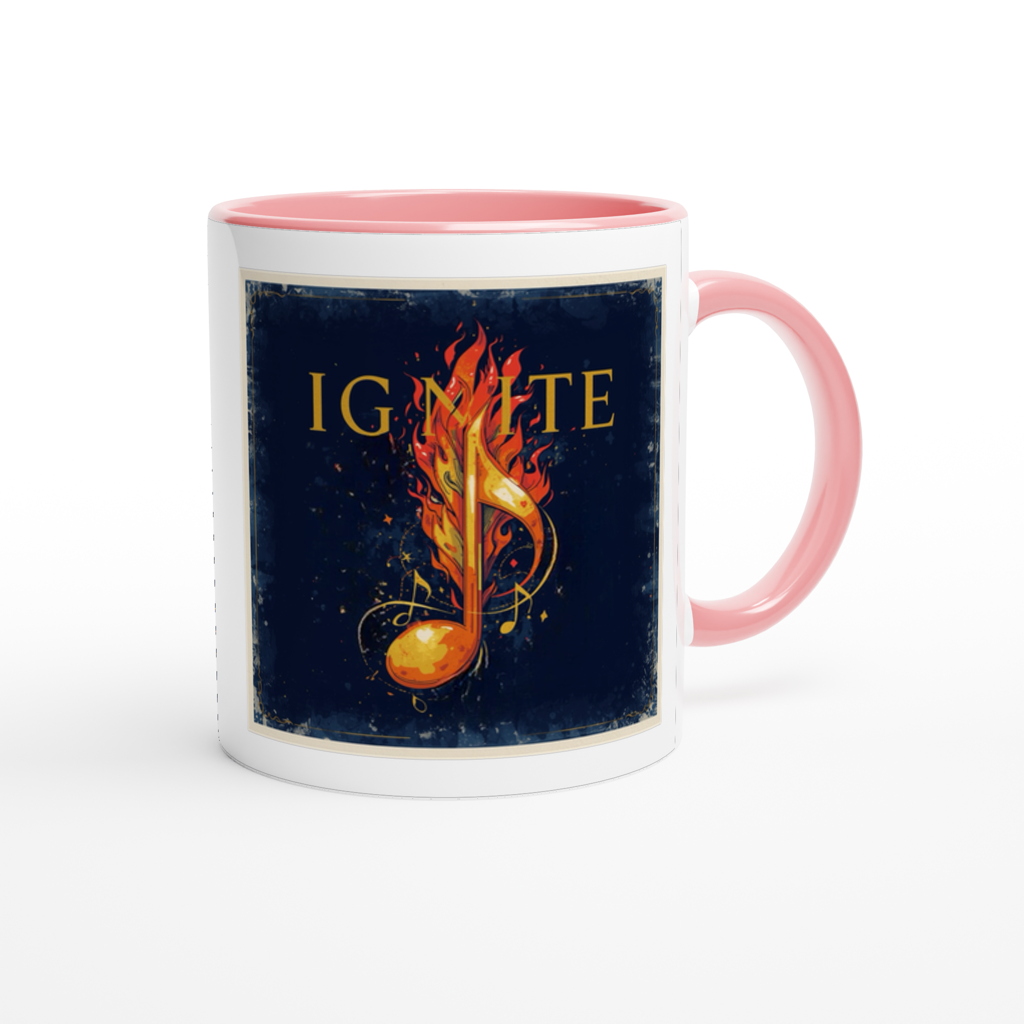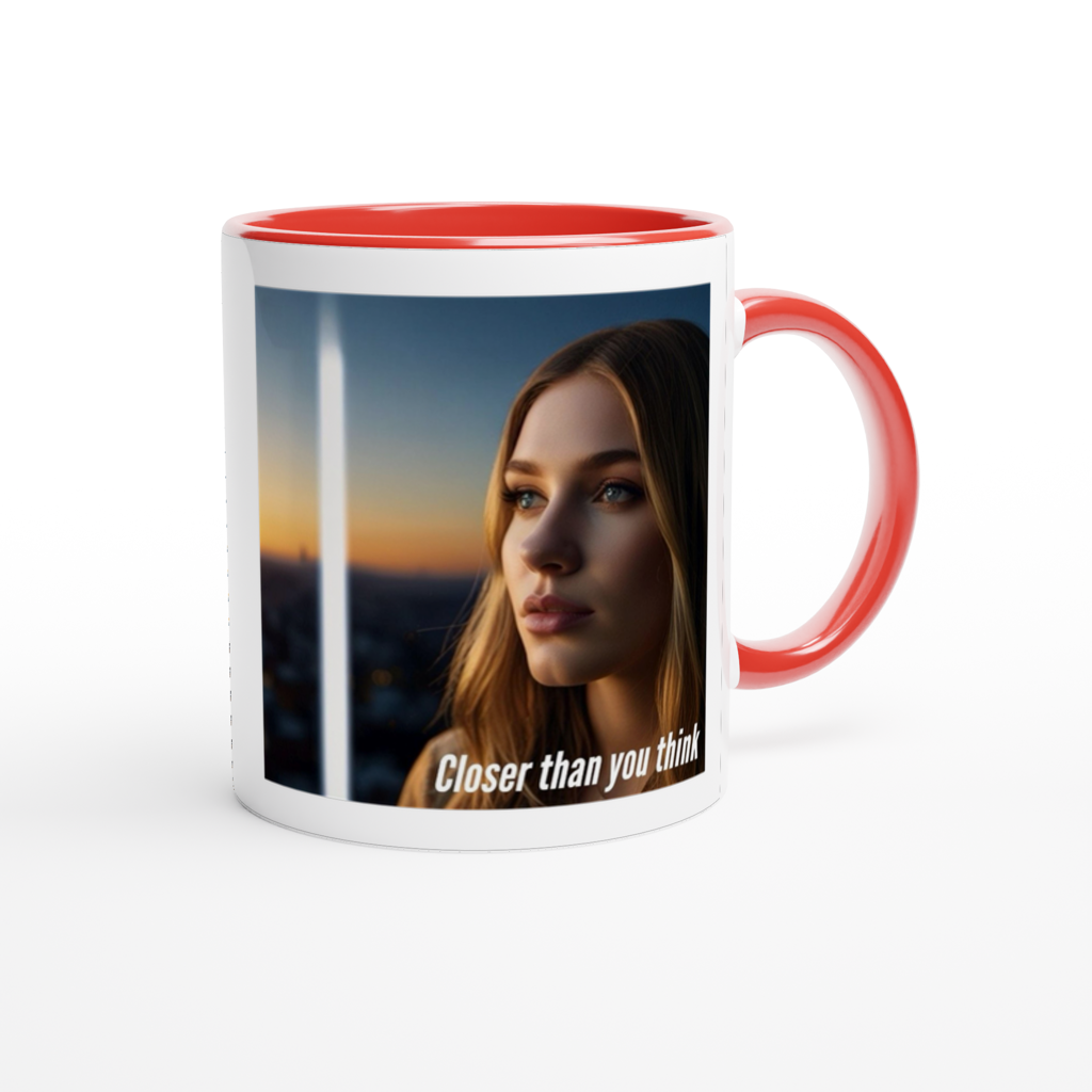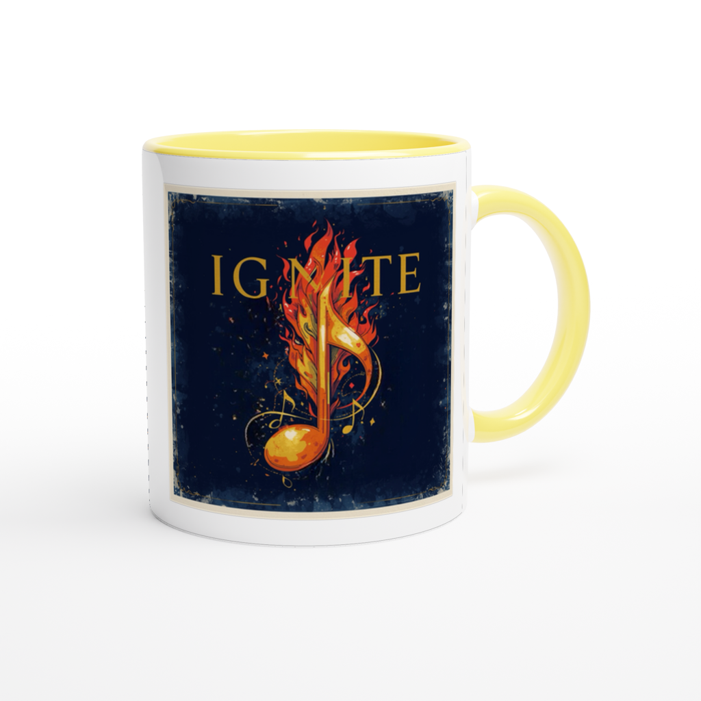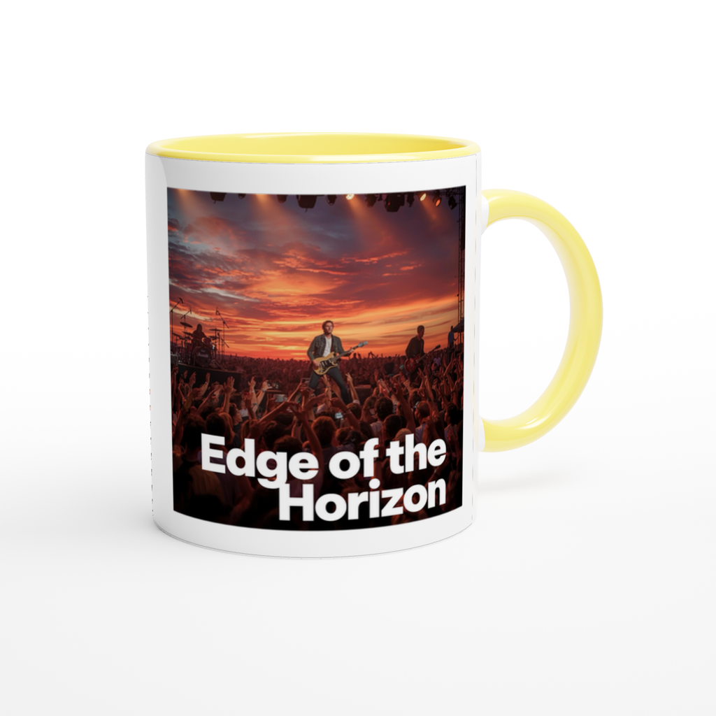 This mug is glossy white with a colored rim, inside, and handle. Microwave and dishwasher safe.