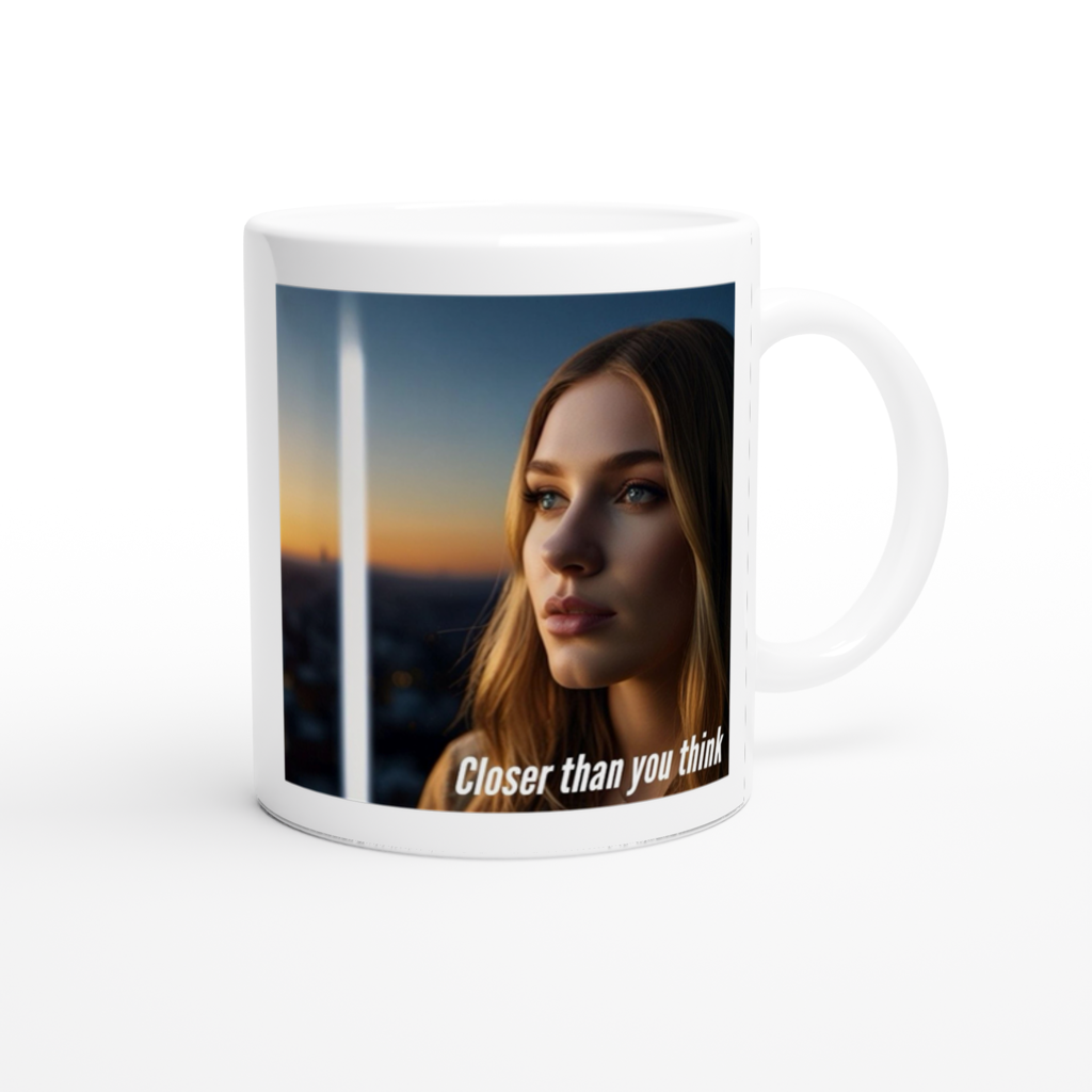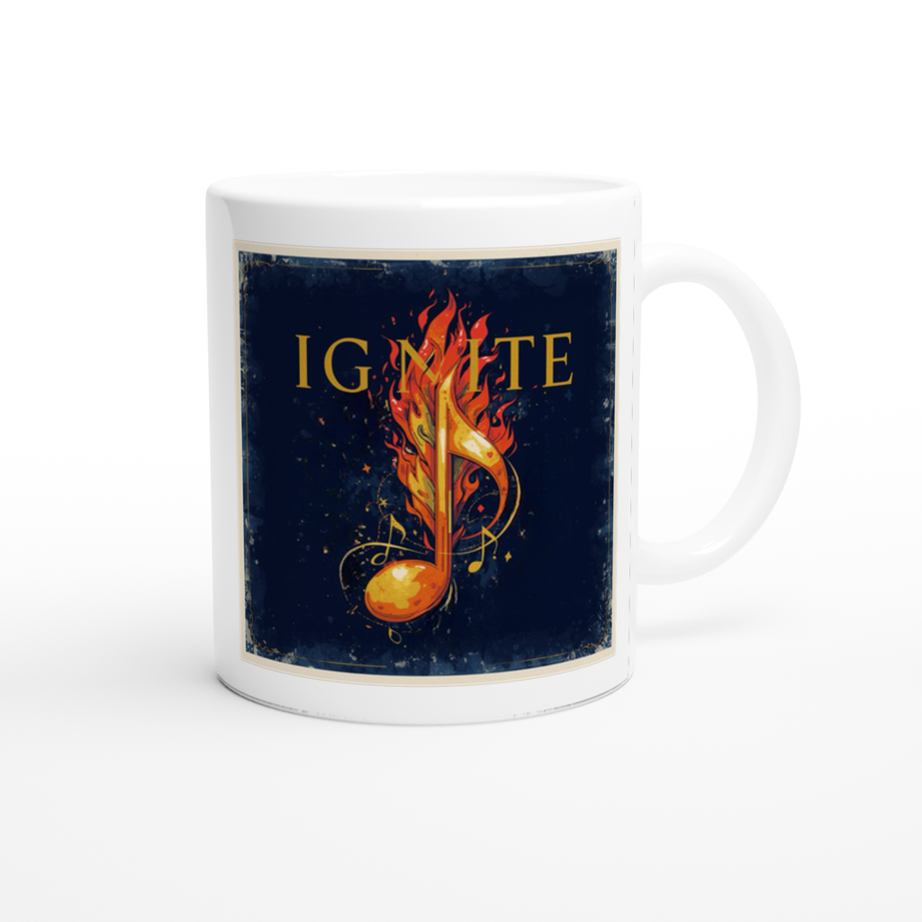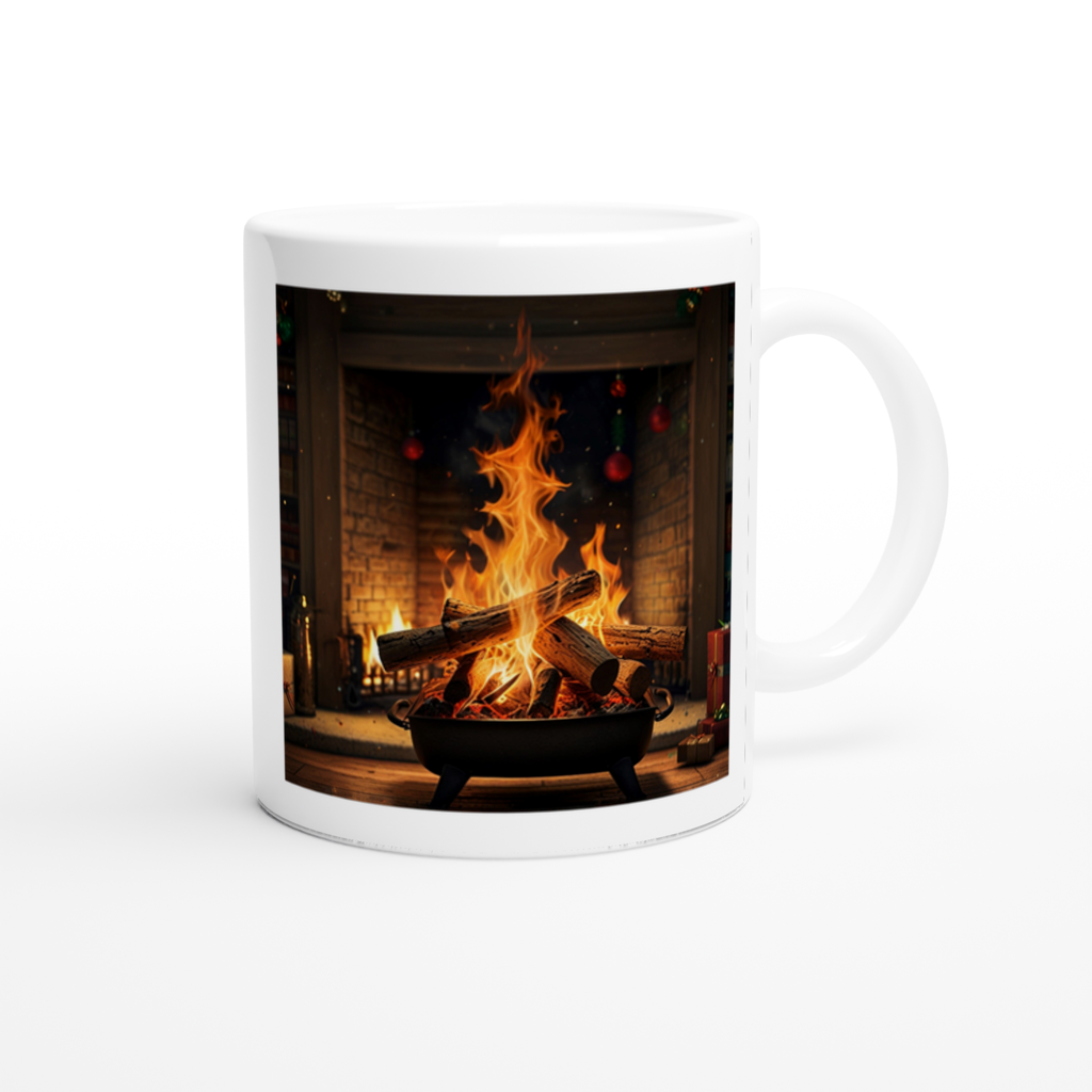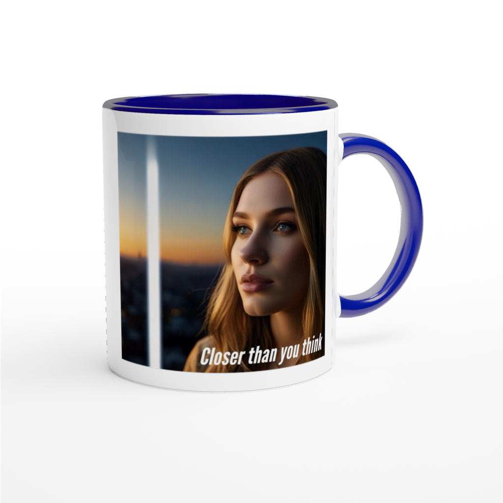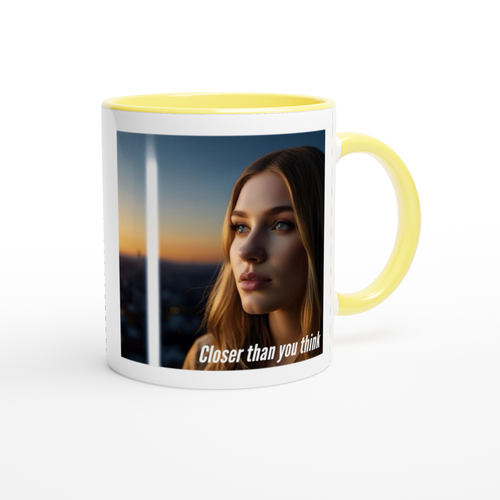This mug is glossy white with a colored rim, inside, and handle. Microwave and dishwasher safe.