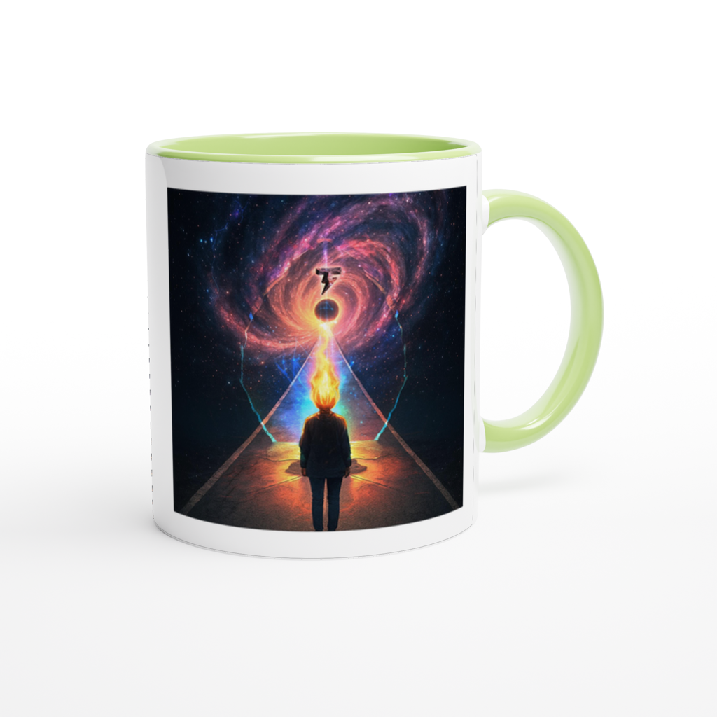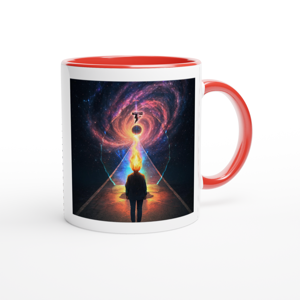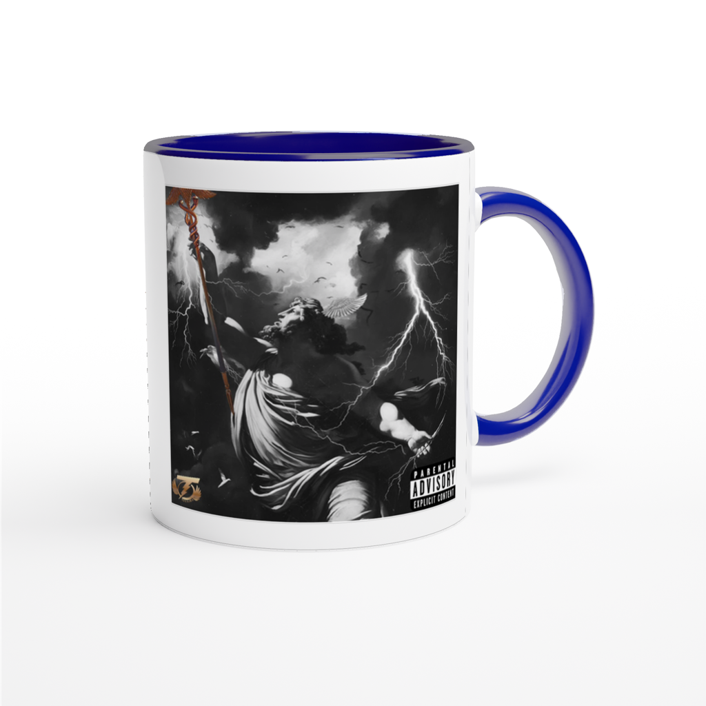 This mug is glossy white with a colored rim, inside, and handle. Microwave and dishwasher safe.