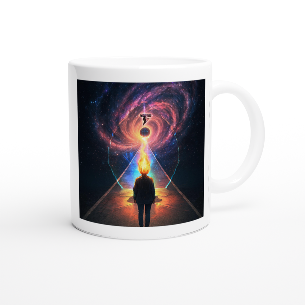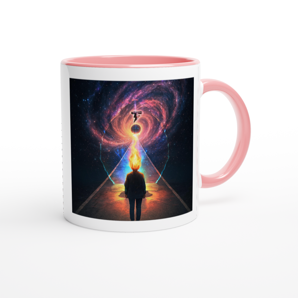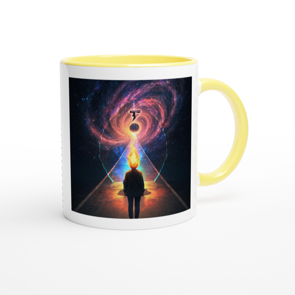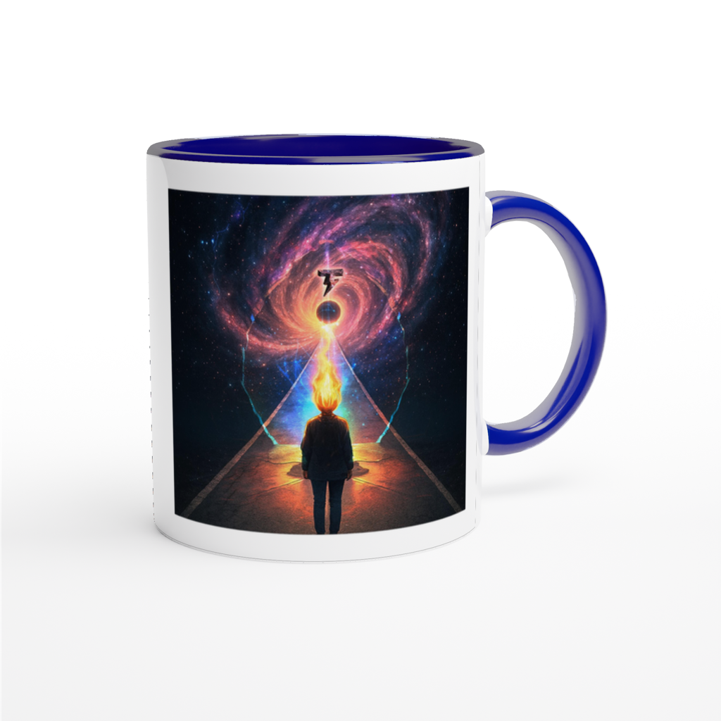 This mug is glossy white with a colored rim, inside, and handle. Microwave and dishwasher safe.