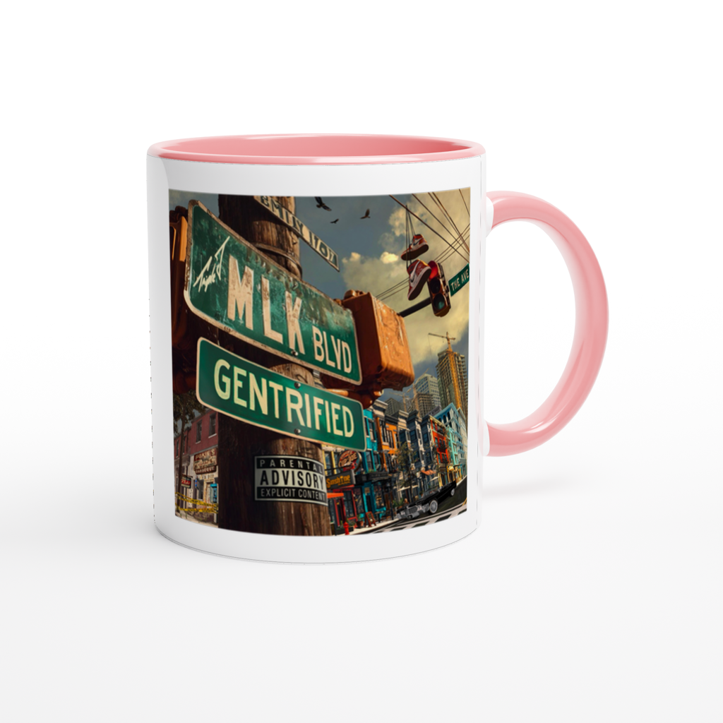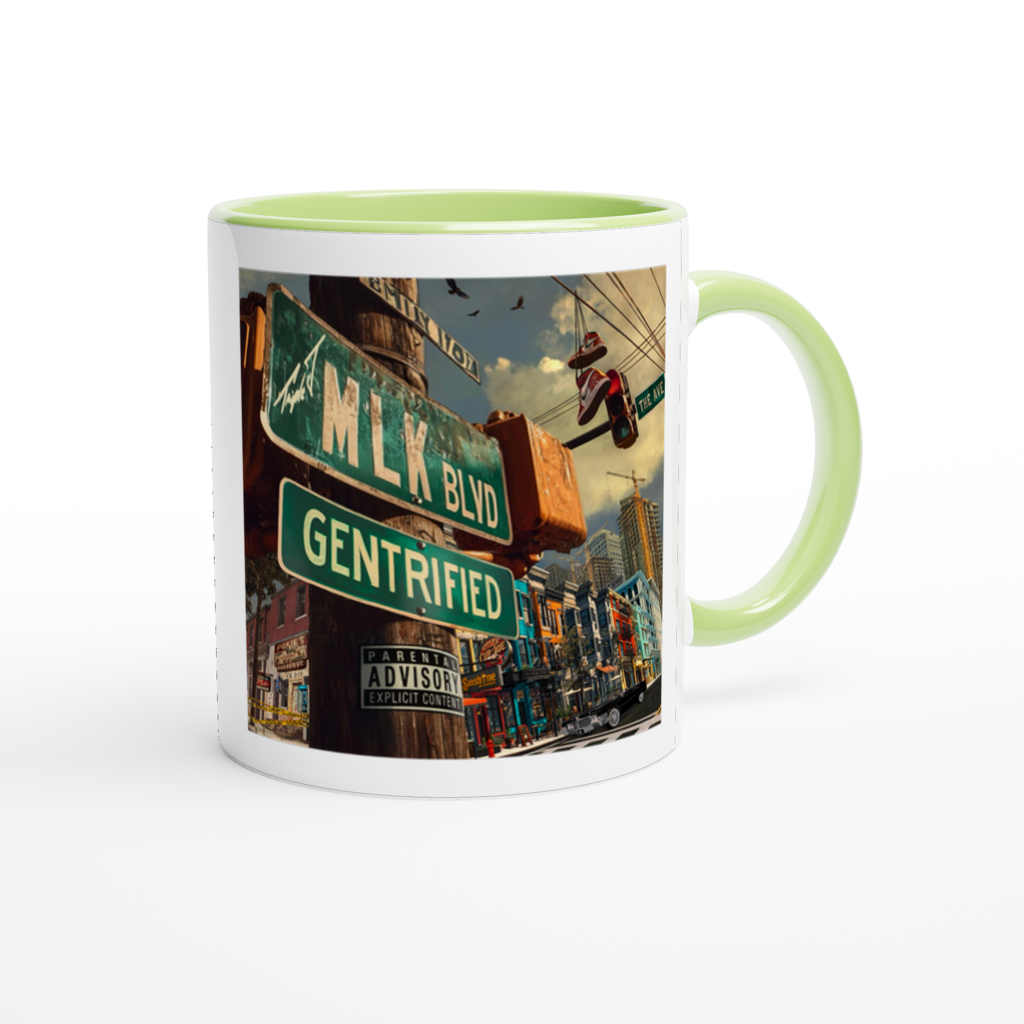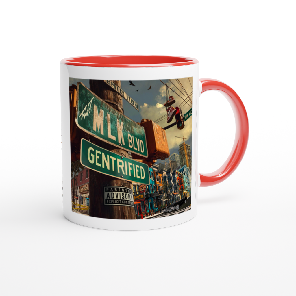 This mug is glossy white with a colored rim, inside, and handle. Microwave and dishwasher safe.