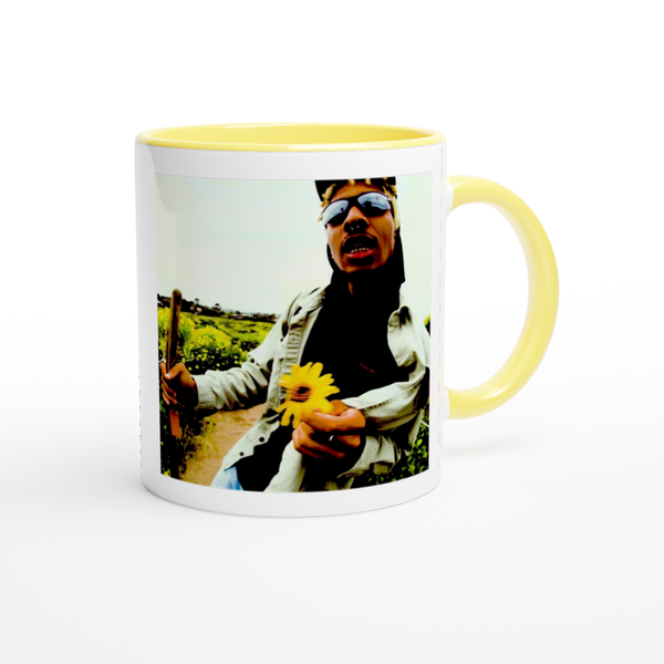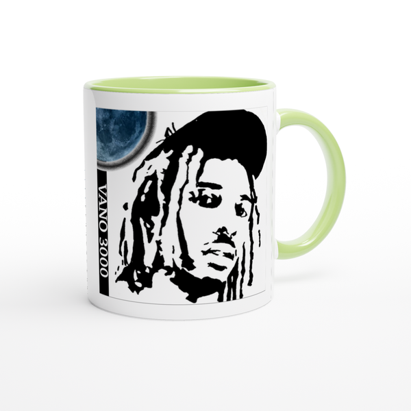 This mug is glossy white with a colored rim, inside, and handle. Microwave and dishwasher safe.